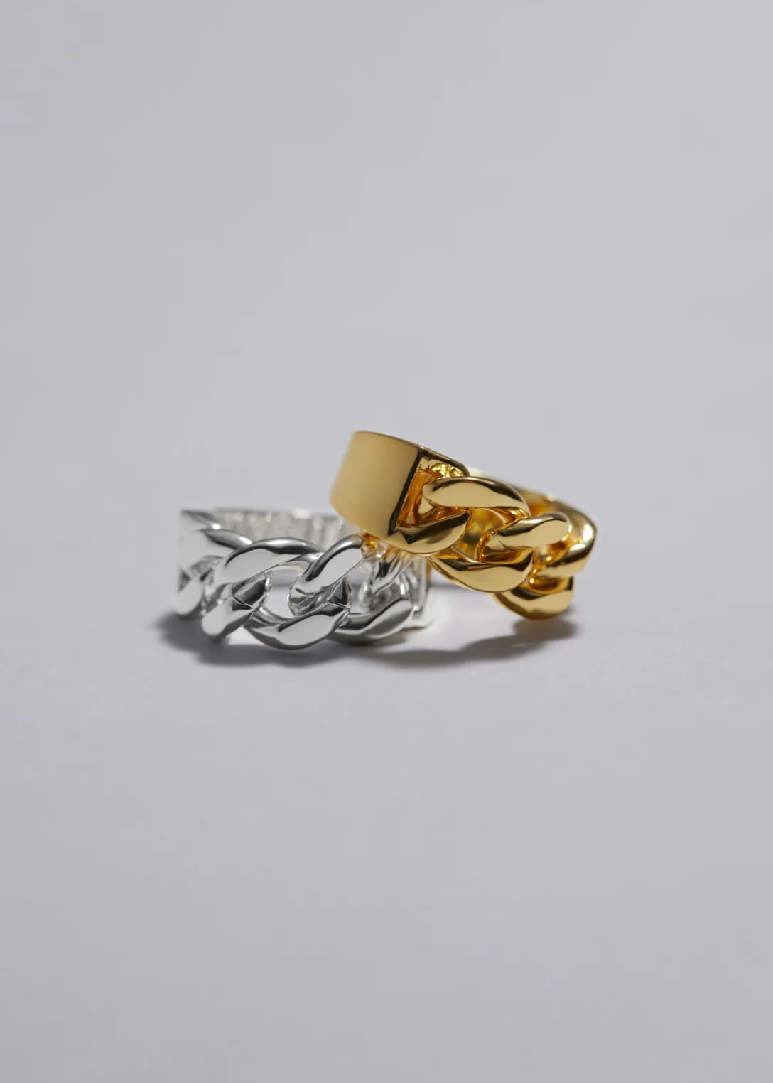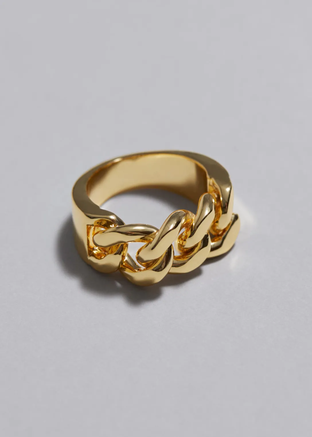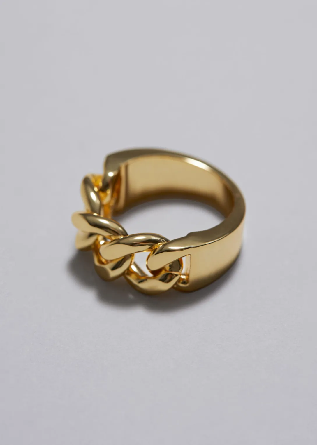 Sculptée dans un motif de chaîne, cette bague épaisse est fabriquée en laiton poli pour une grande brillance.
