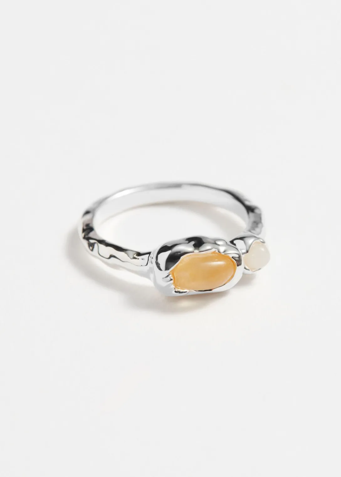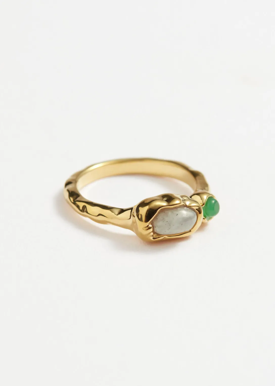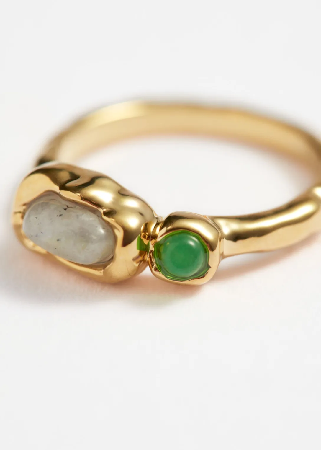 Cette bague en laiton poli présente une forme organique avec des pierres taillées avec précision, qui brilleront de mille feux à la lumière.