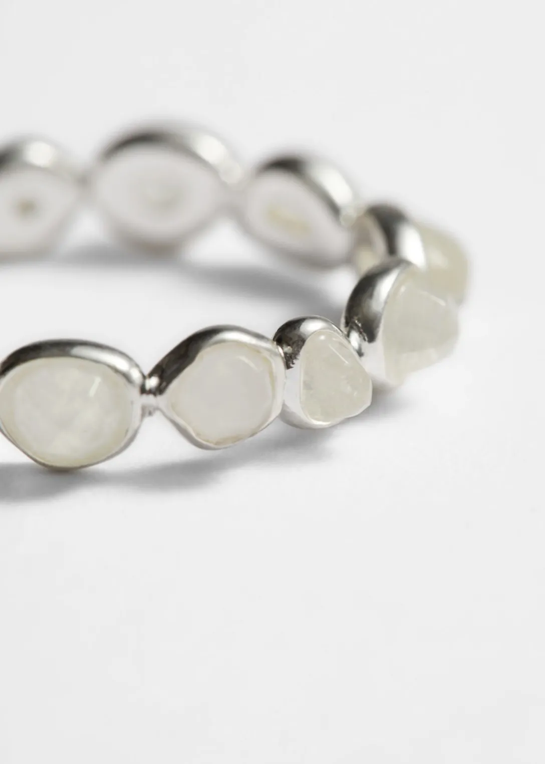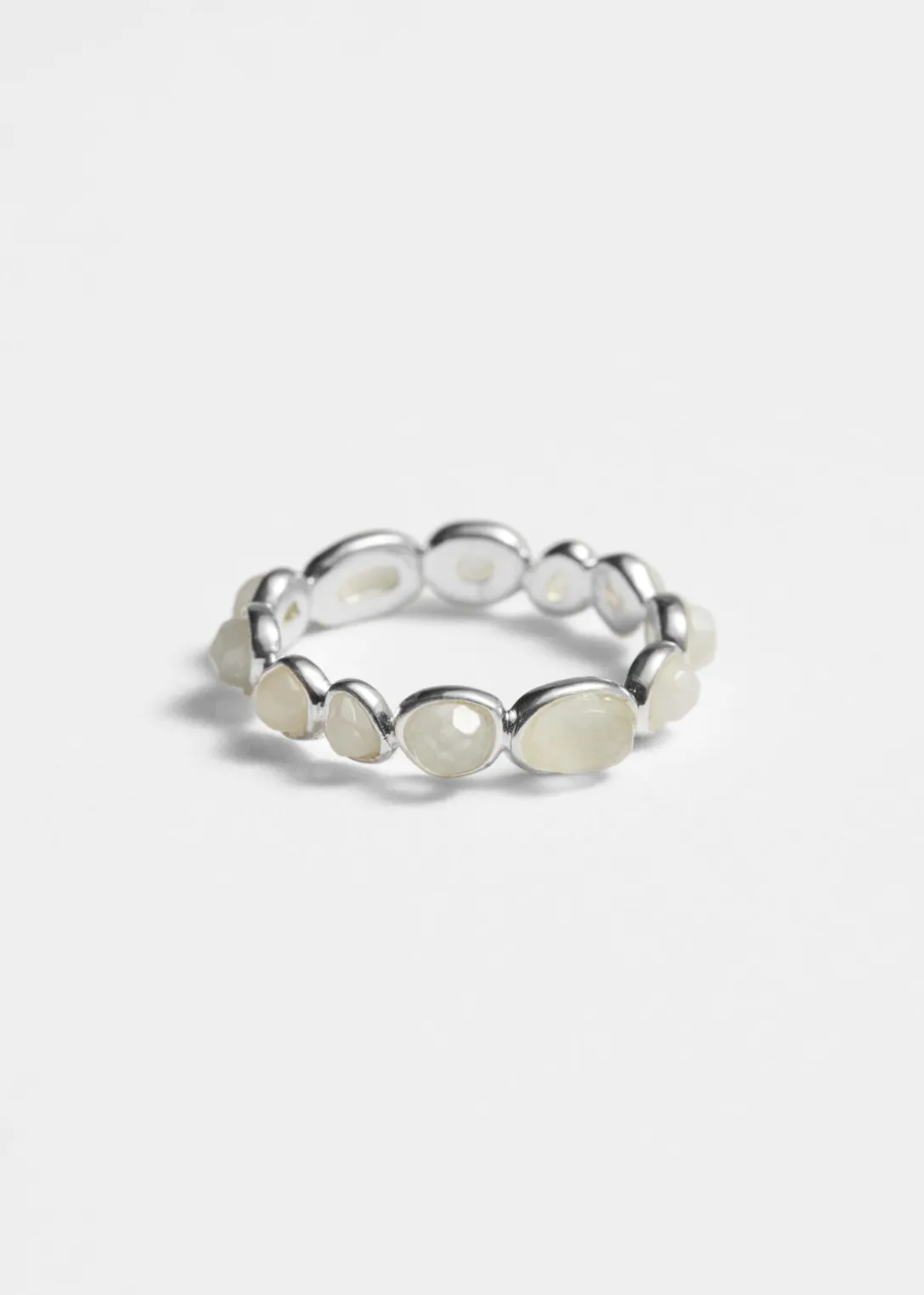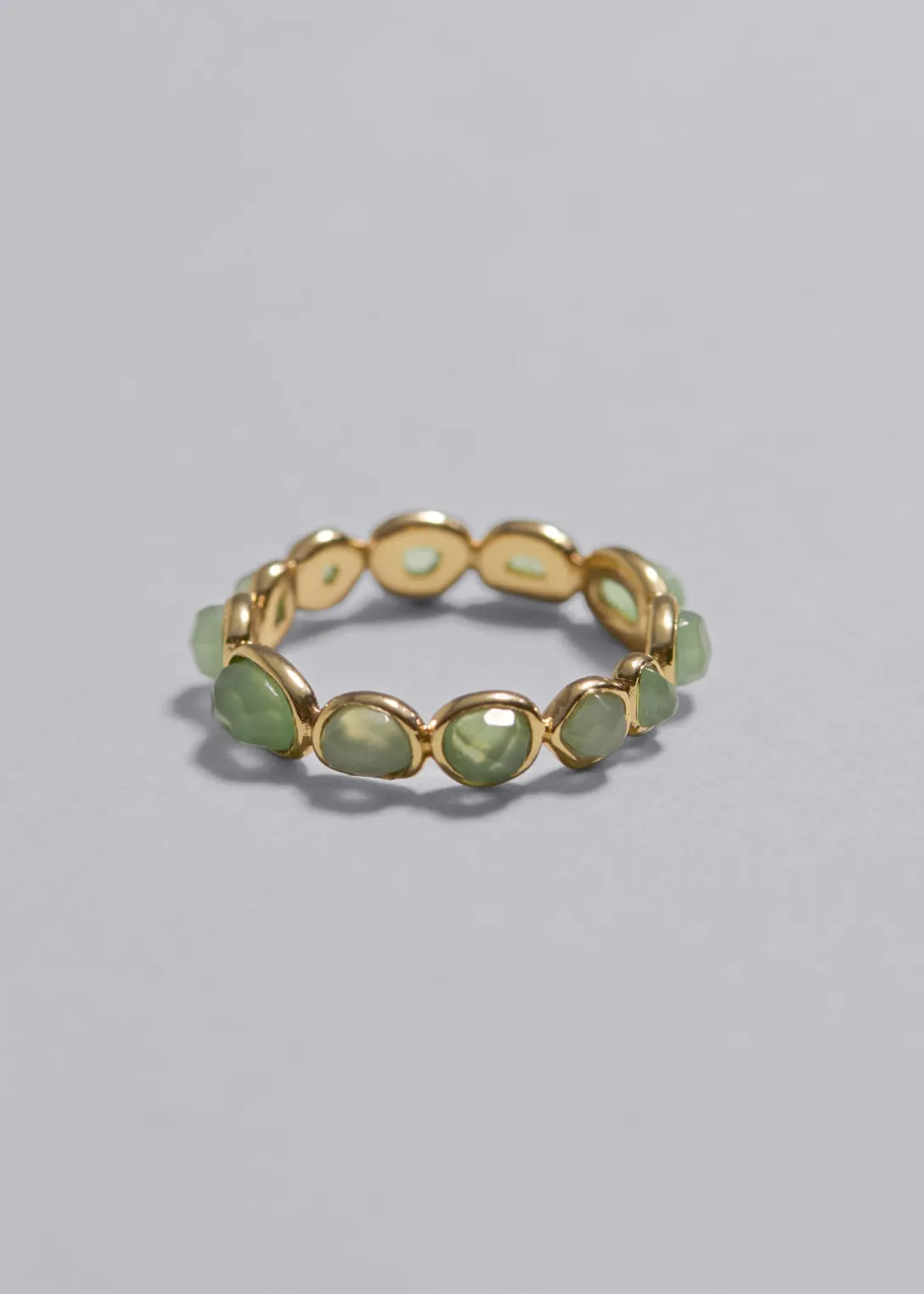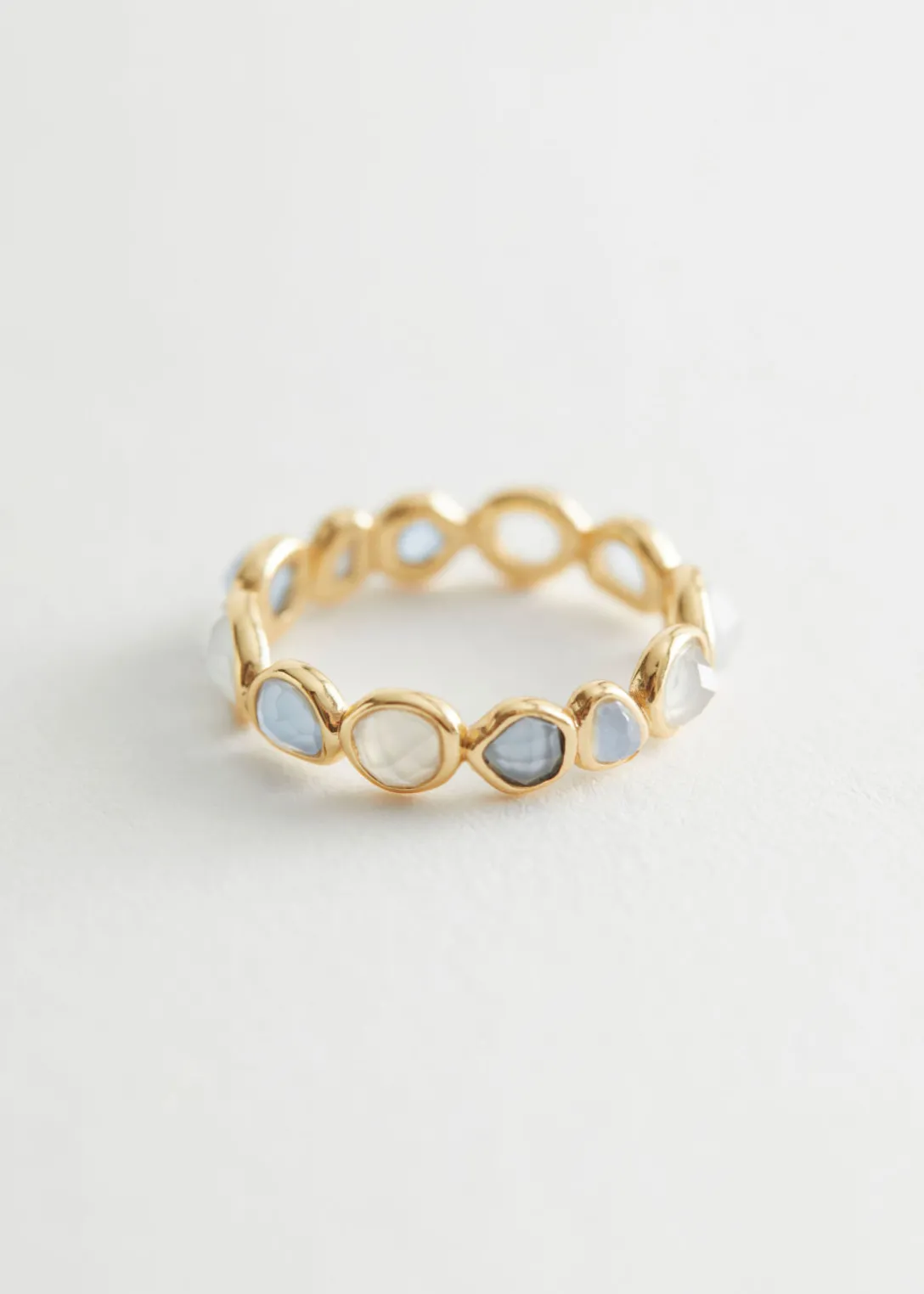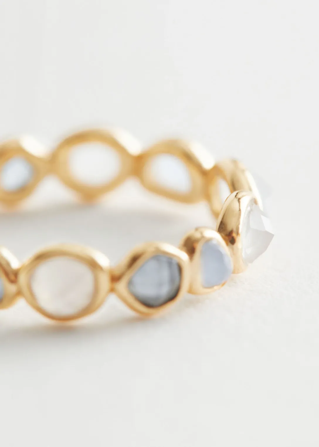 Bague ornée de pierres en verre de diverses formes organiques enchâssées dans une monture dorée.