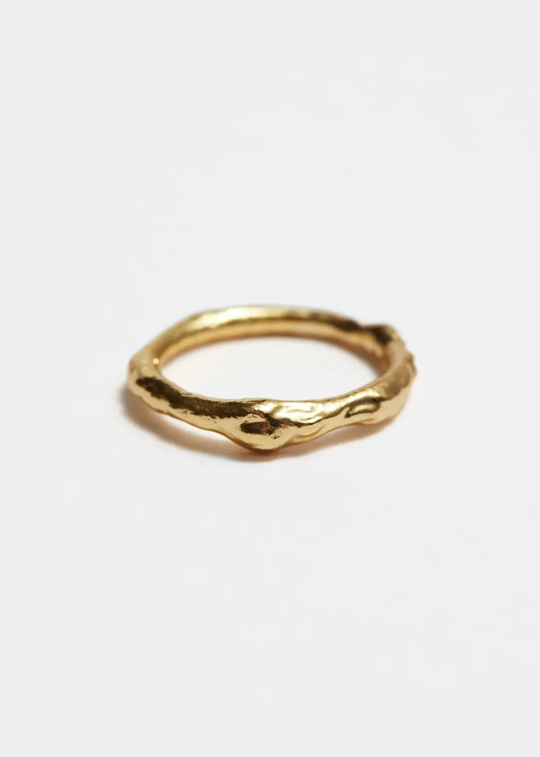 Cette bague à la finition martelée est confectionnée en laiton poli pour une grande brillance.