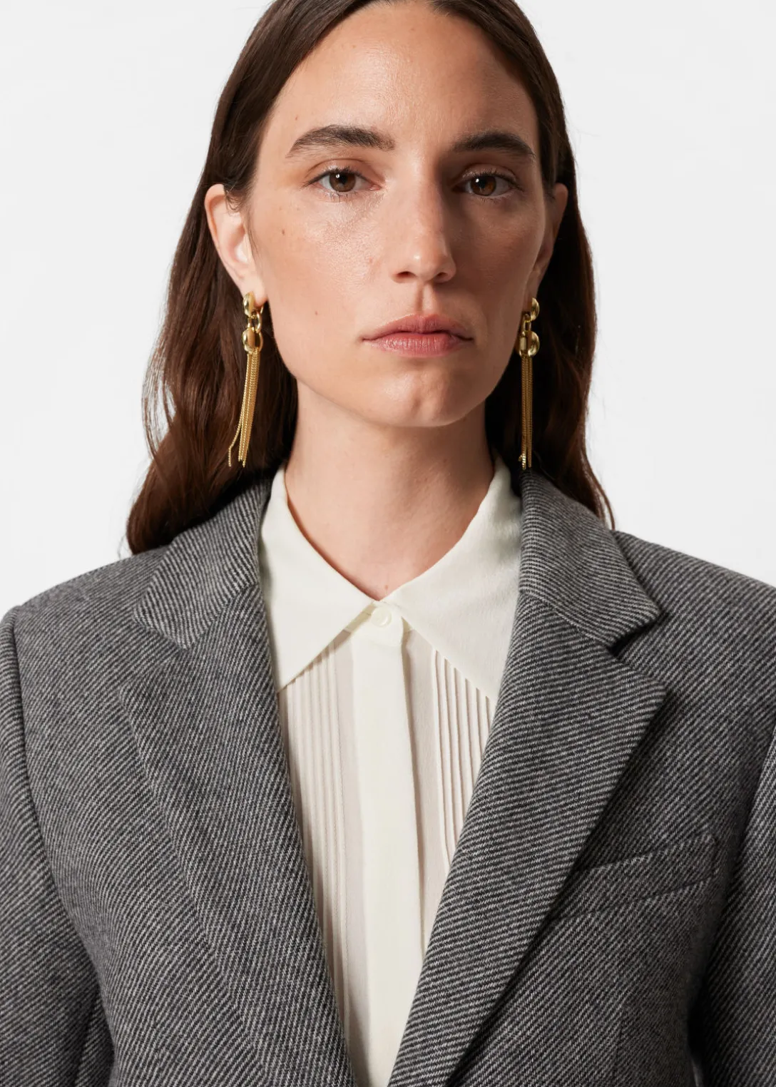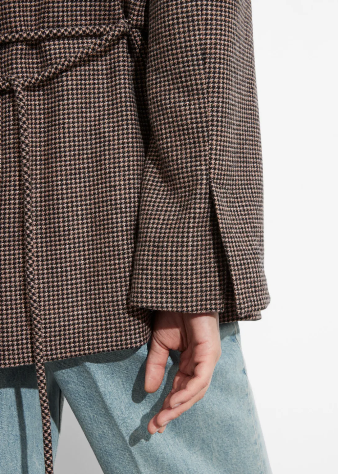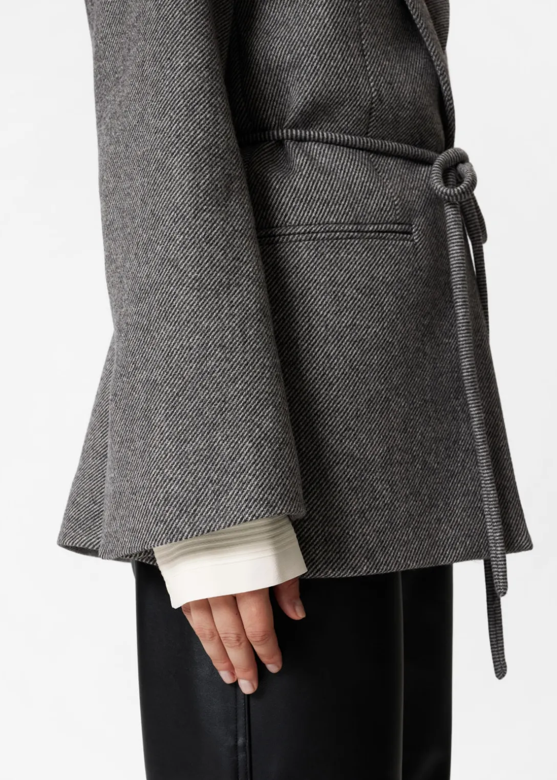 Blazer en laine mélangée à boutonnage simple. Doté d’une ceinture fine.