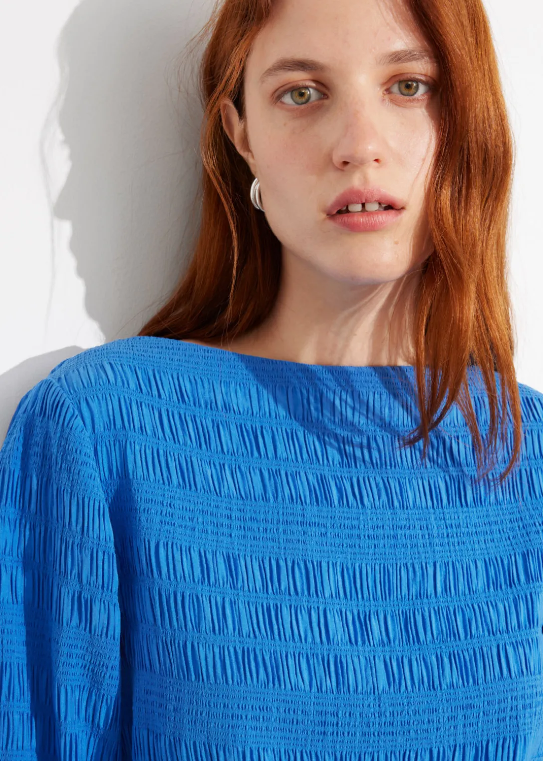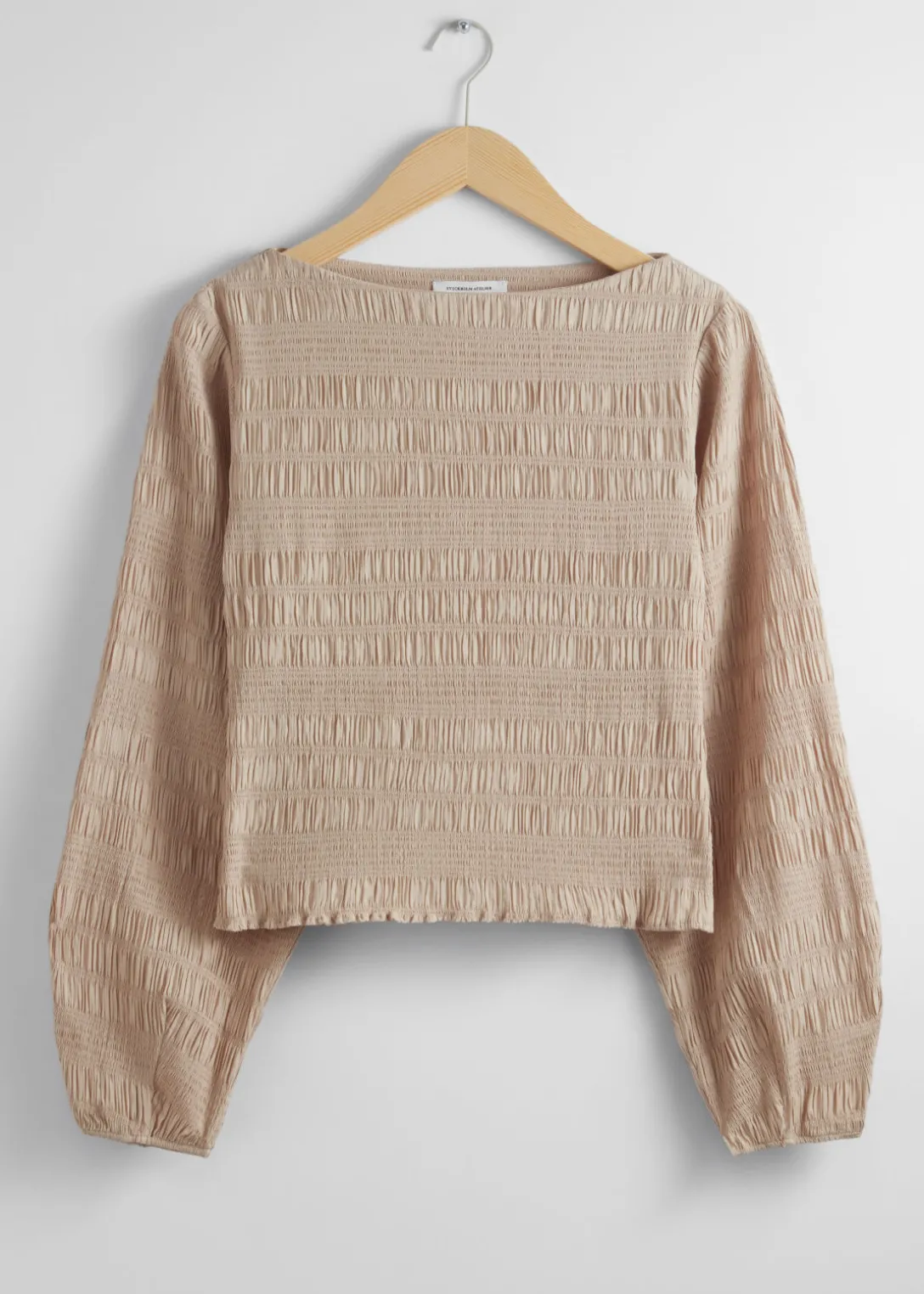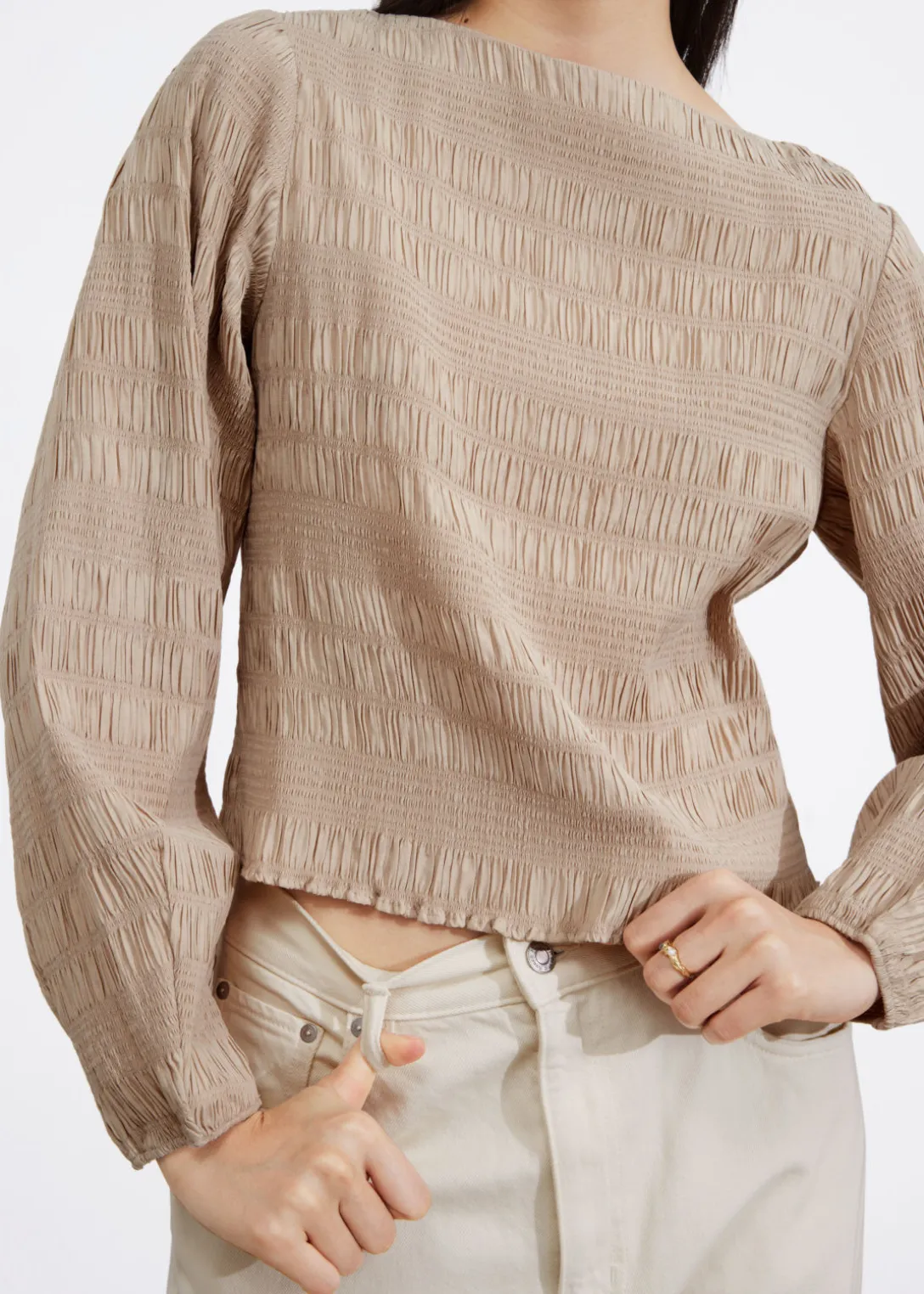 Blouse à manches longues avec une finition à smocks sur l’ensemble, une encolure bateau et un ourlet légèrement volanté.