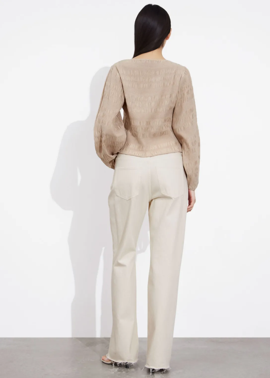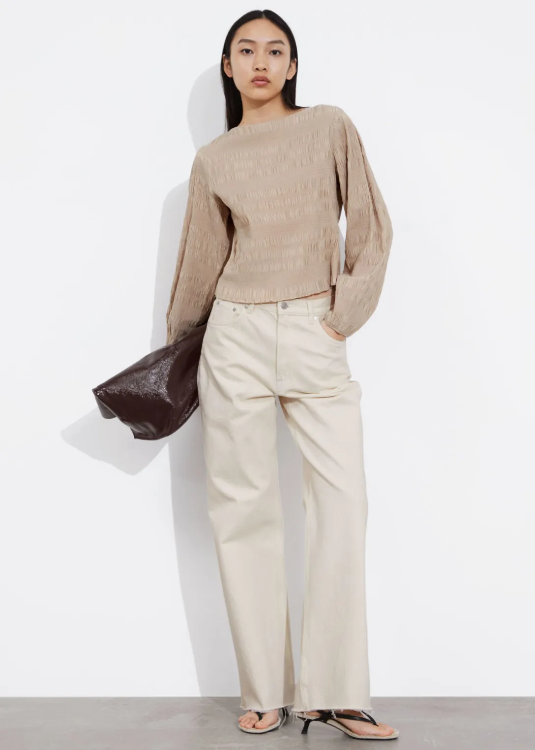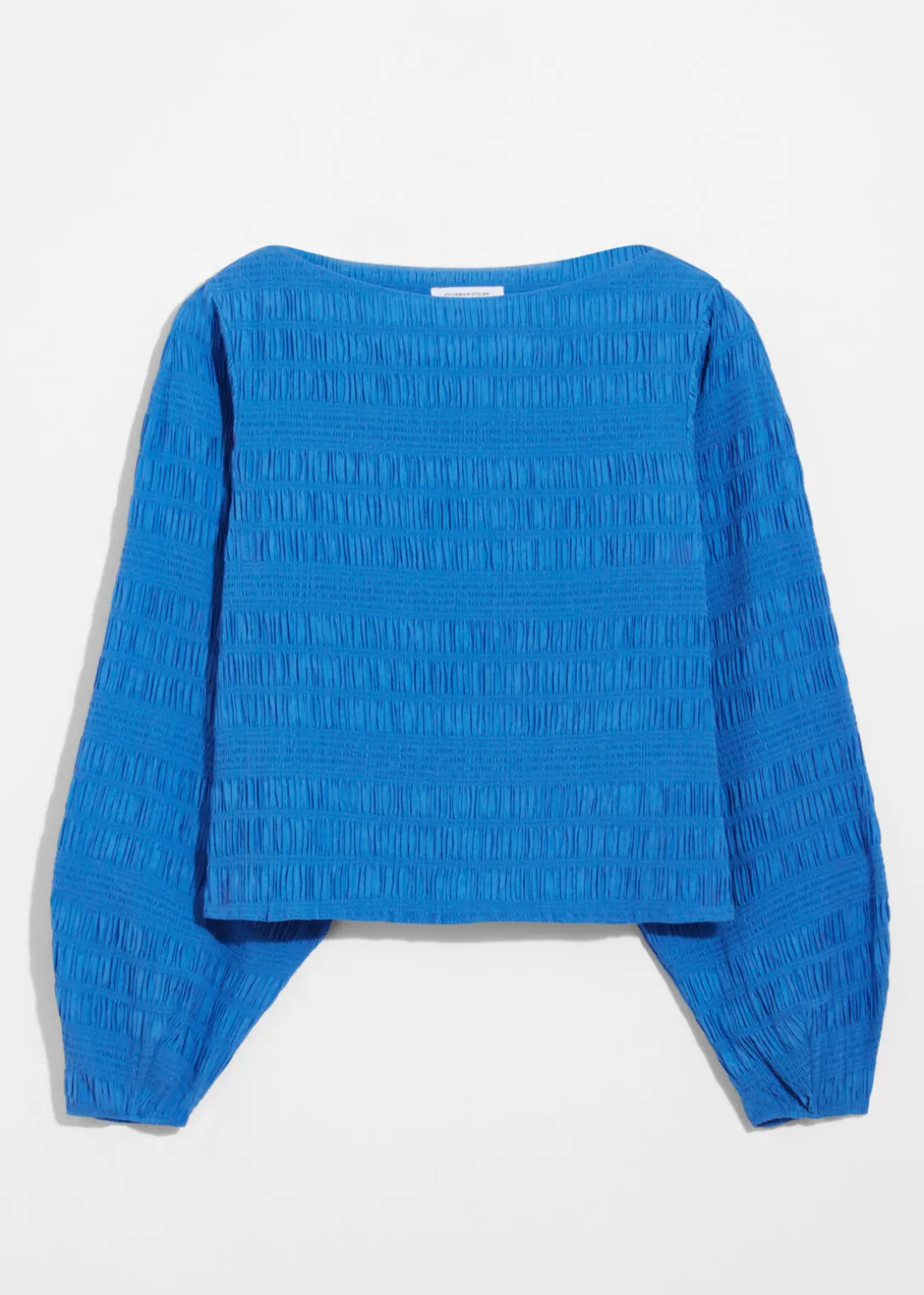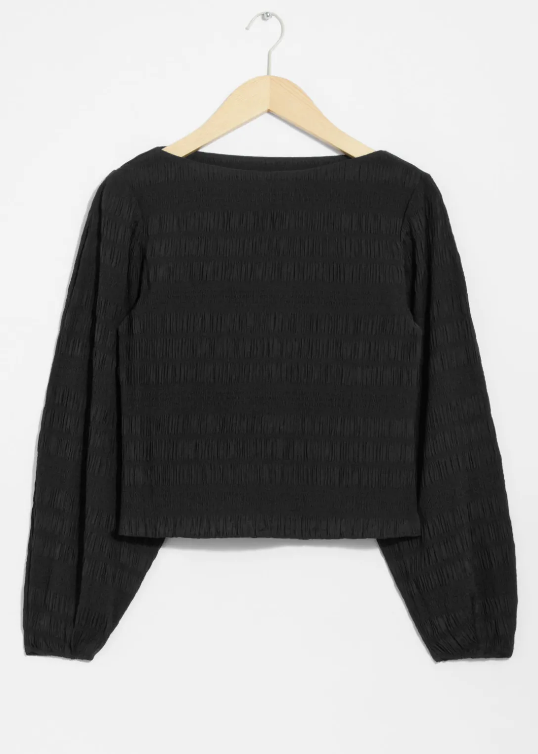 Blouse à manches longues avec une finition à smocks sur l’ensemble, une encolure bateau et un ourlet légèrement volanté.