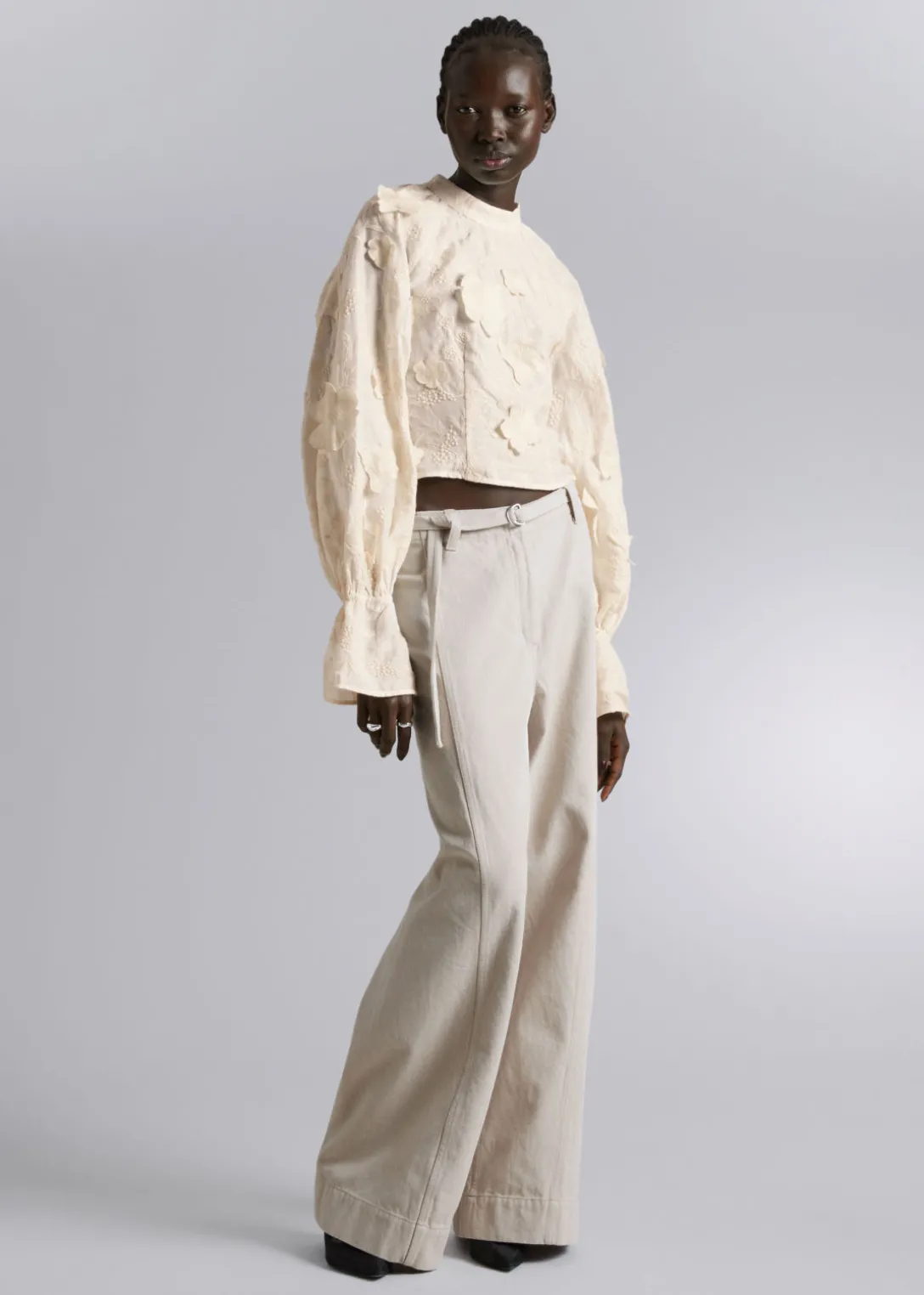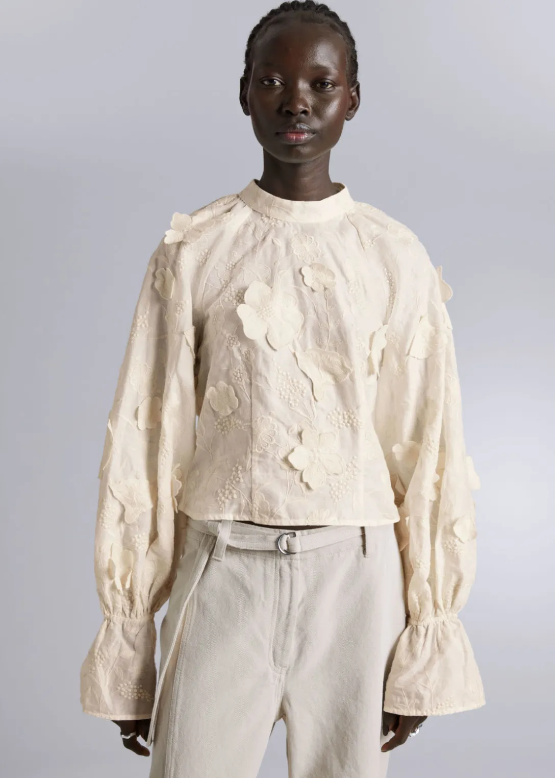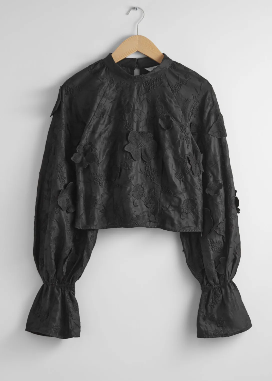 Blouse courte à col montant, avec des broderies complexes et des motifs floraux appliqués.