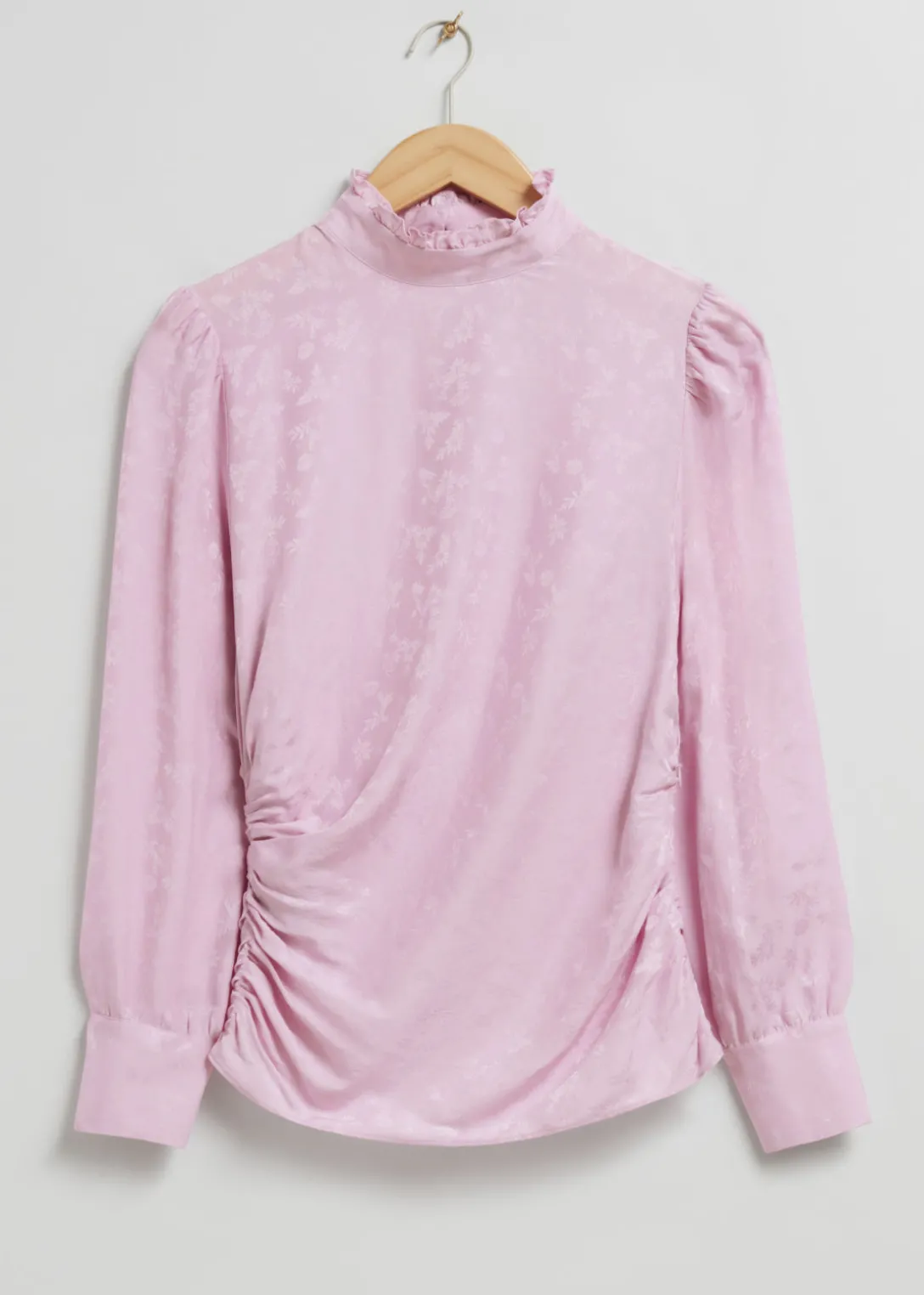 Blouse sans bouton à l’avant, drapée à la taille et dotée d’un col montant volanté.