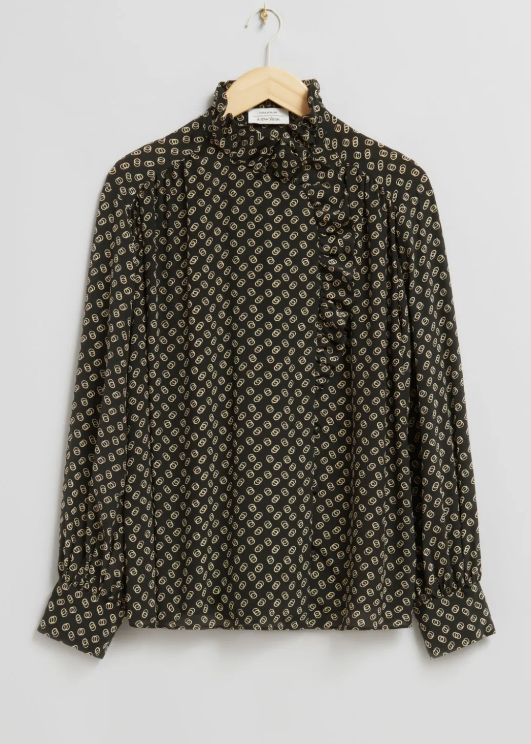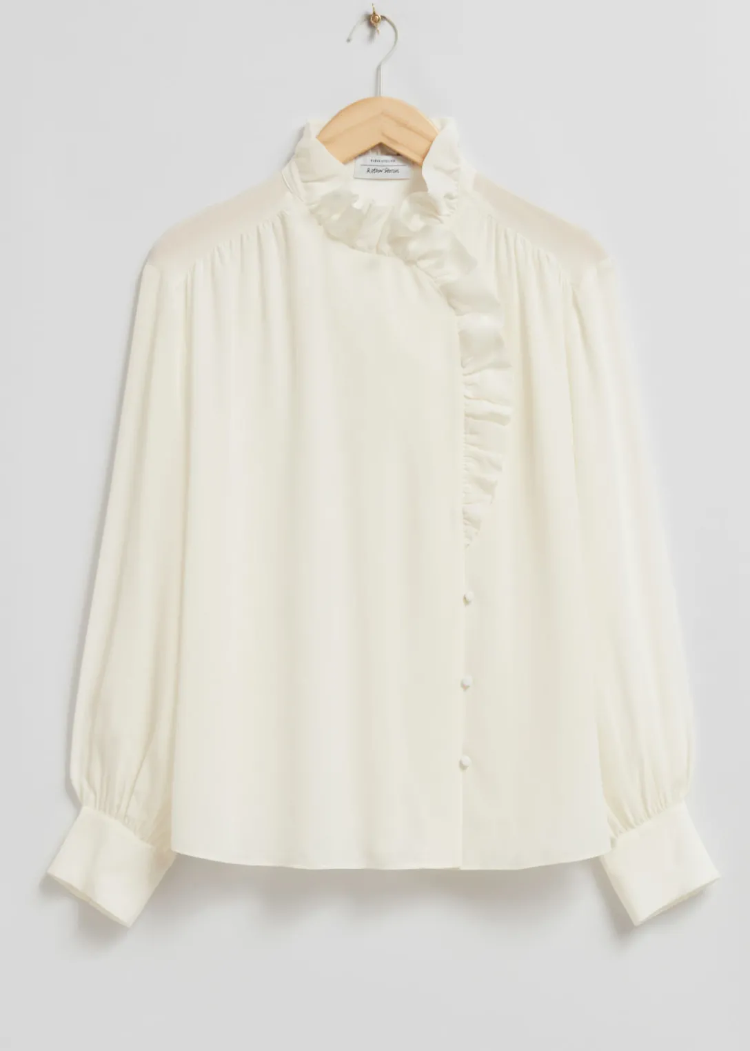 Blouse en soie oversize, avec un revers superposé et des bordures volantées.