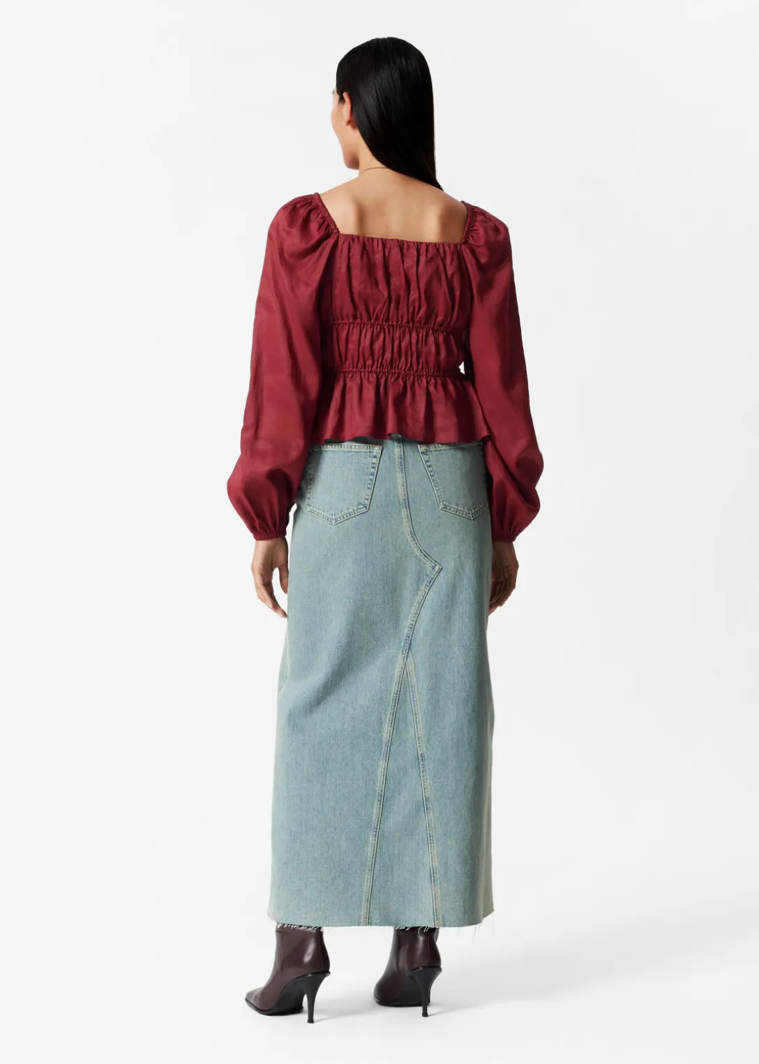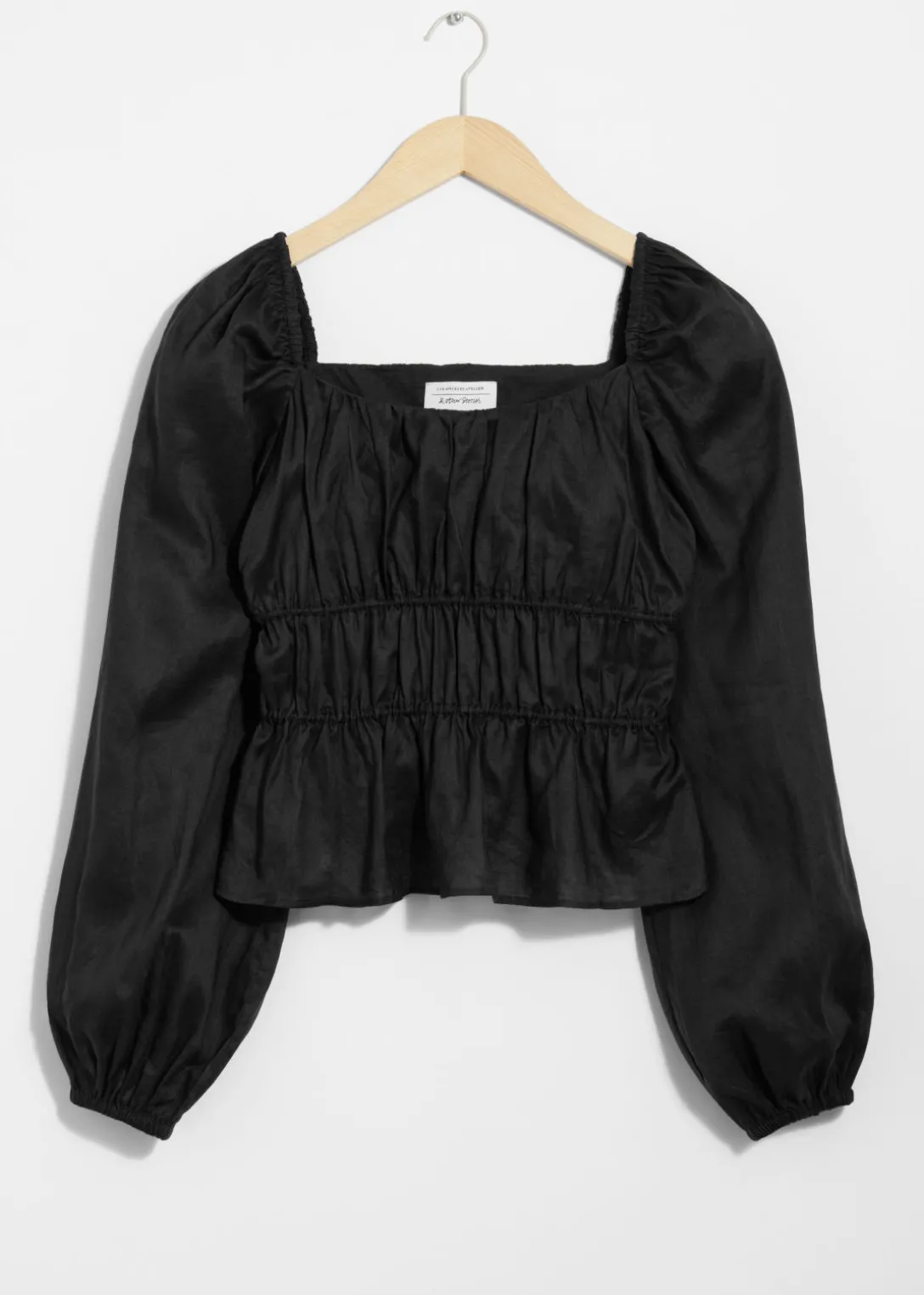 Blouse aérienne avec des manches longues et des détails élastiques pour une finition froncée.