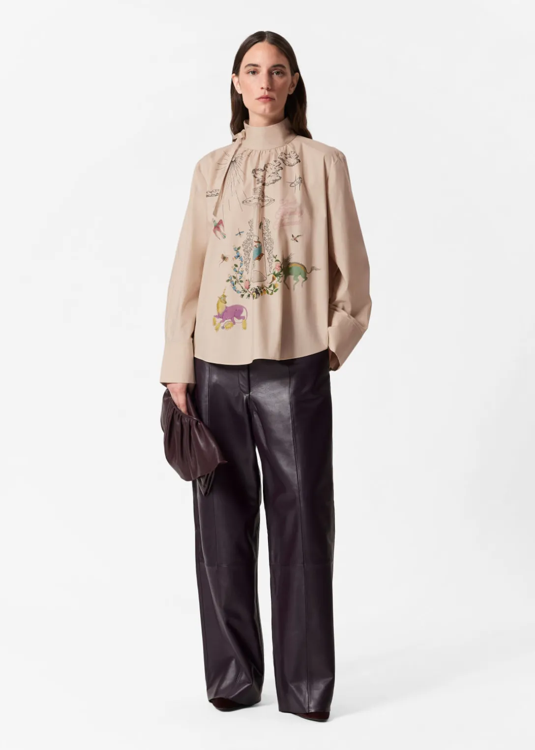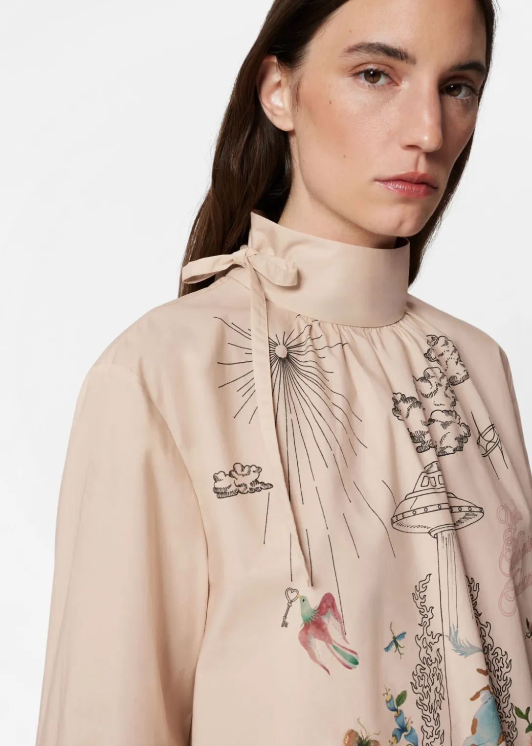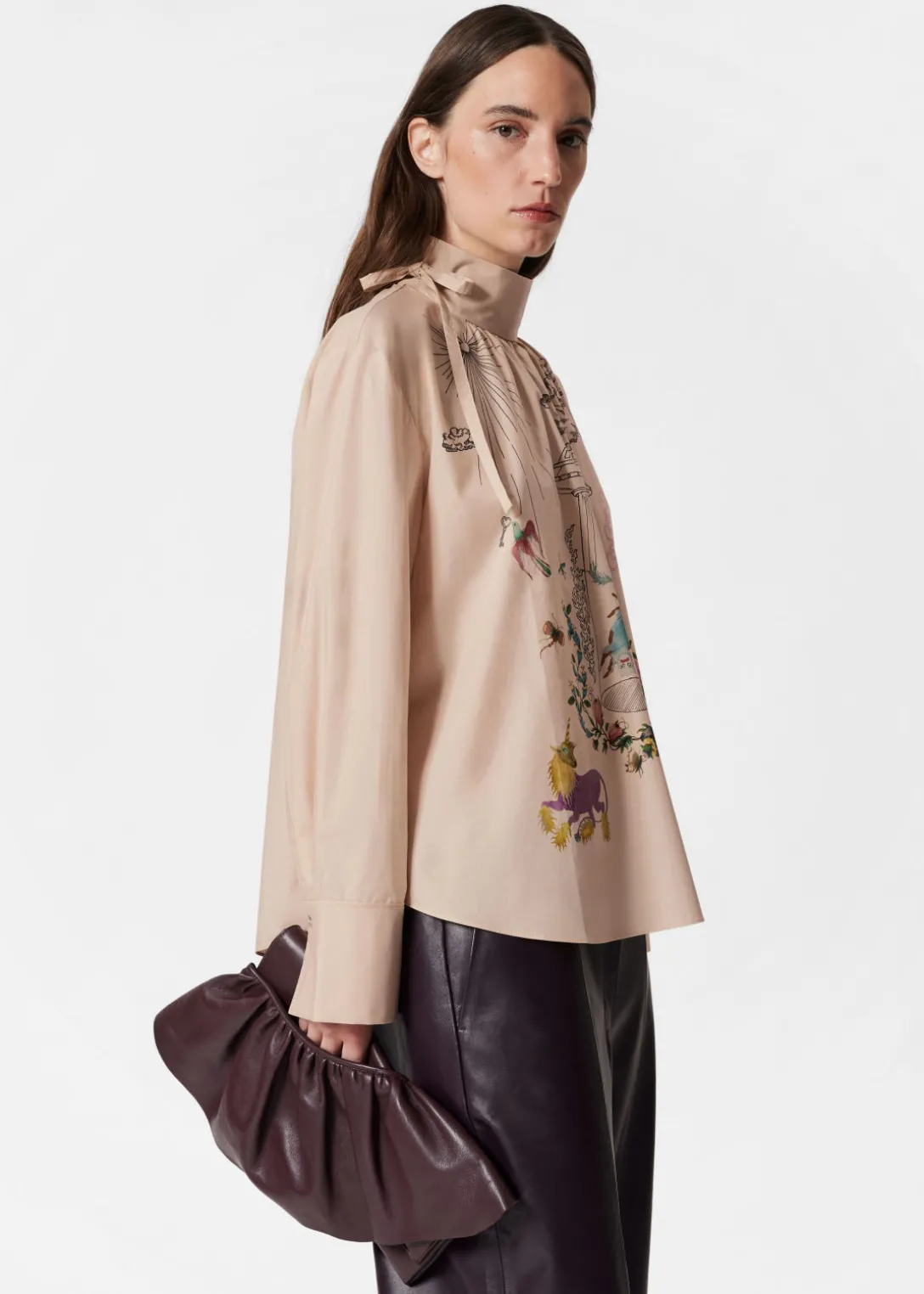 Blouse imprimée avec des manches longues, un col montant et un nœud sur le côté de l’encolure.