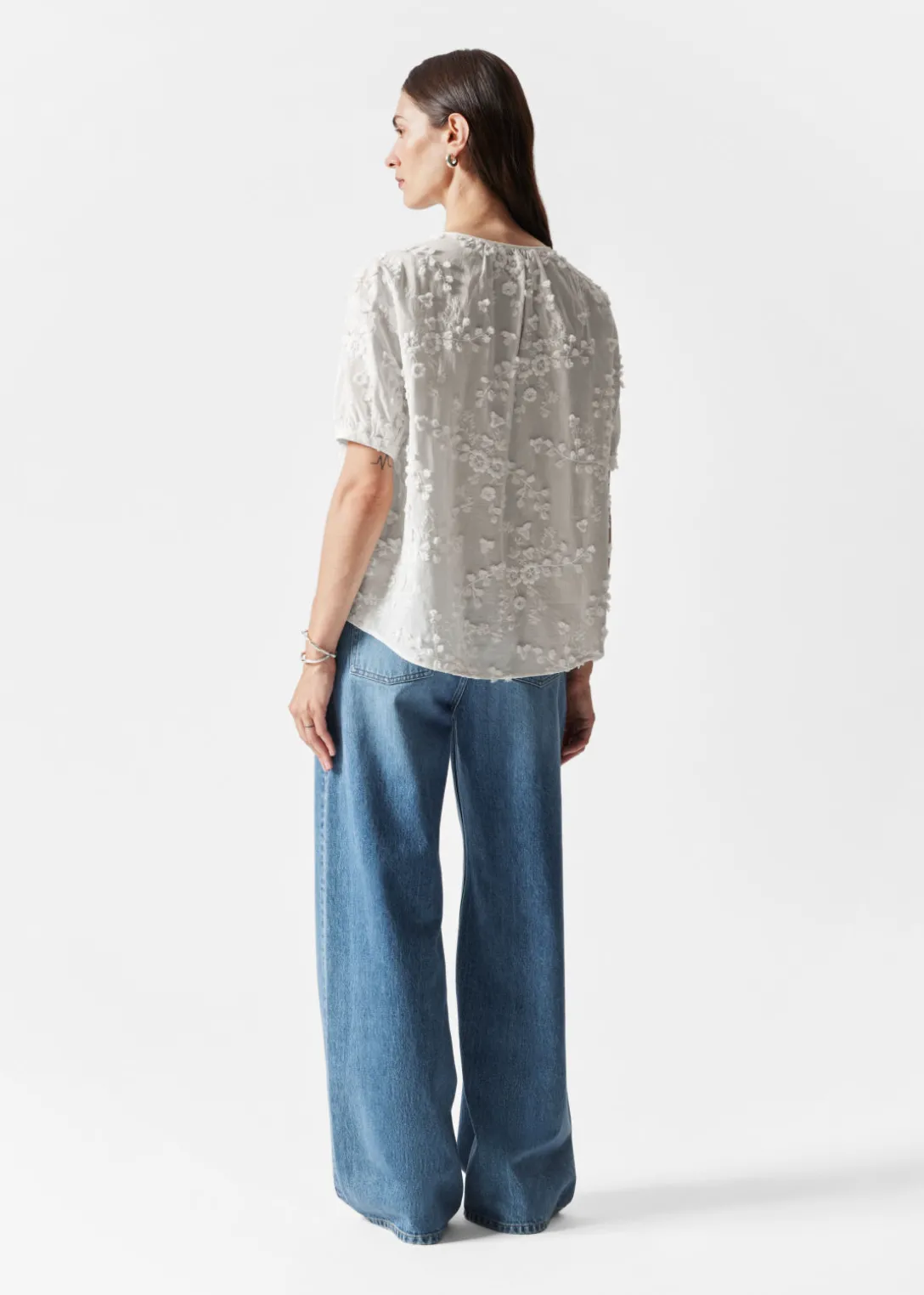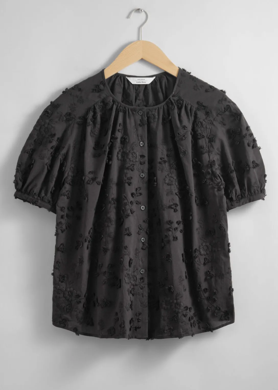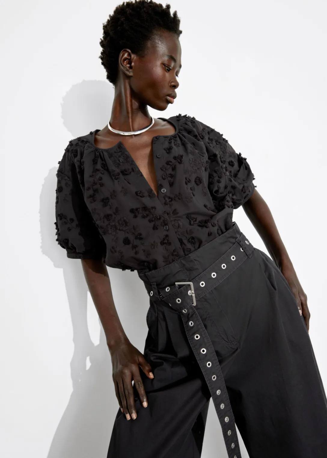Blouse oversize avec des manches ballon aux poignets boutonnés, une encolure arrondie et une patte boutonnée.