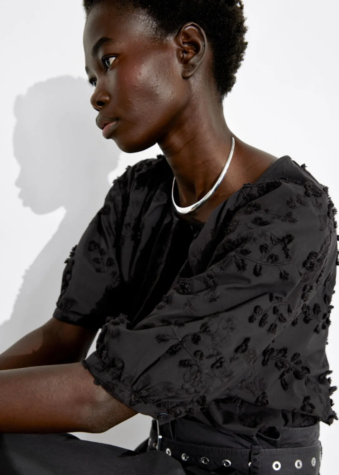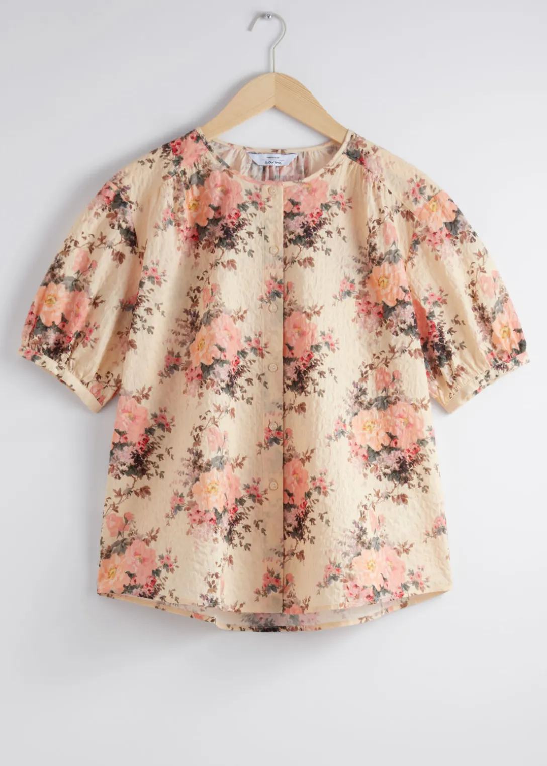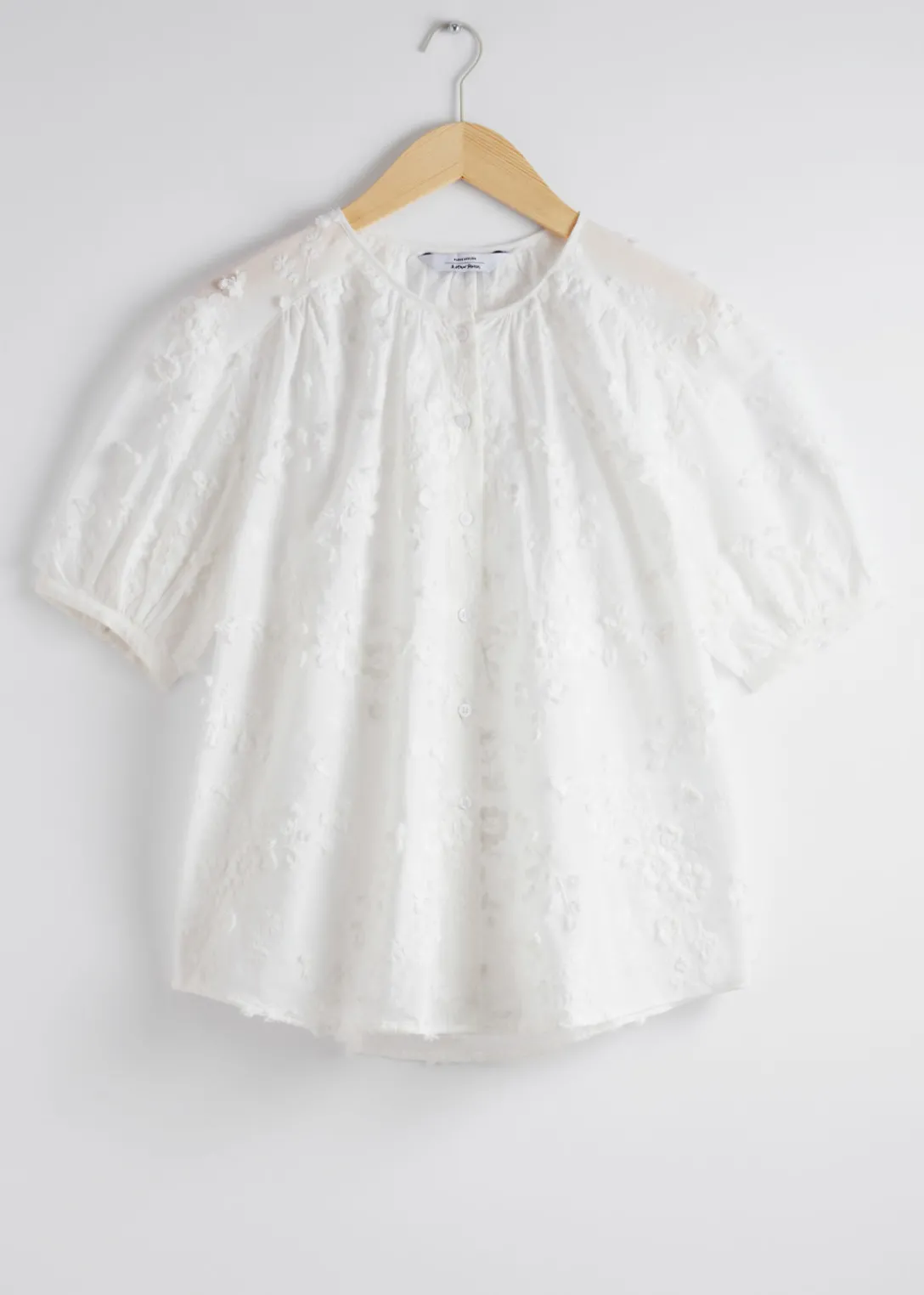 Blouse oversize avec des manches ballon aux poignets boutonnés, une encolure arrondie et une patte boutonnée.