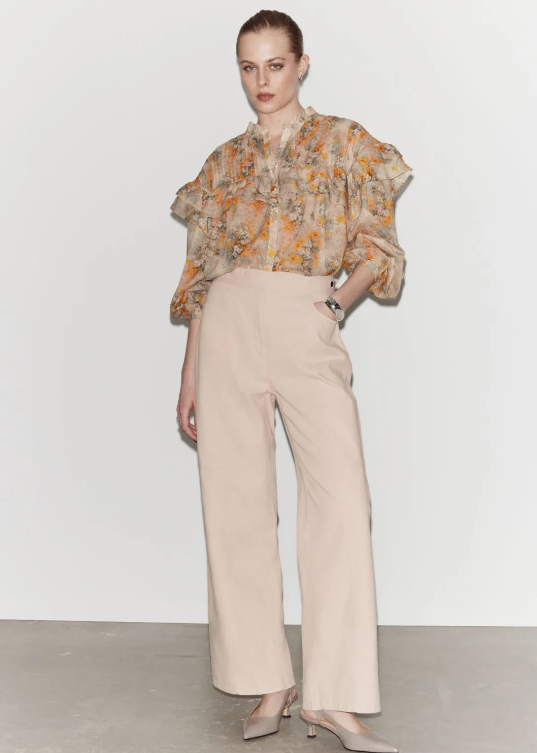 Blouse oversize à manches longues, avec détails plissés sur la poitrine. Ornée de bords volantés sur les épaules et le devant.