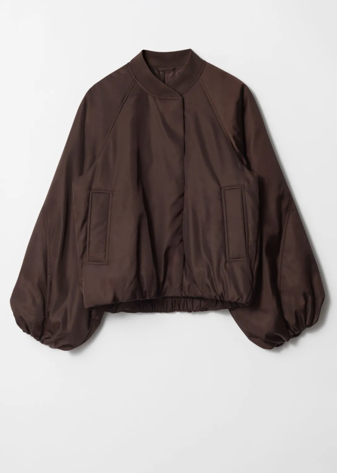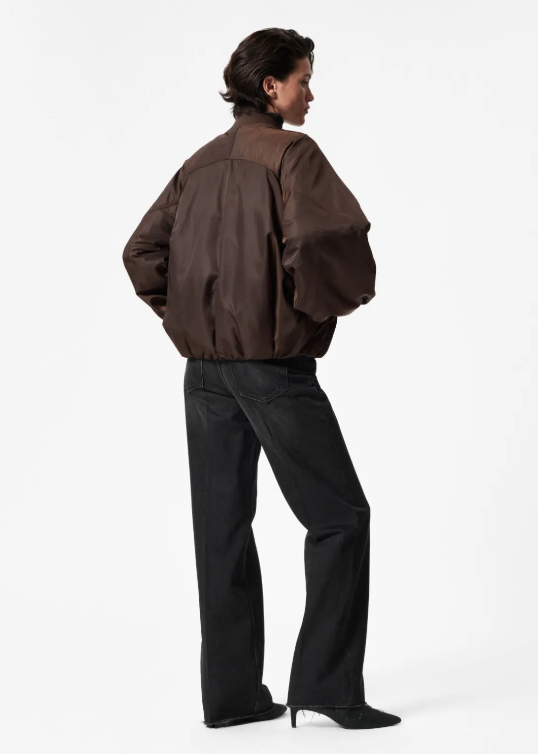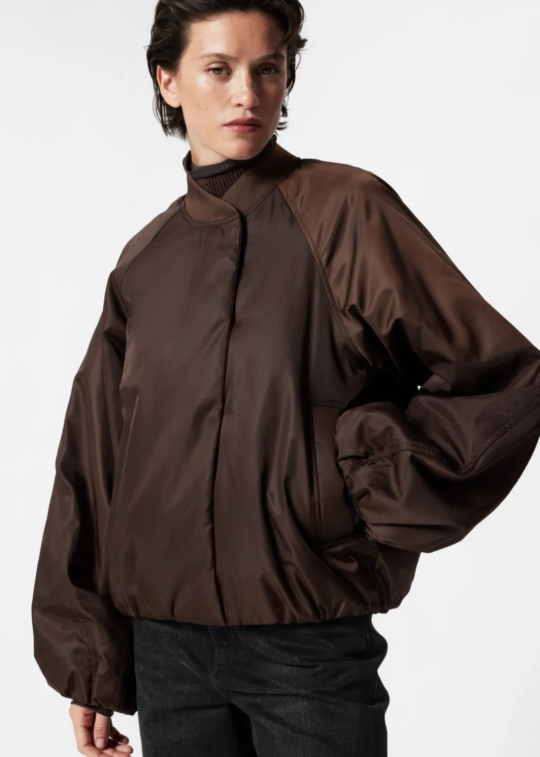Bomber matelassé au fini technique. Conçu avec des manches vaporeuses et deux poches passepoilées.