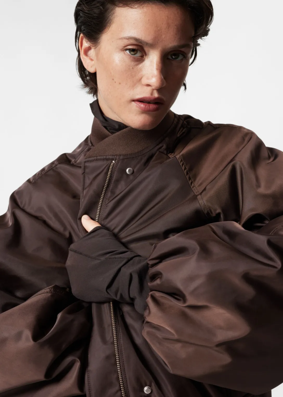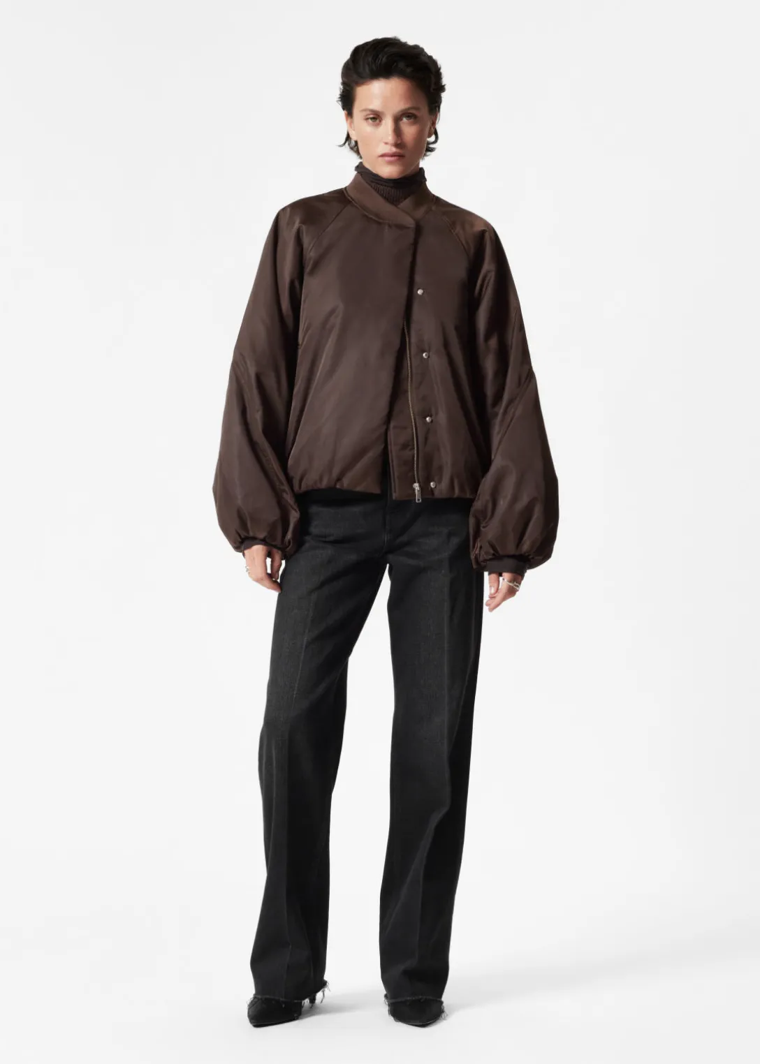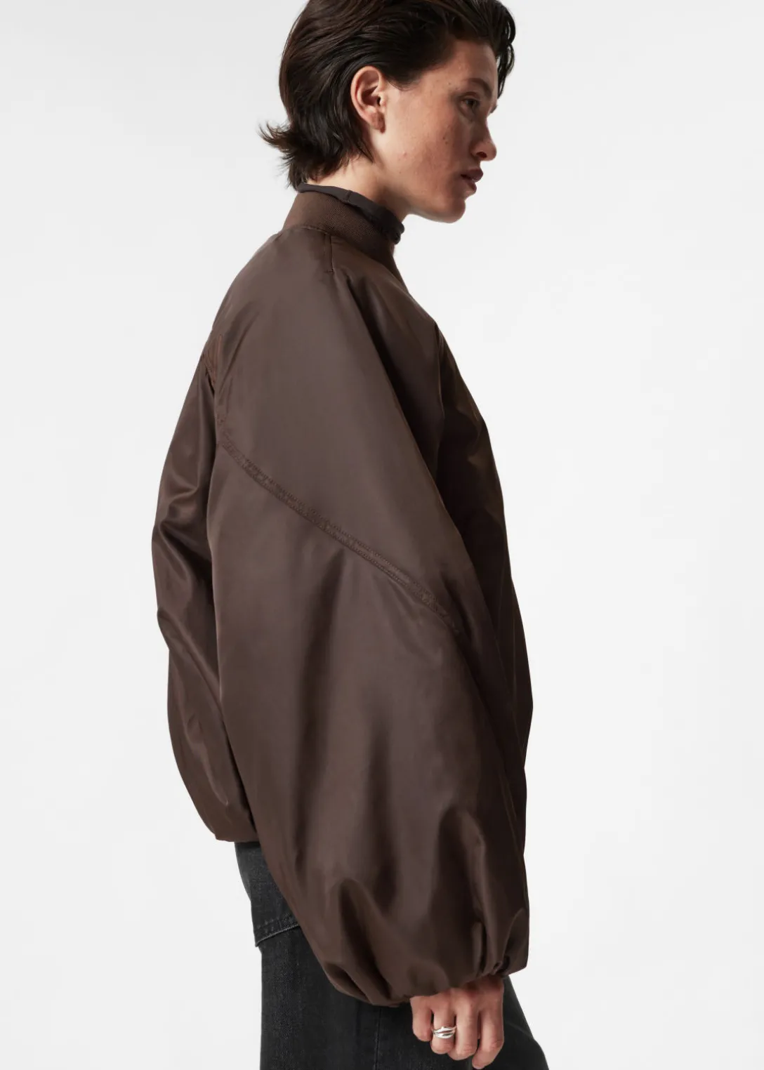 Bomber matelassé au fini technique. Conçu avec des manches vaporeuses et deux poches passepoilées.