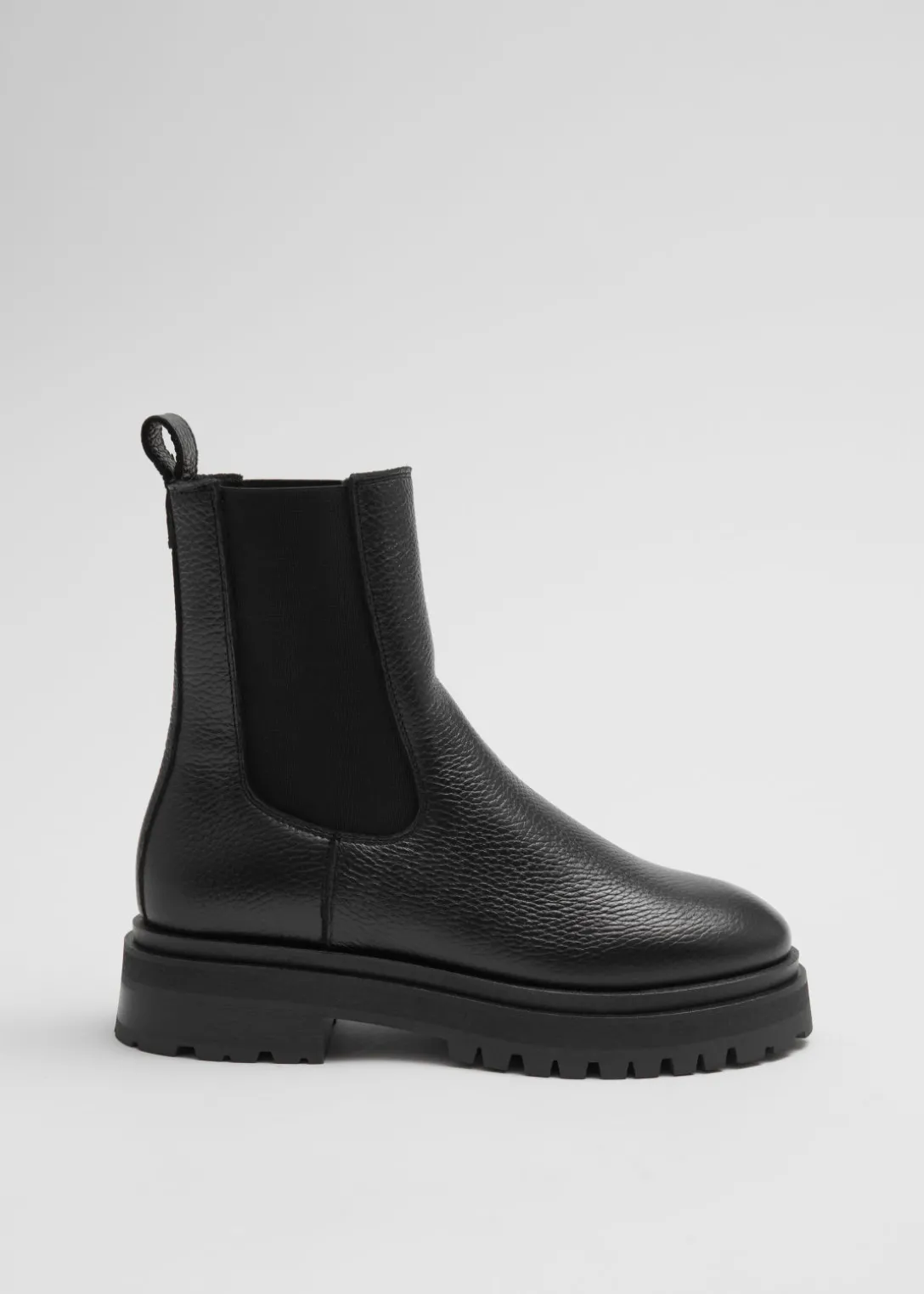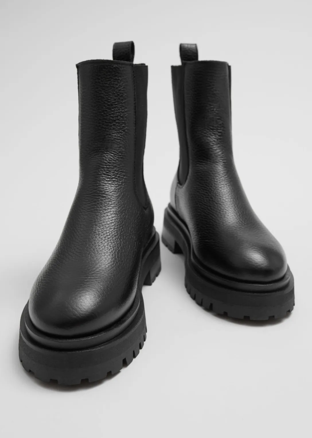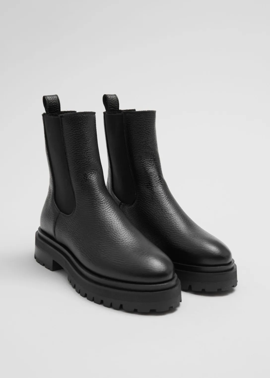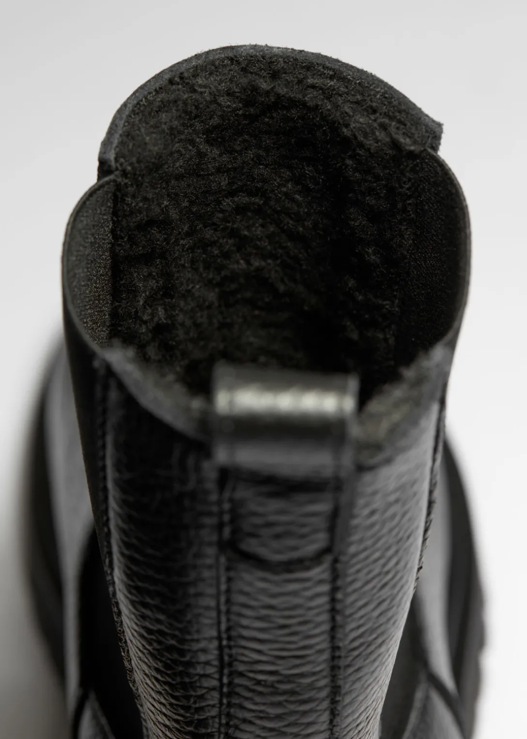 Bottines Chelsea en cuir avec semelle épaisse, doublure en polaire, panneaux latéraux élastiques et languette en cuir.