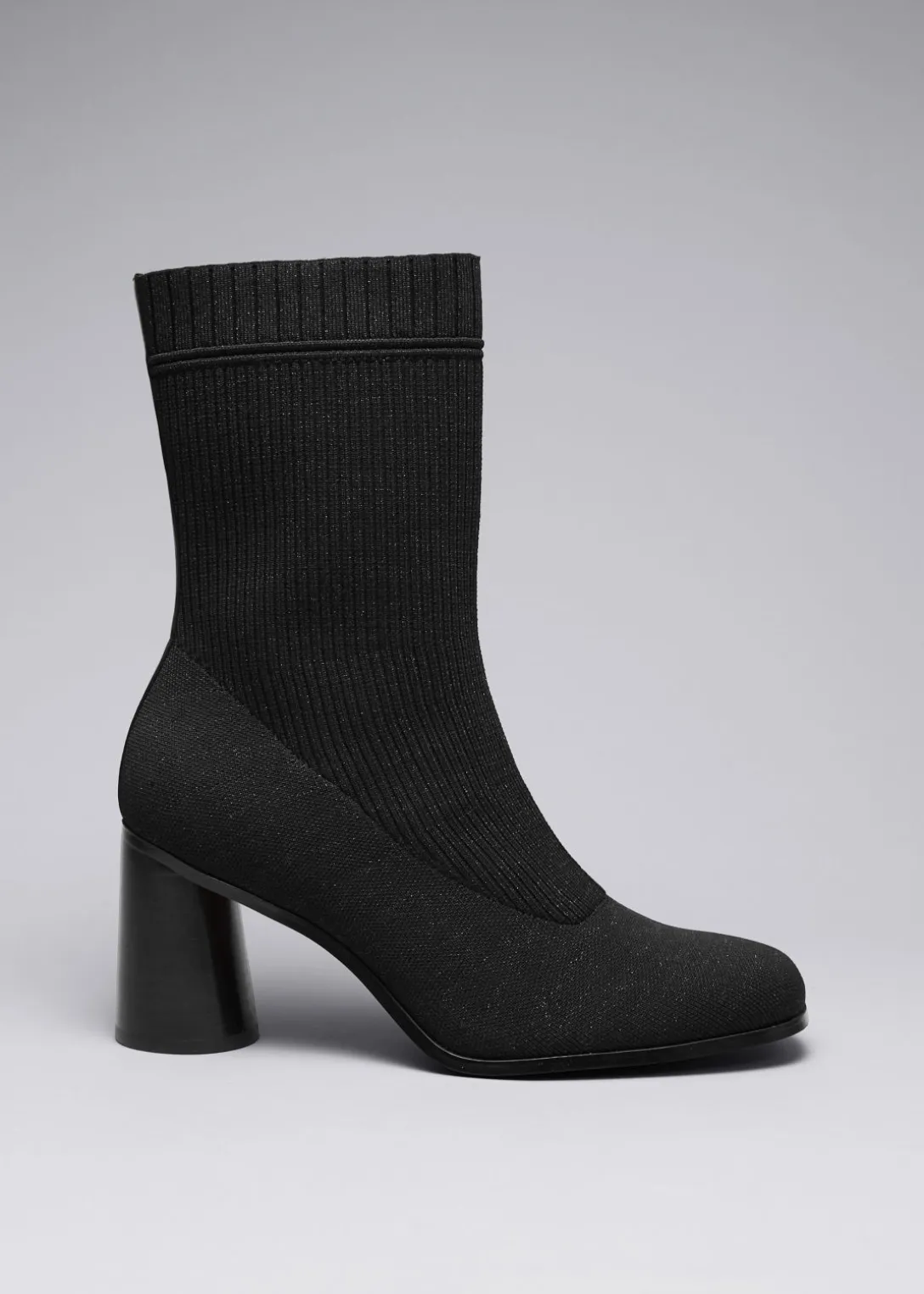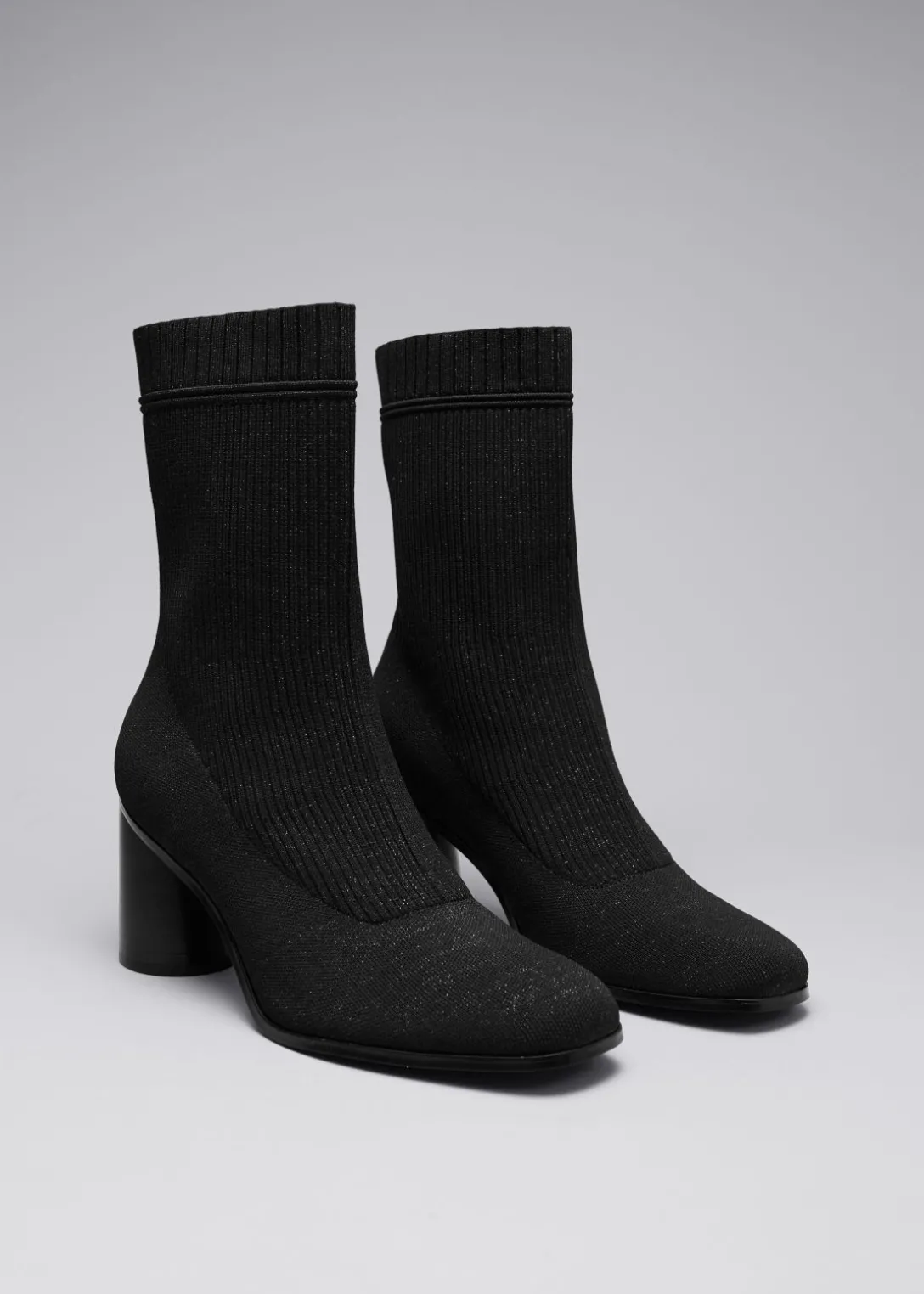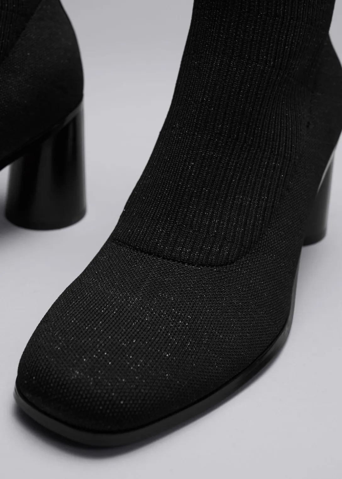 Bottines en maille extensible semblables à des chaussettes, à la fois confortables et élégantes. Dotées de talons arrondis, de bouts en amande et de bords côtelés.