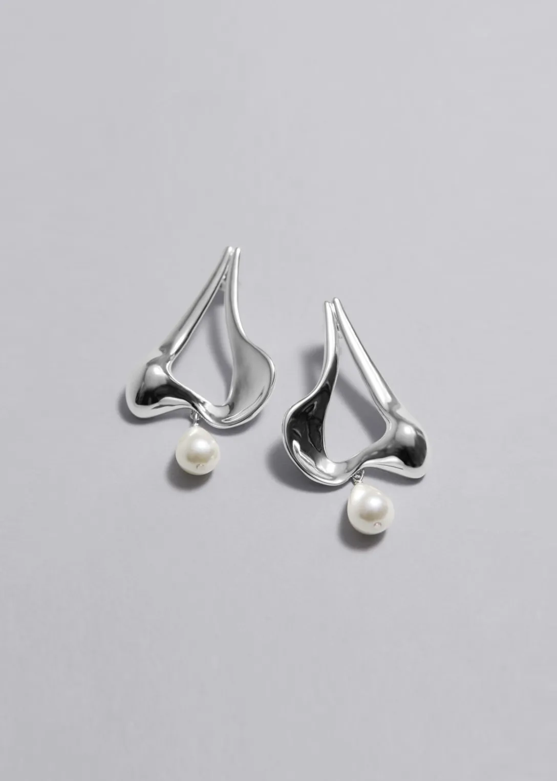 Ornées d’une forme liquide sculpturale, ces boucles d’oreilles en laiton argenté poli présentent des perles d’eau douce au bout. Dotées de fermoirs papillon.