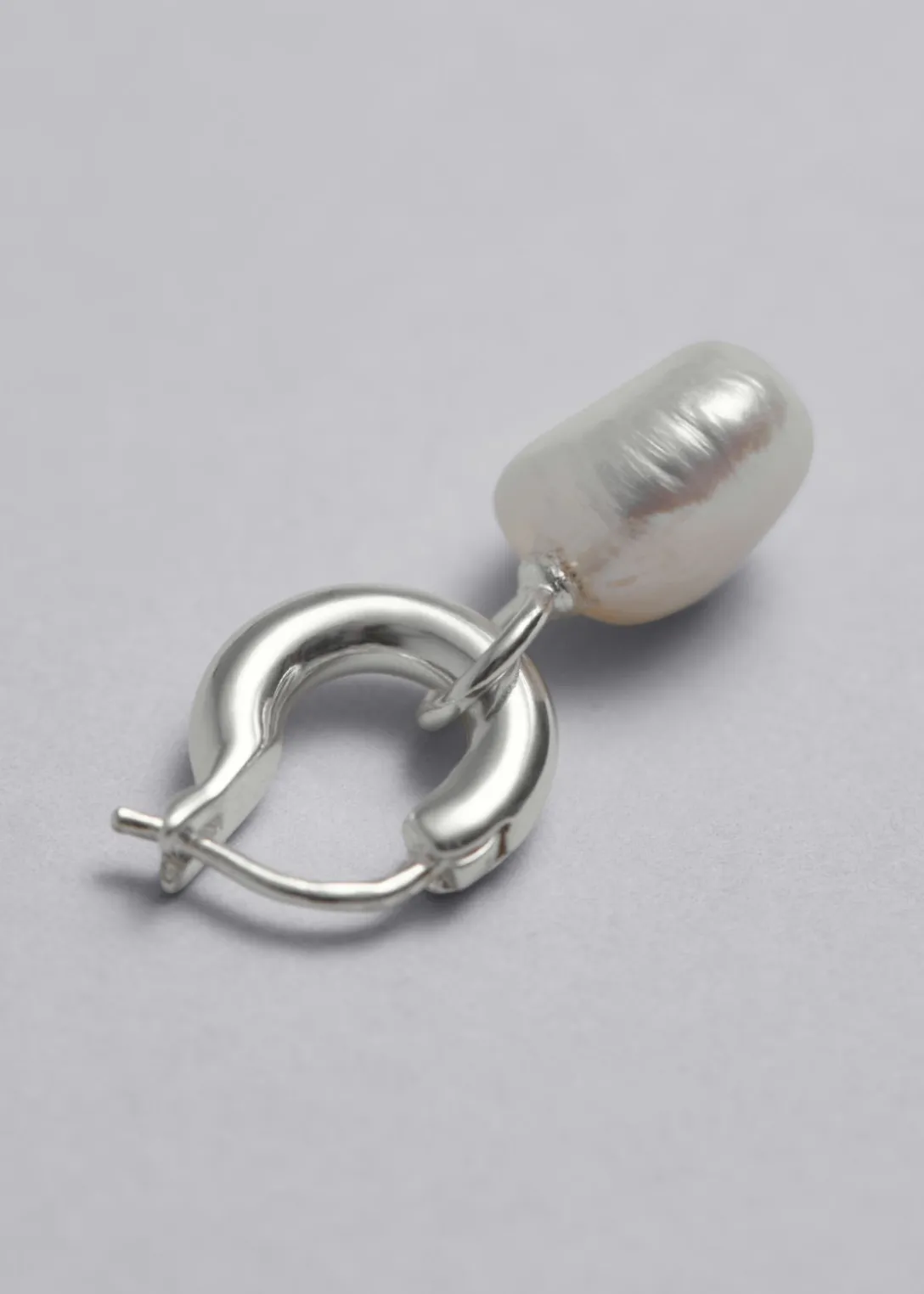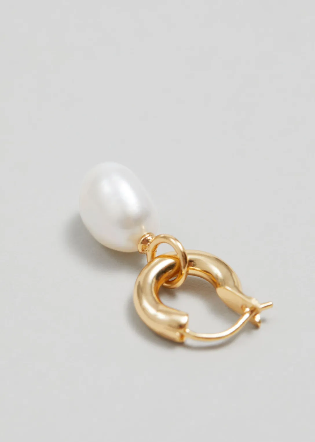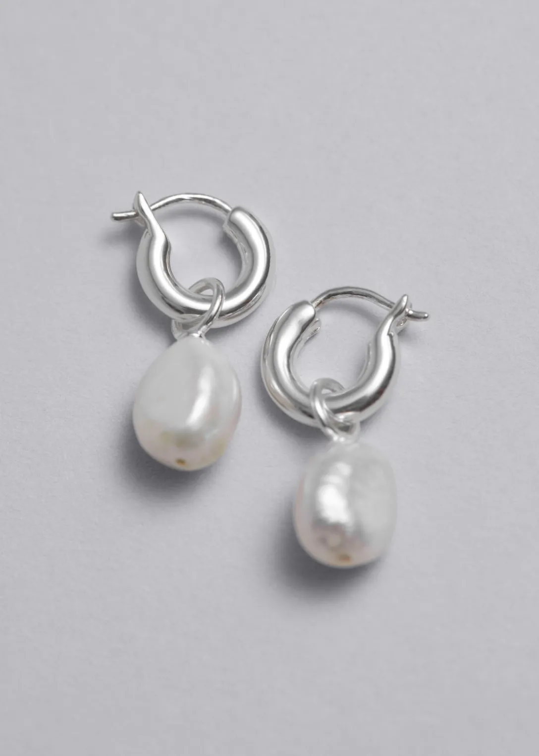Créoles, aussi élégantes que minimalistes, ornées de pendentifs à perles d’eau douce brillantes et dotées de fermoirs à cliquet.