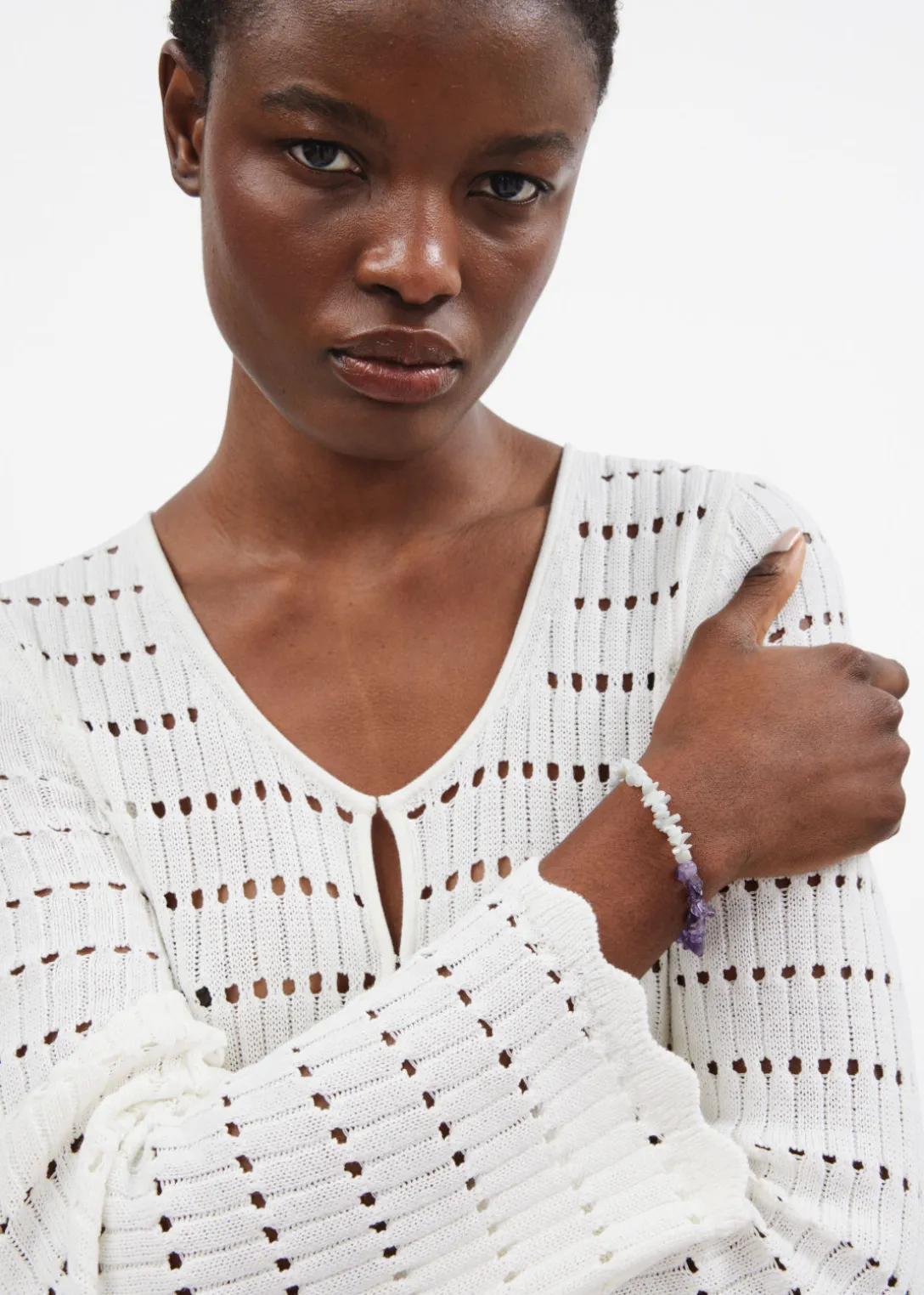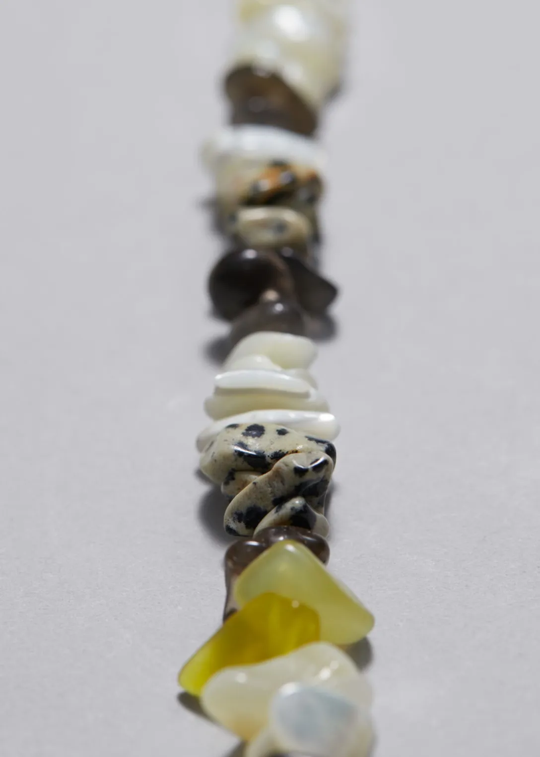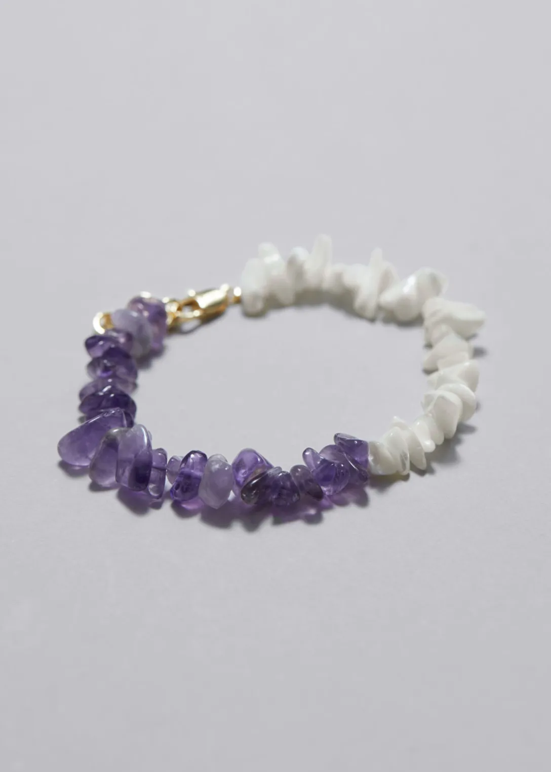 Ce bracelet permet de donner facilement un coup d’éclat à un look neutre. Orné de perles de pierre et de coquillages lumineux, il possède un fermoir à mousqueton et une chaîne d’extension.