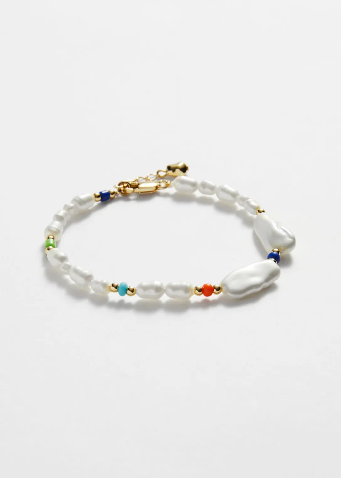 Bracelet orné de perles synthétiques de formes et de tailles différentes, mais aussi de perles éclatantes apportant une touche de couleur parfaite. Confectionnée en laiton poli, sa chaîne ajustable vous permet de régler la longueur.
