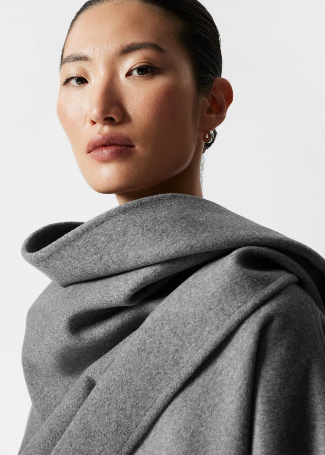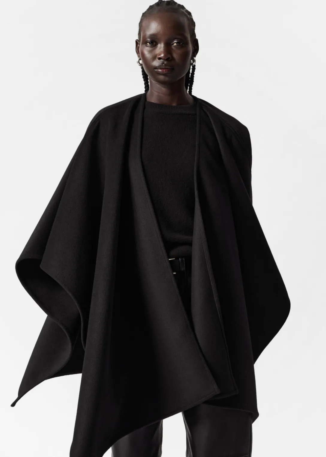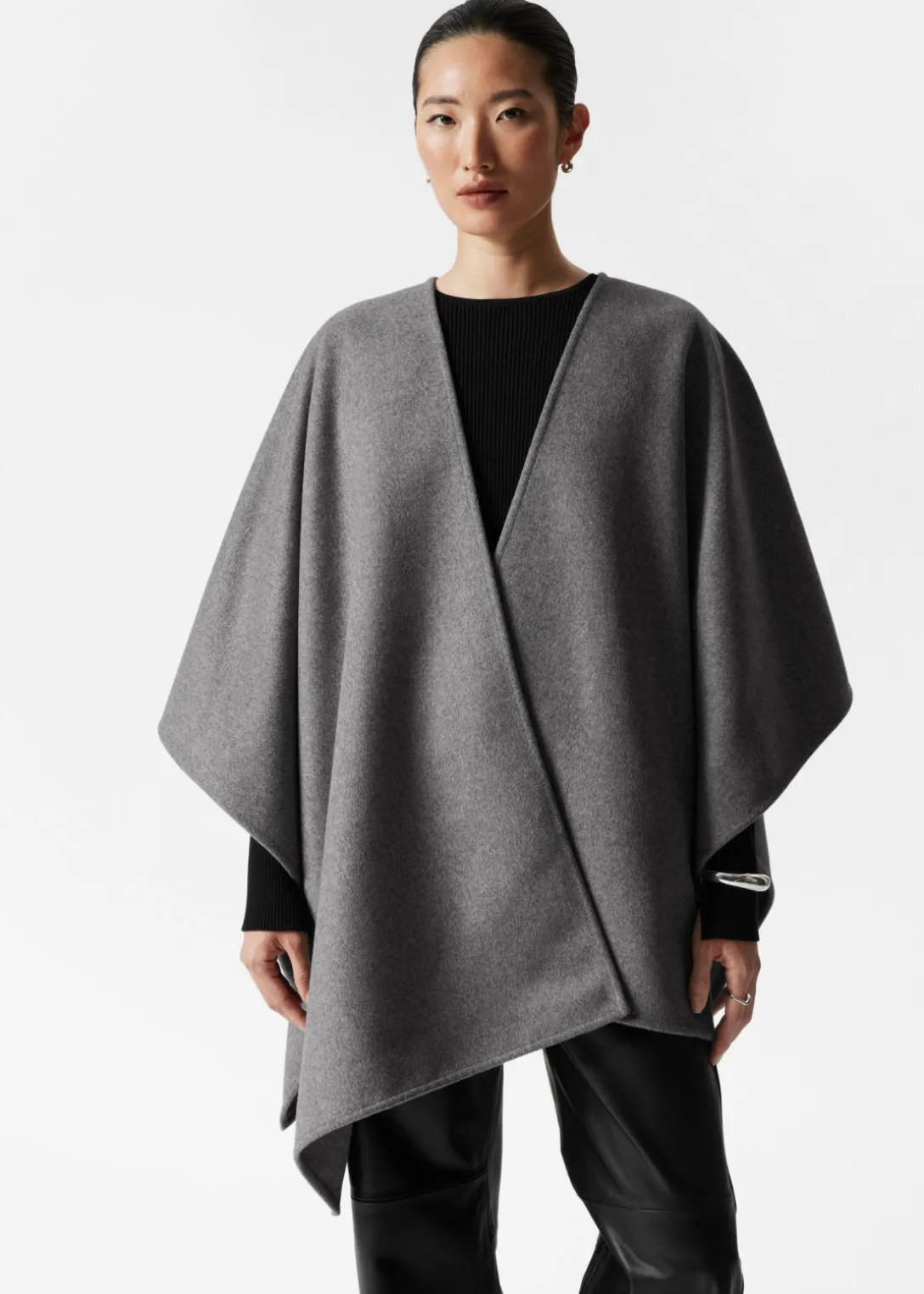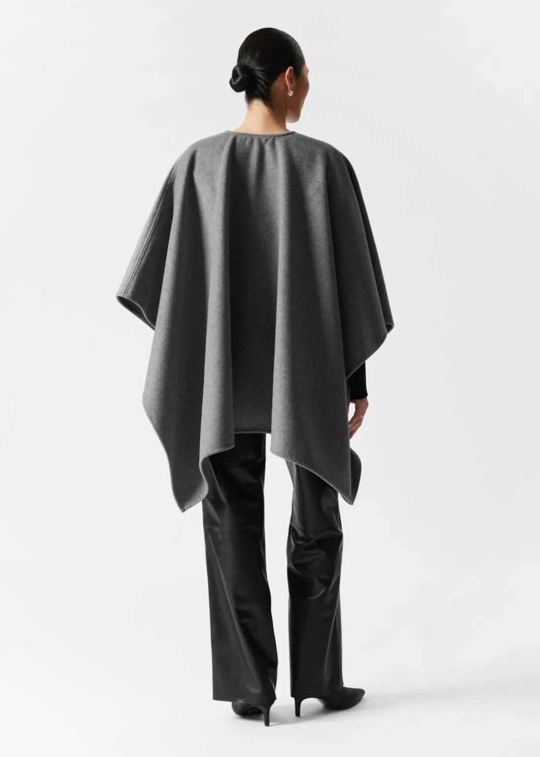 Cette cape est la pièce de superposition idéale pour les mois de transition. Tricotée à partir d’un mélange de laine douce, elle présente une forme enveloppante qui s’adapte confortablement sur un pull ou une chemise à col.