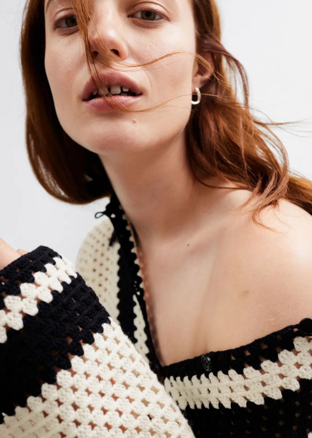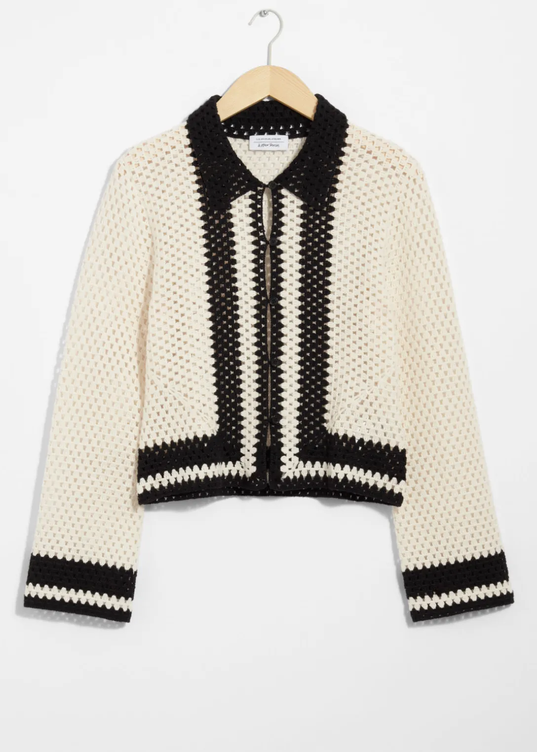 Cardigan crocheté avec des touches contrastées sur le revers, l’ourlet et les poignets.