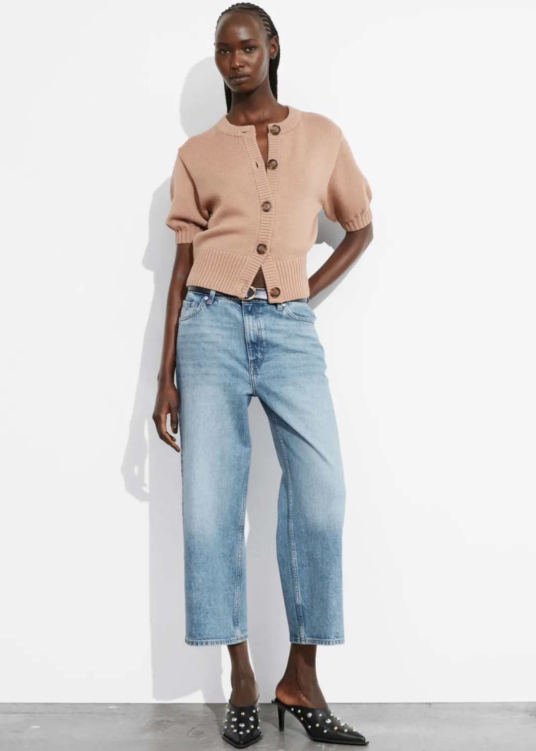 Cardigan en laine mérinos, avec manches ballon et fermeture à 5 boutons.