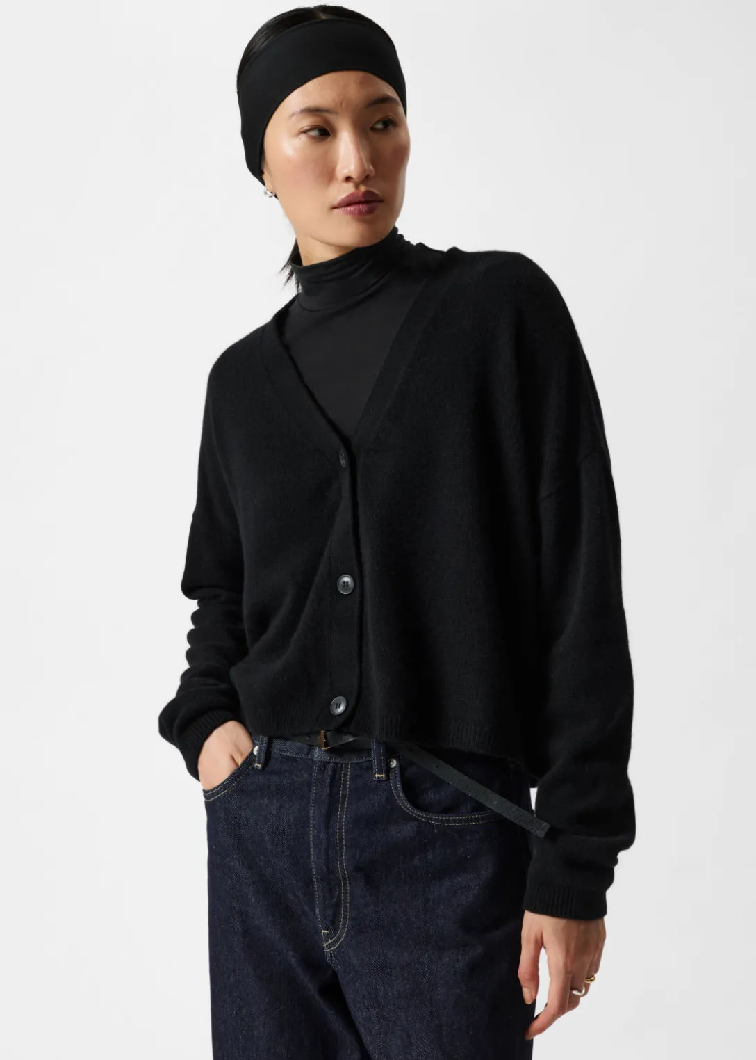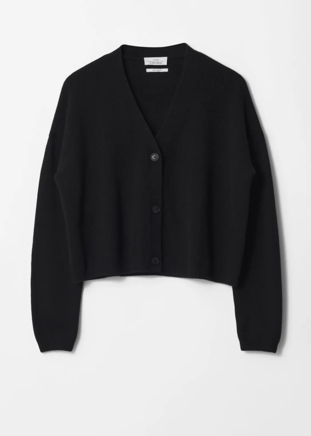 Cardigan à manches longues en maille de pur cachemire. Fermeture à trois boutons.