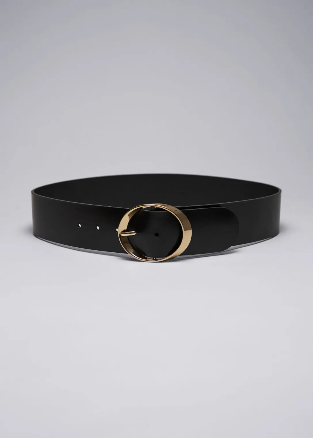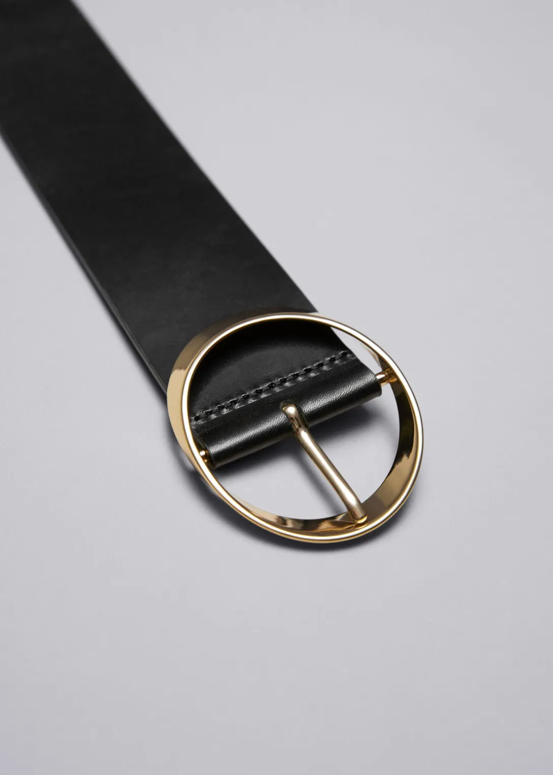 Conçue pour être portée sur la taille, cette ceinture est confectionnée en cuir lisse noir et ornée d’une boucle sculpturale dorée.