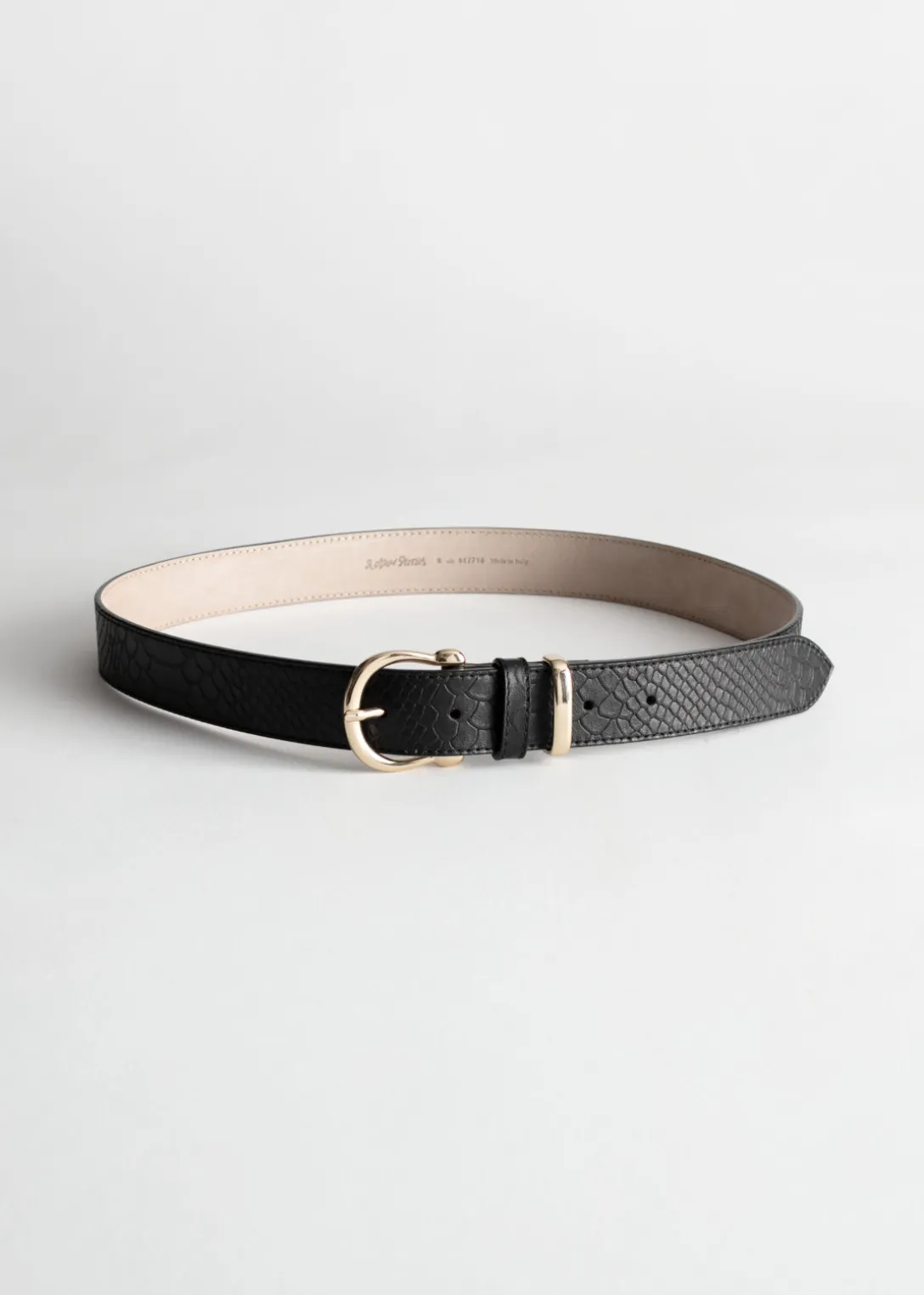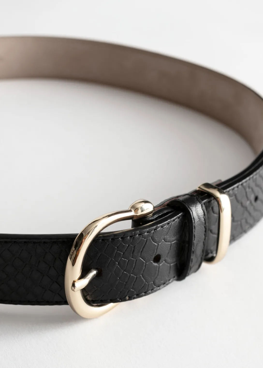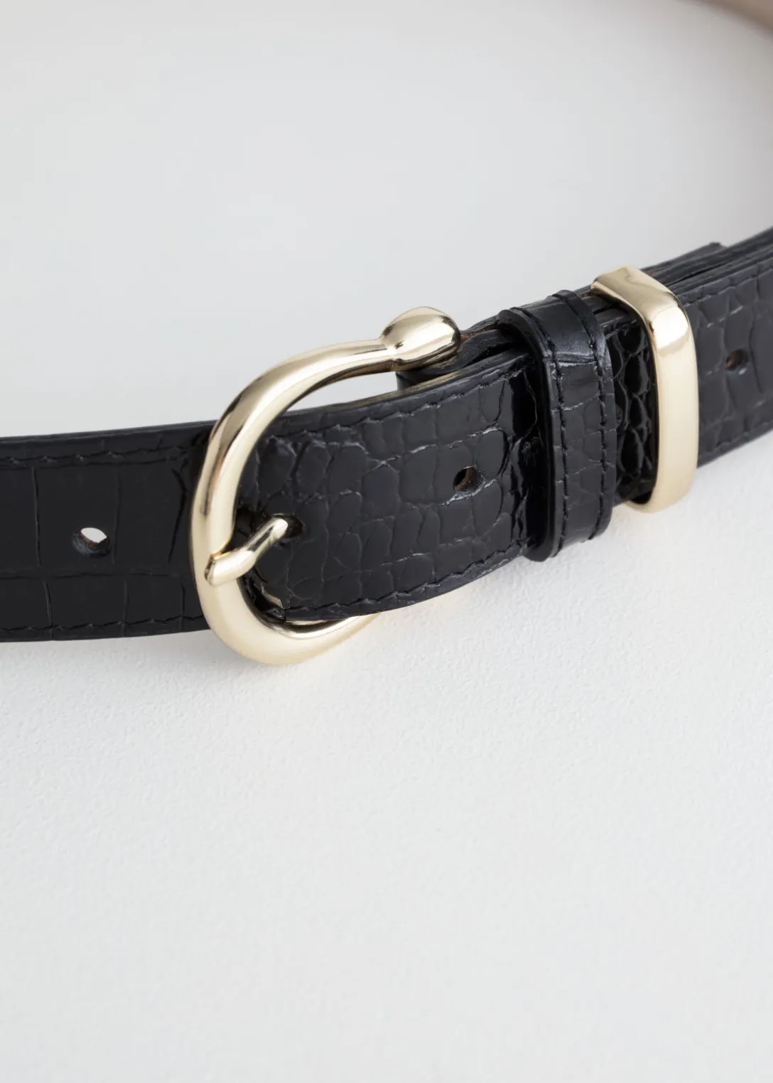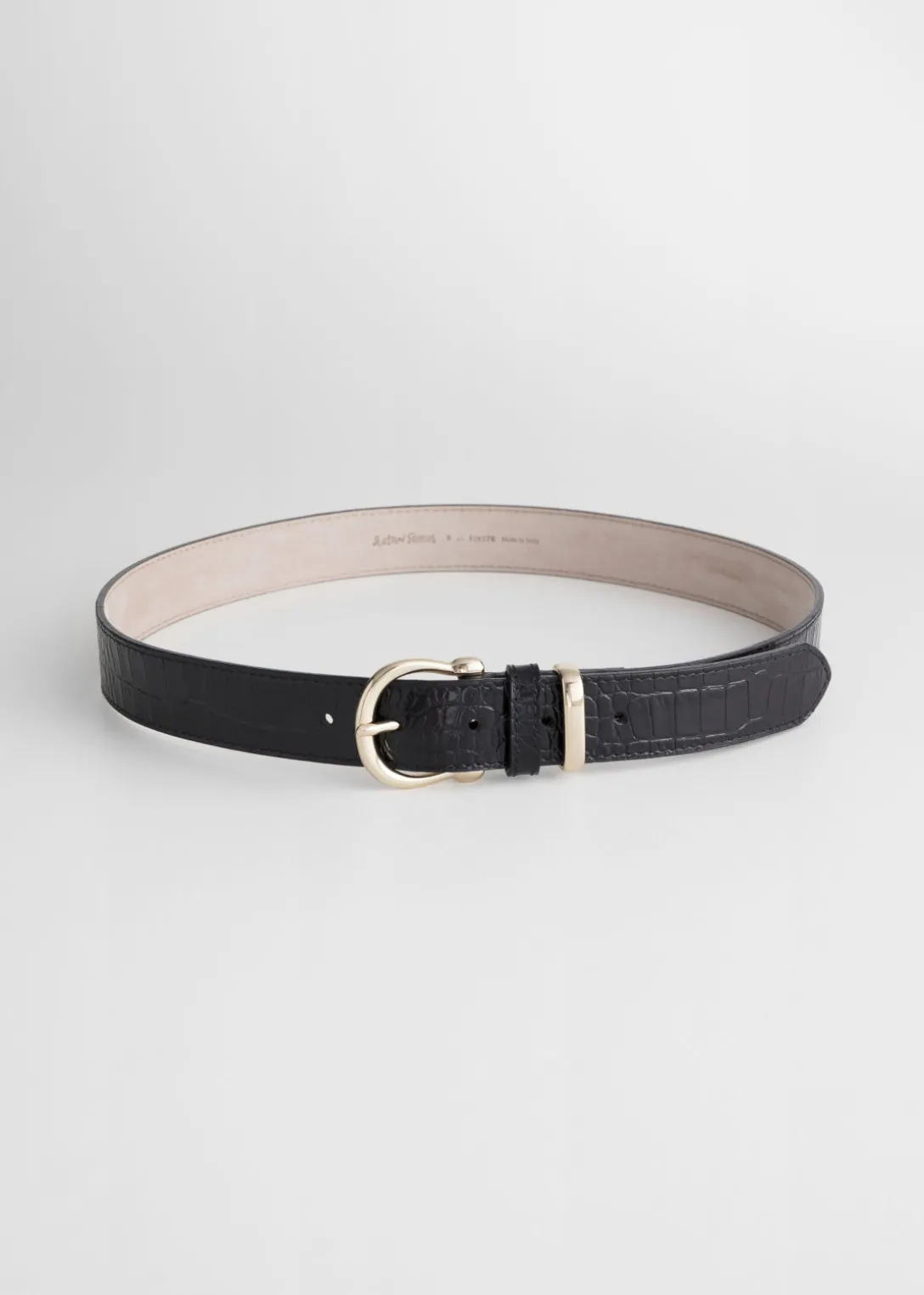 Cette ceinture fine en cuir est texturée d’un motif croco embossé et présente un fermoir ainsi qu’une boucle métalliques.