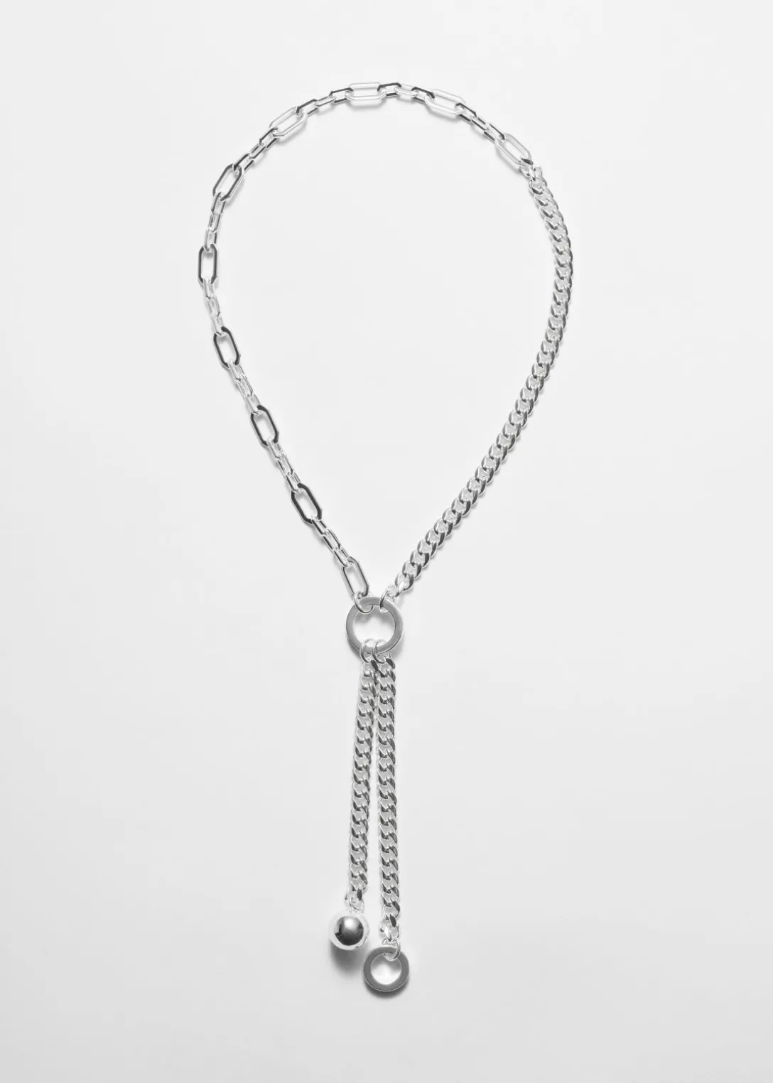Ce collier est moulé en laiton plaqué argent en forme de lasso et présente diverses chaînes contrastées, des maillons épais, un pendentif boule et un pendentif anneau. Circonférence : 53 cm