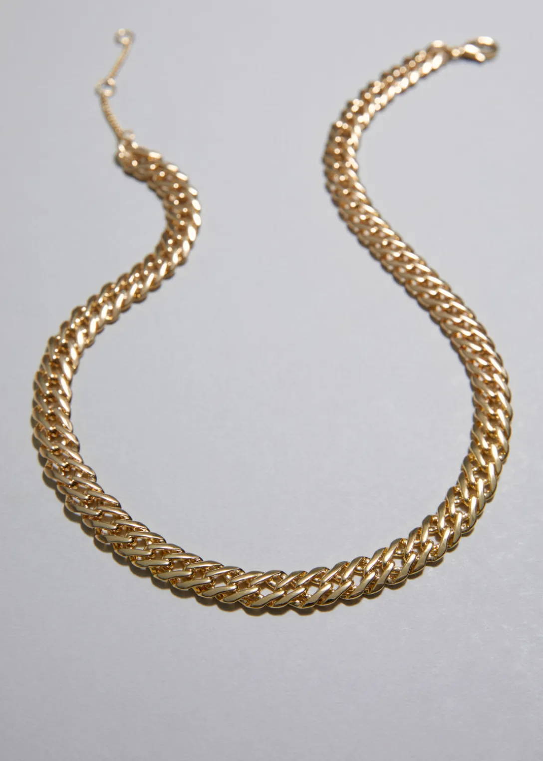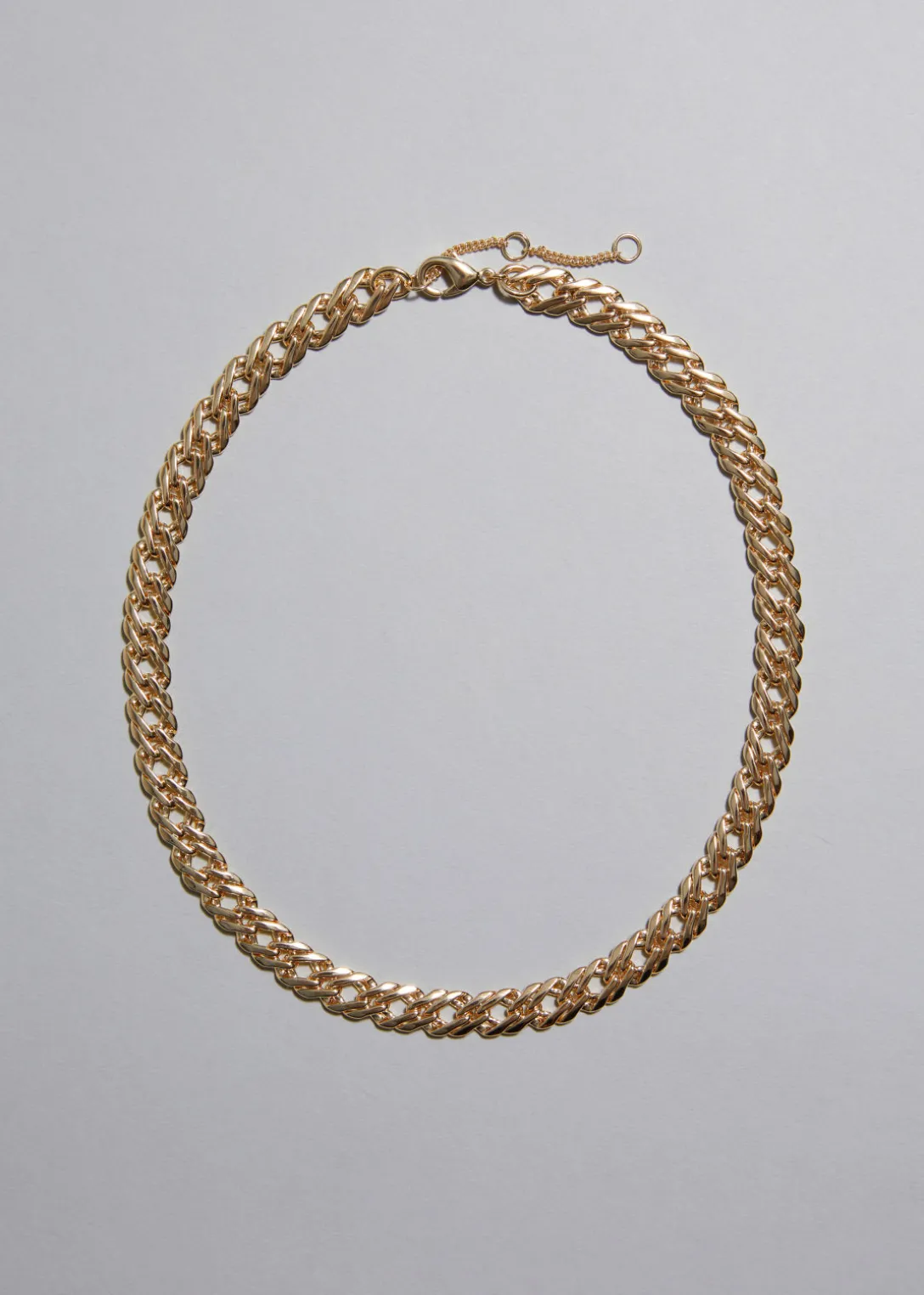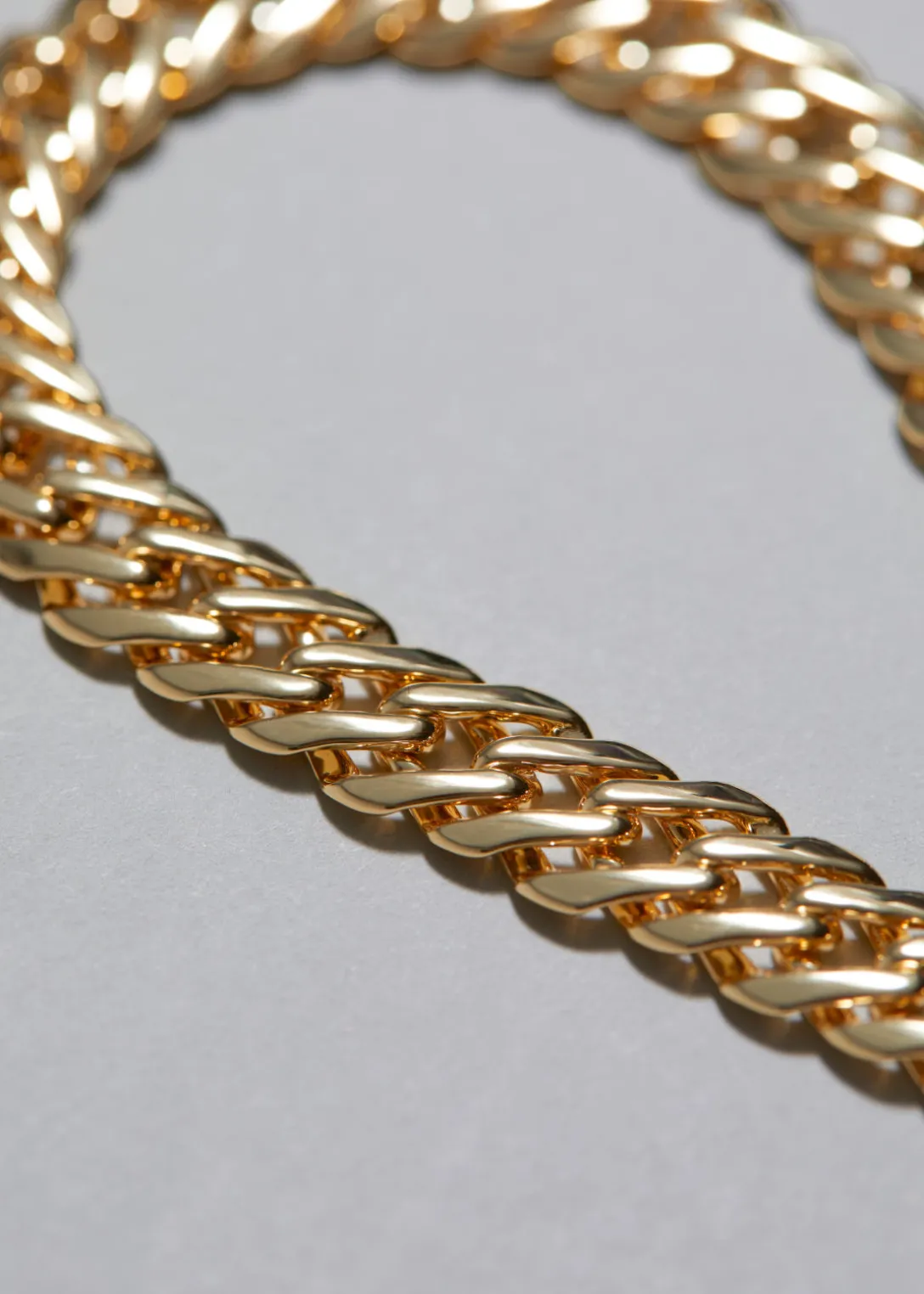 Collier épais en chaîne, confectionné en laiton poli. Doté d’un fermoir à mousqueton et d’une chaîne d’extension.