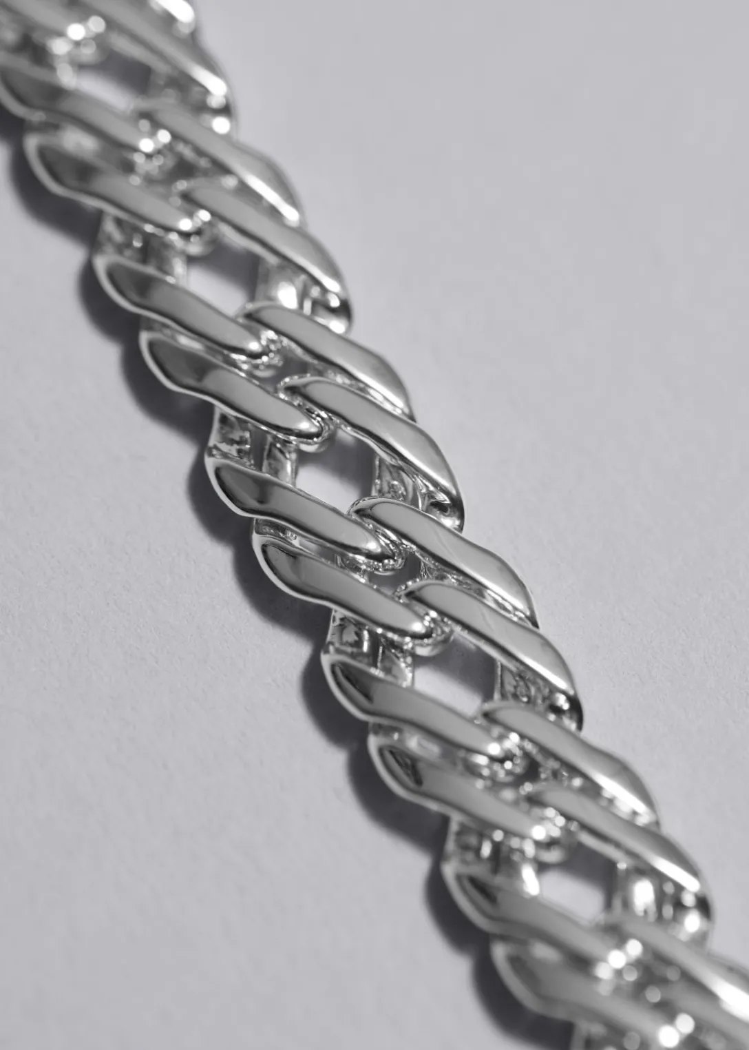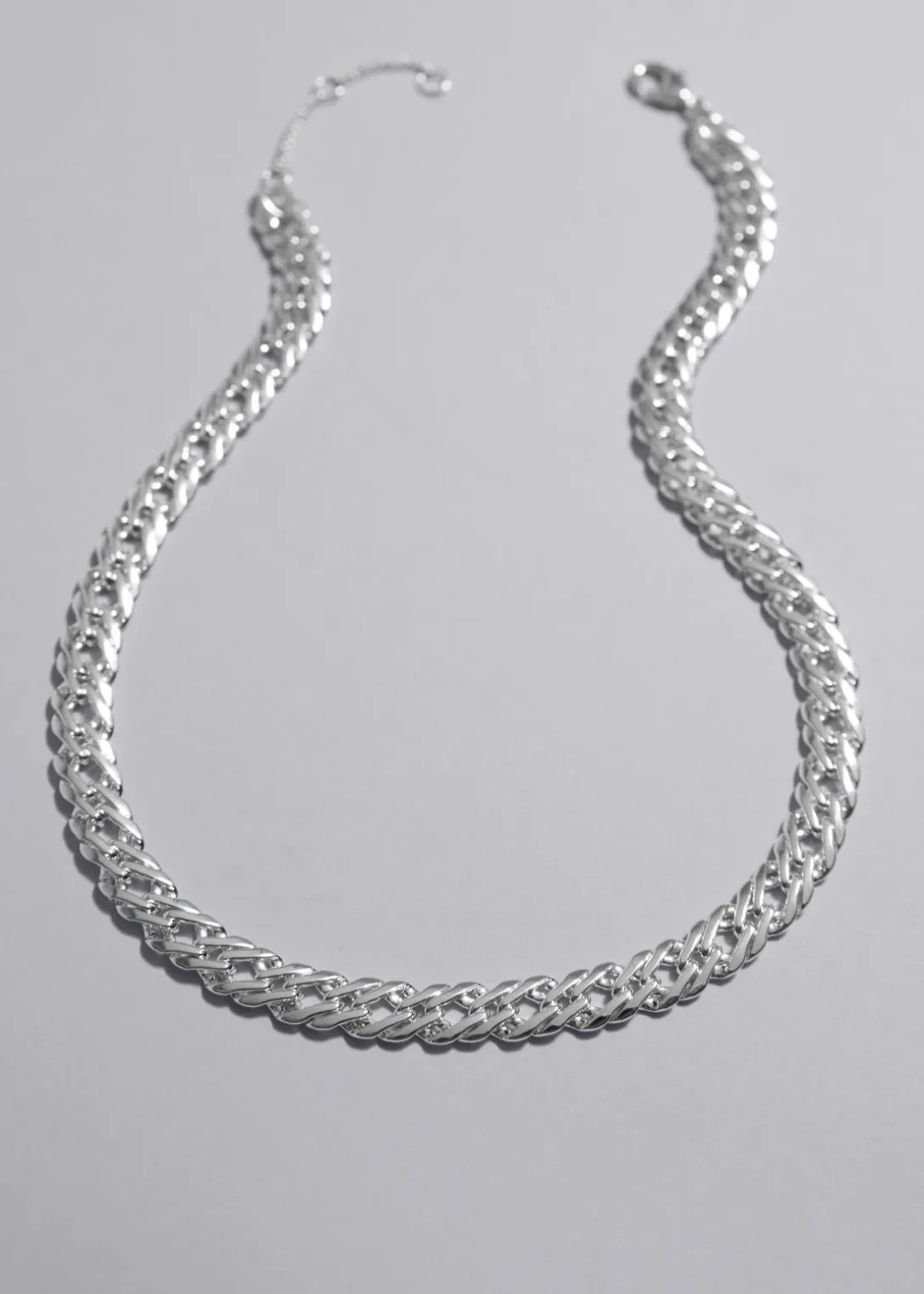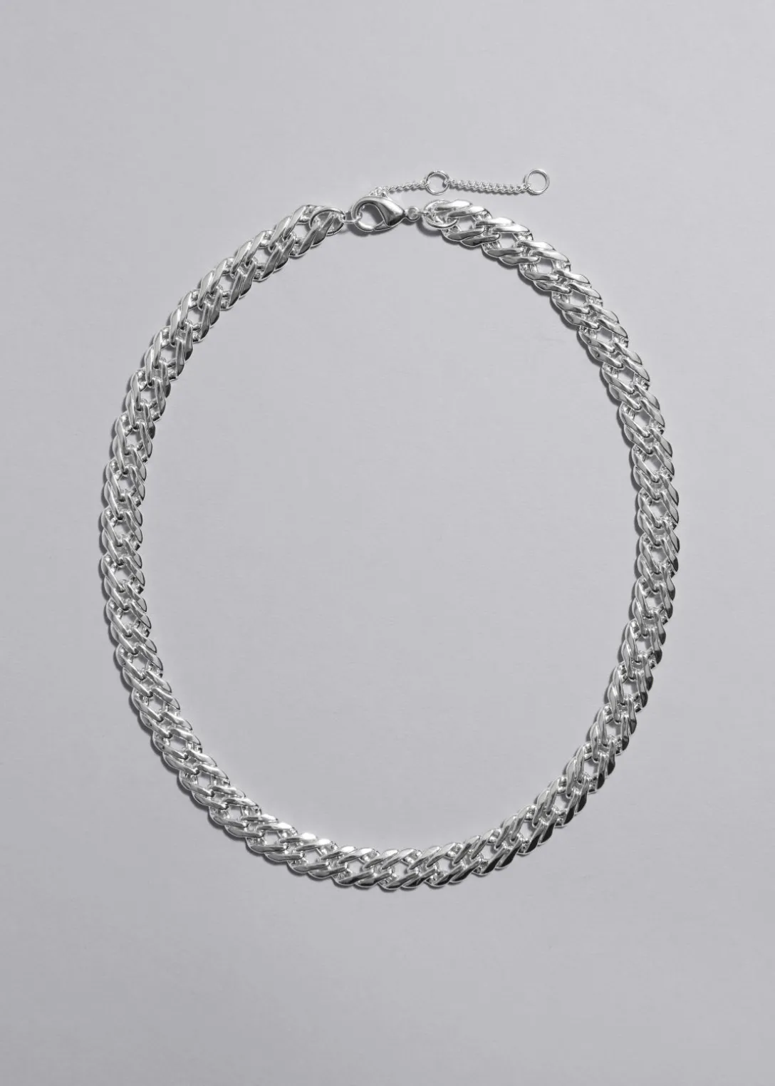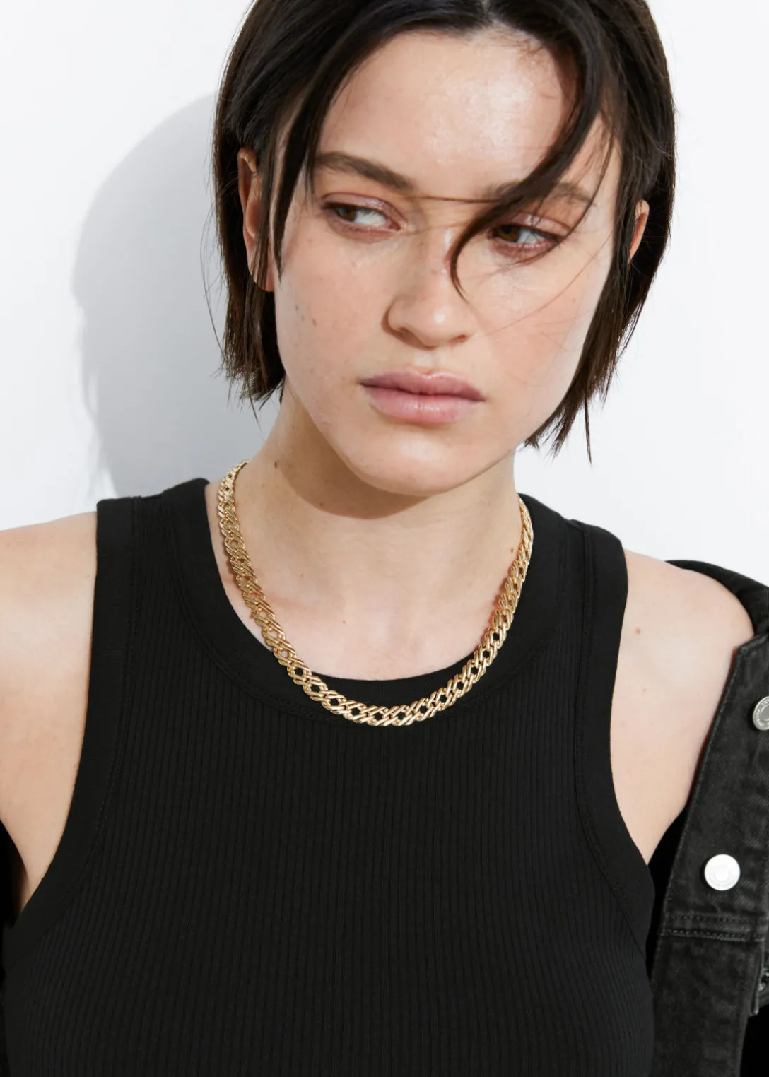 Collier épais en chaîne, confectionné en laiton poli. Doté d’un fermoir à mousqueton et d’une chaîne d’extension.