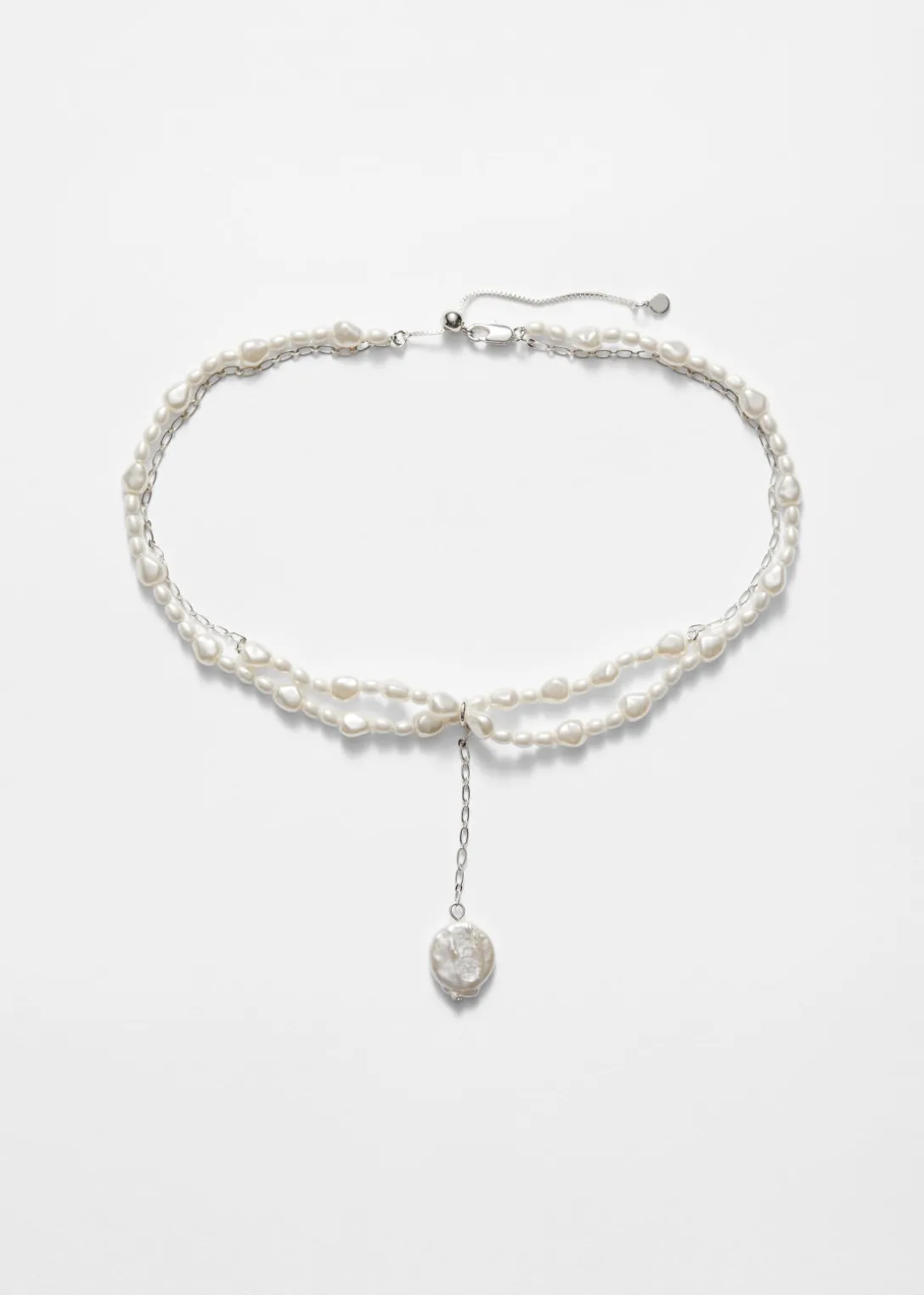 Confectionné en laiton plaqué argent, ce collier court est orné de deux rangées de perles brillantes. Au centre, il présente un pendentif à perle d’eau douce et une chaîne d’extension pour un ajustement personnalisable.