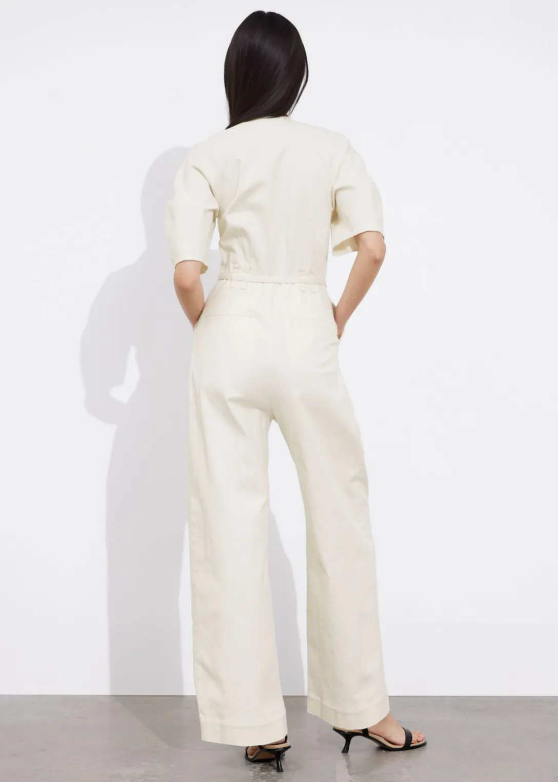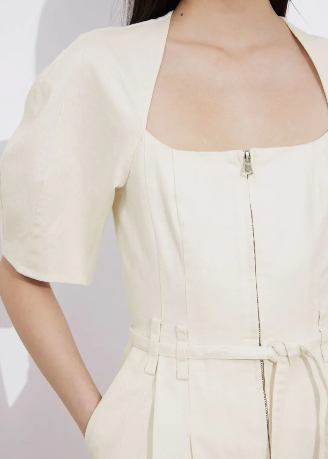 Combinaison avec une encolure carrée et des manches trois-quarts. Dotée d’une ceinture fine assortie à nouer.