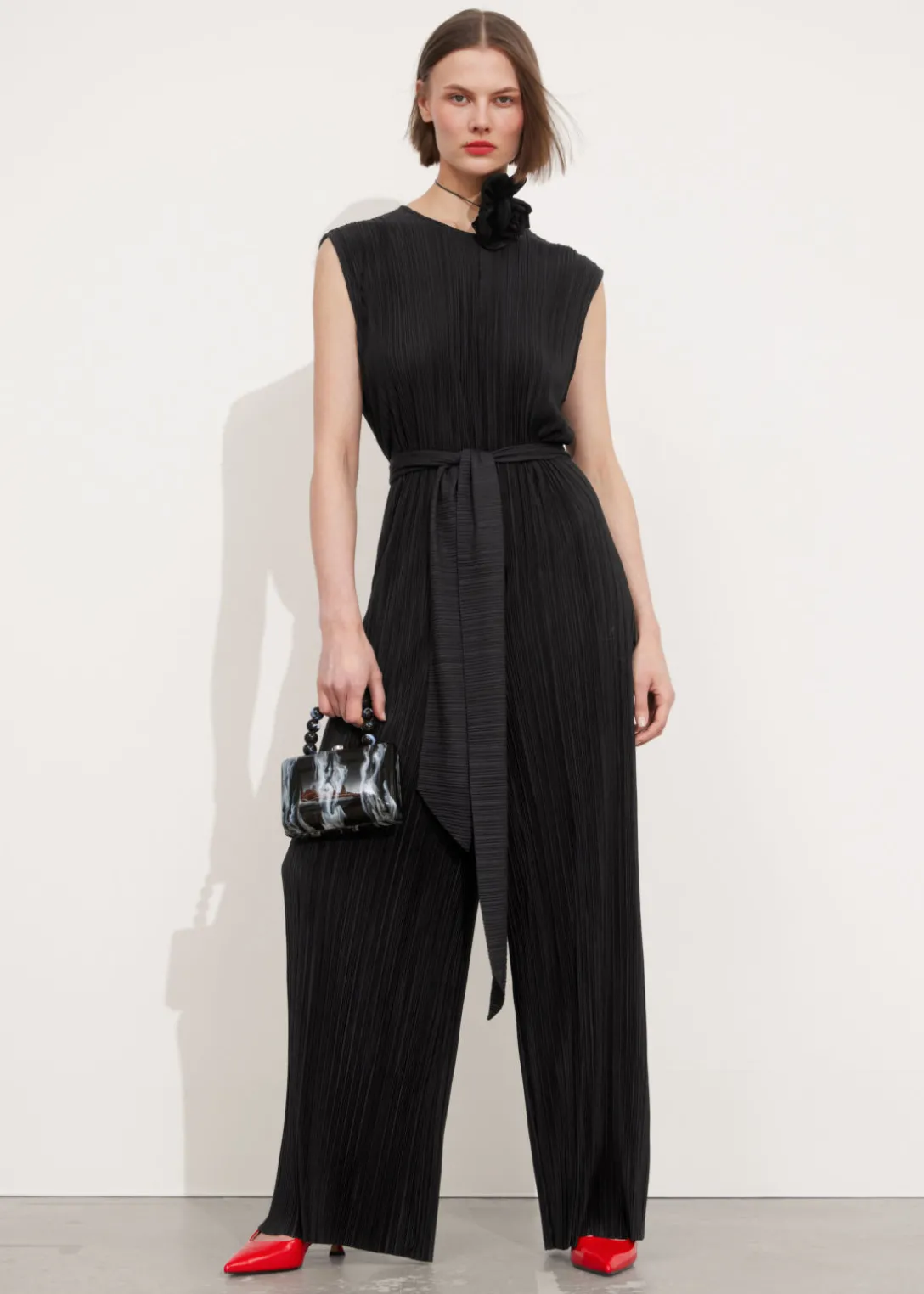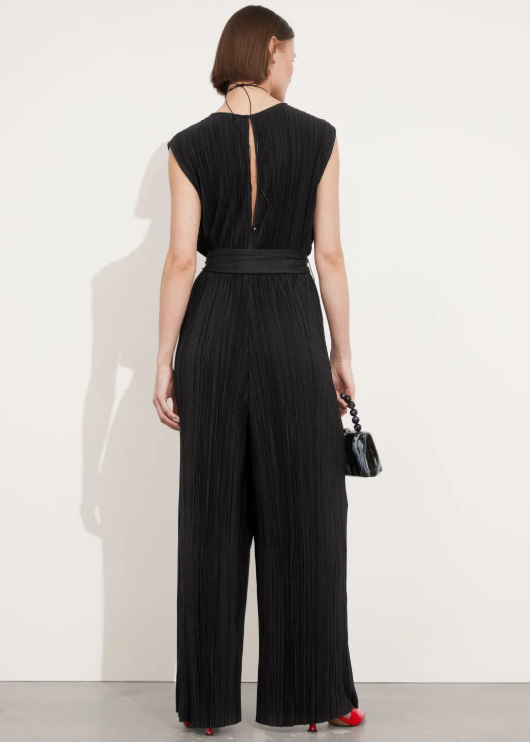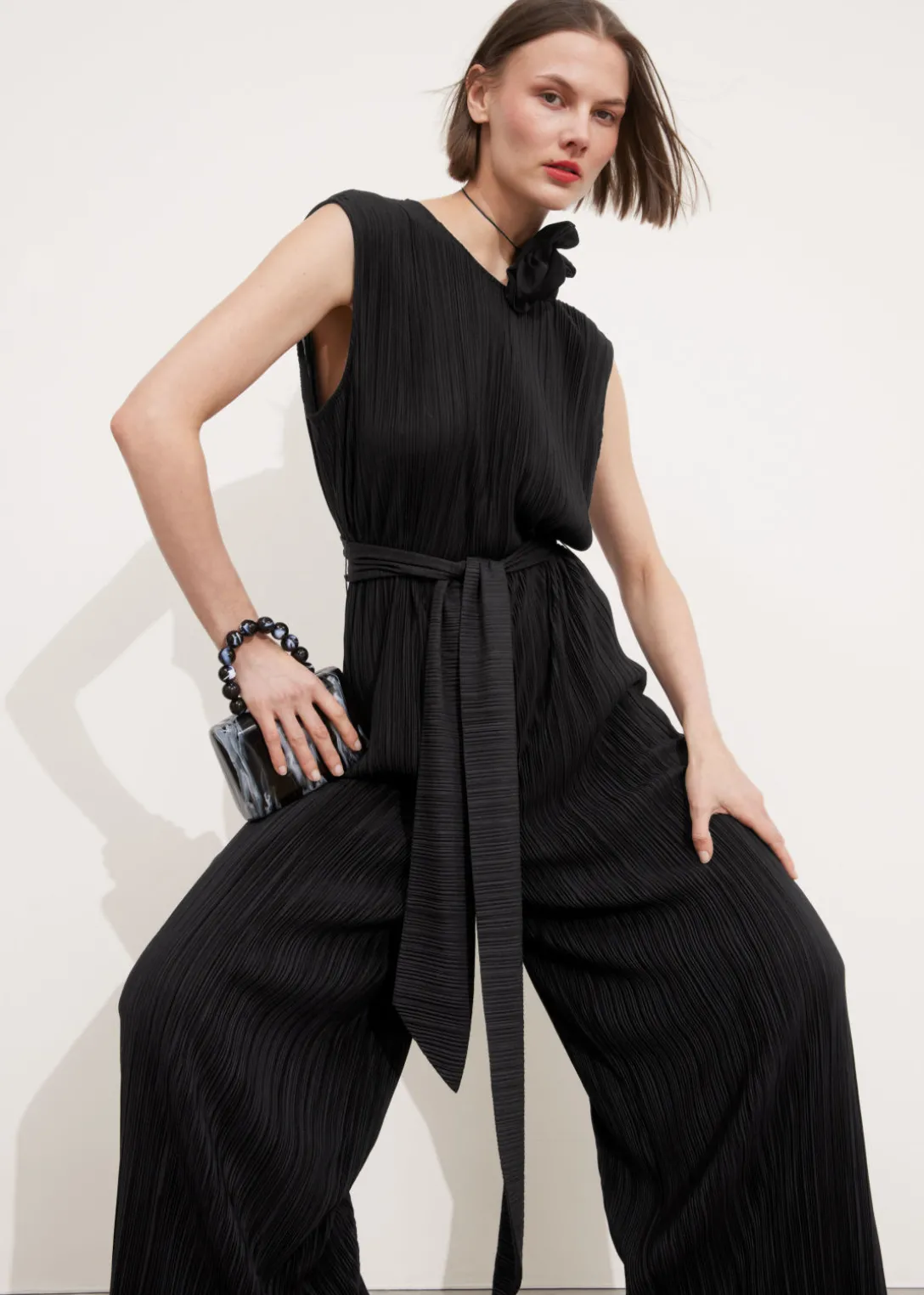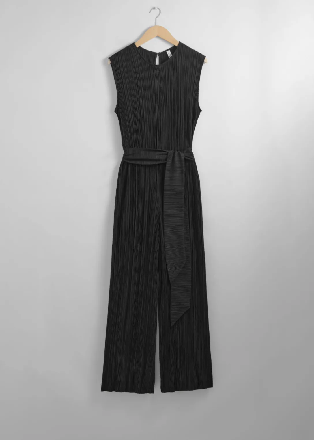 Combinaison palazzo plissée sans manches, avec une ceinture ton sur ton assortie à nouer.