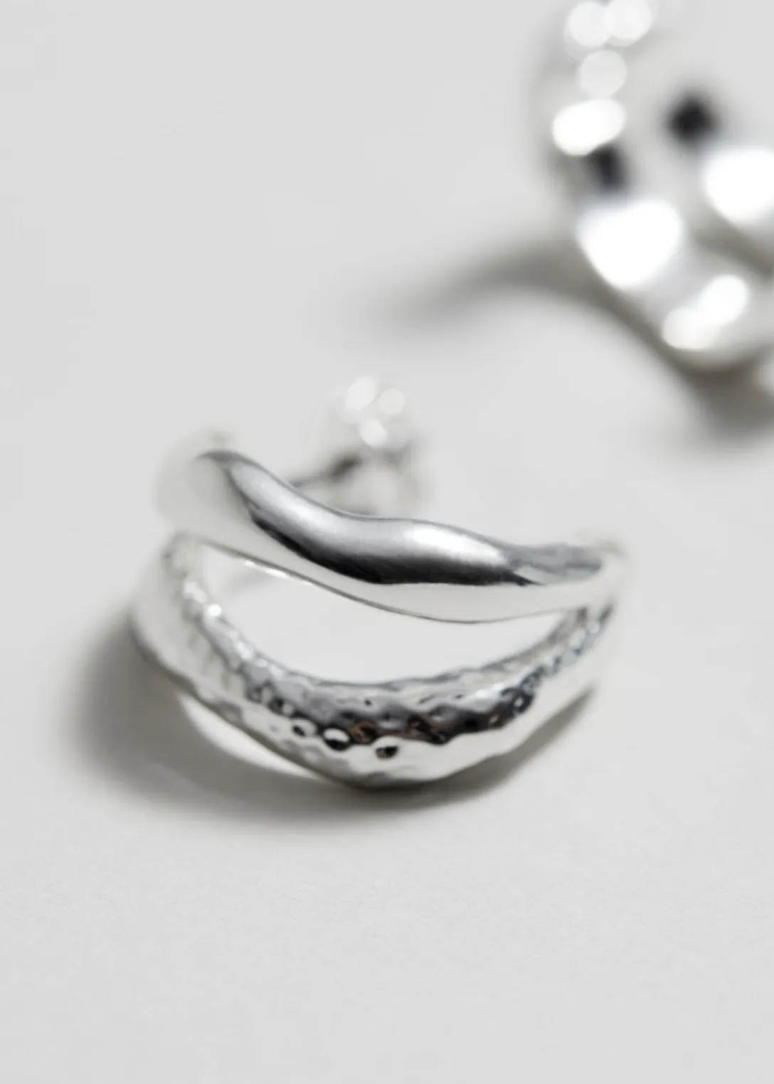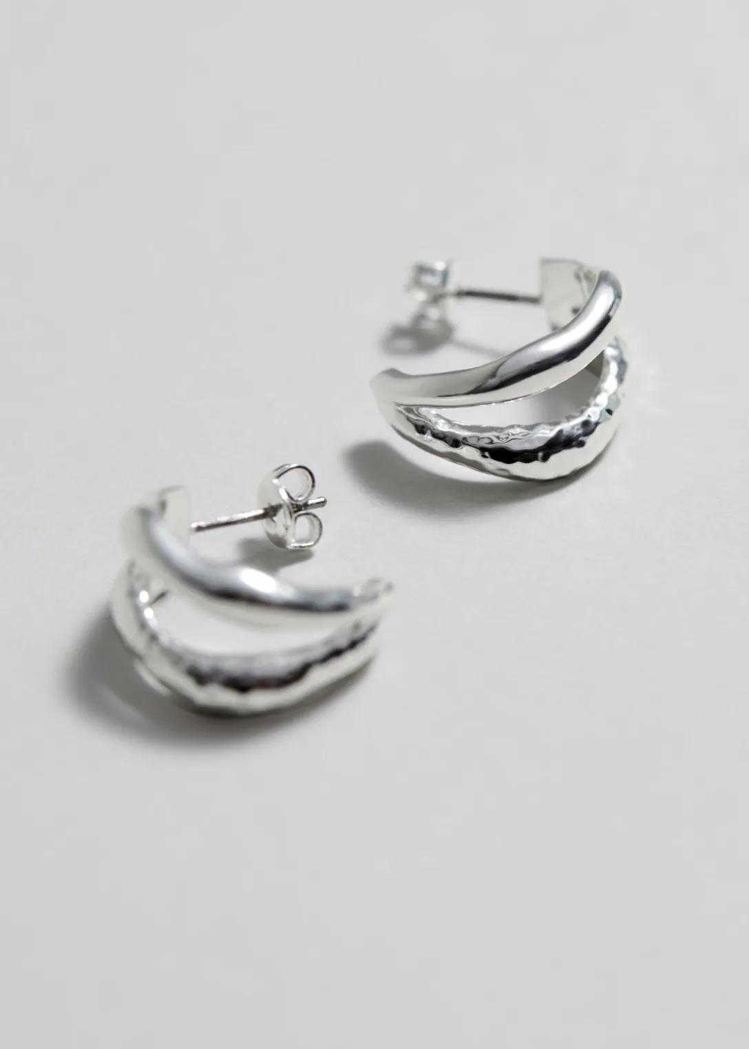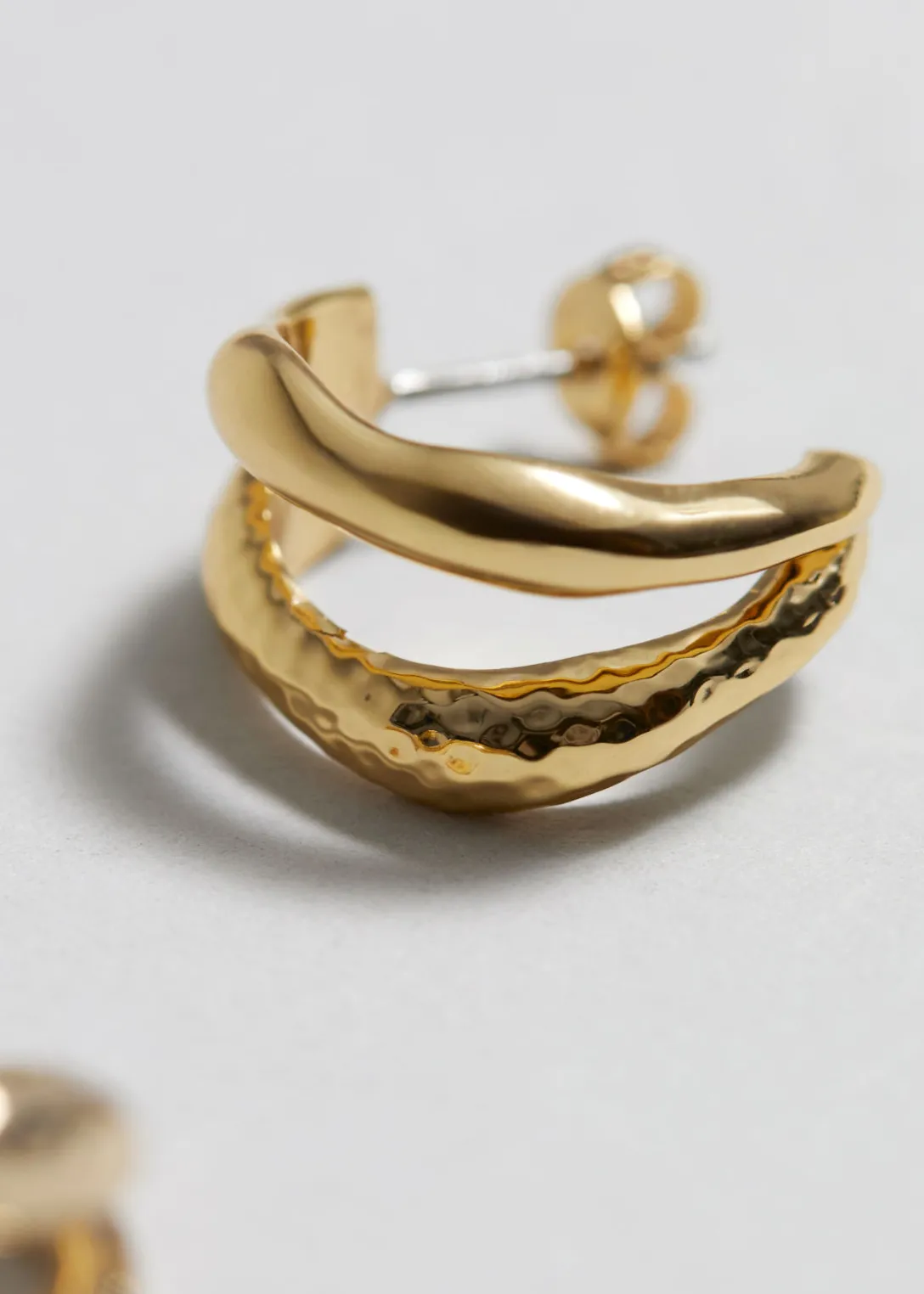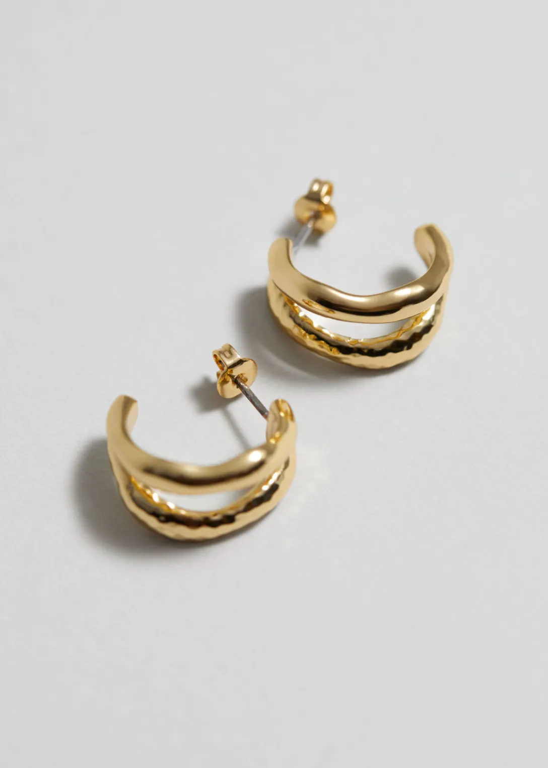 Boucles d’oreilles composées de deux créoles, l’une lisse et l’autre structurée. Confectionnées en laiton poli, elles possèdent des fermoirs papillon.