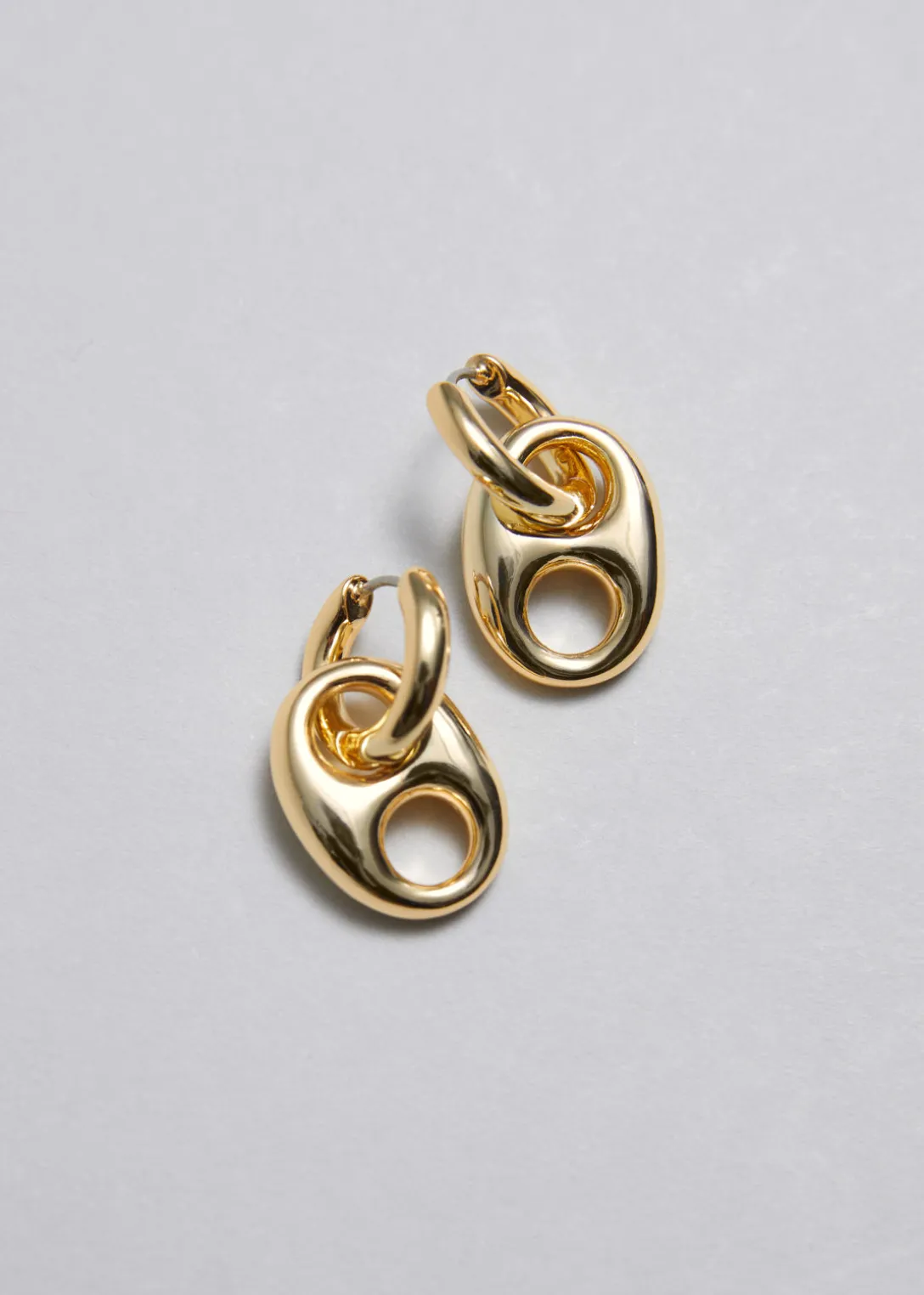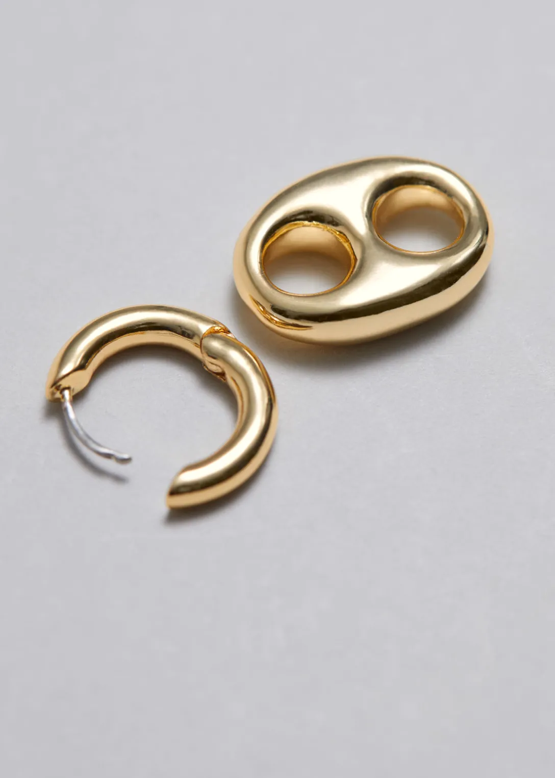 Confectionnées en zinc plaqué, ces boucles d’oreilles présentent des pendentifs sculpturaux épais pouvant être enlevés pour un look plus simple.