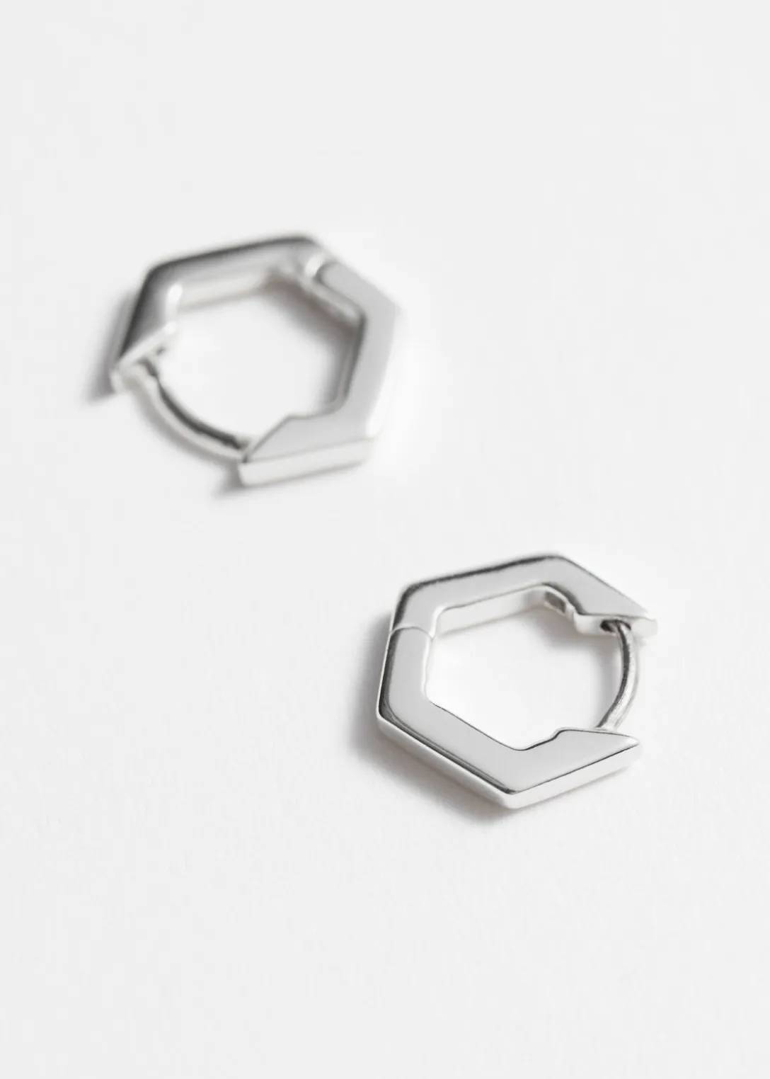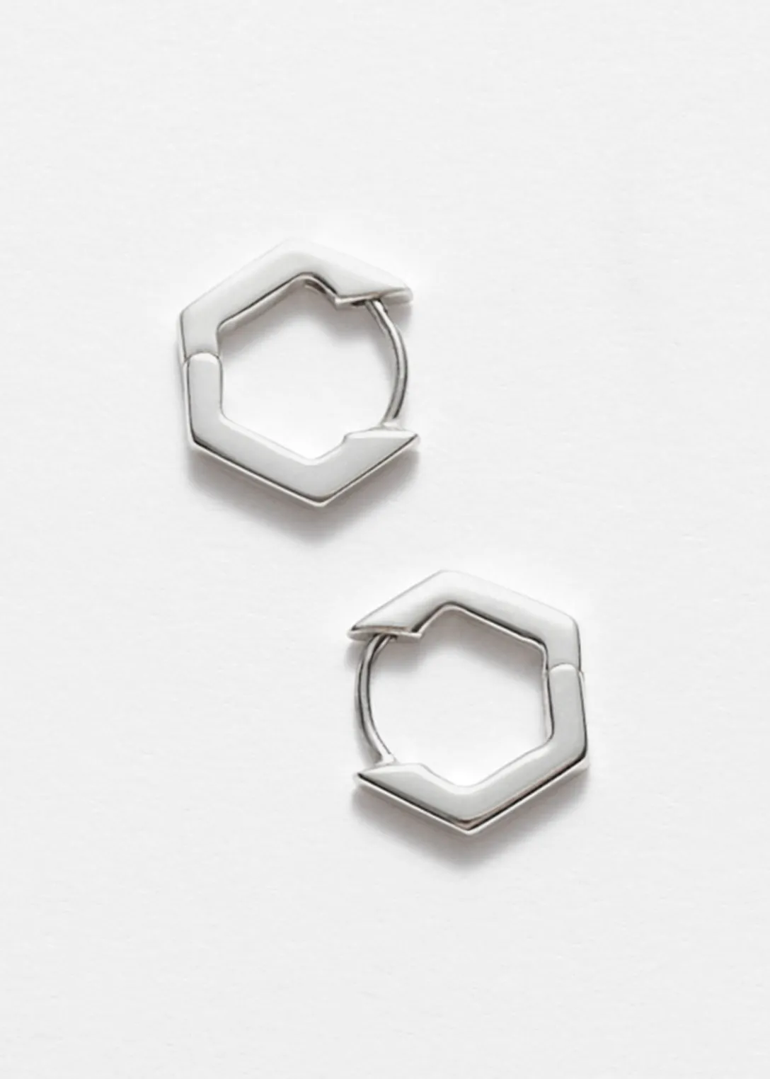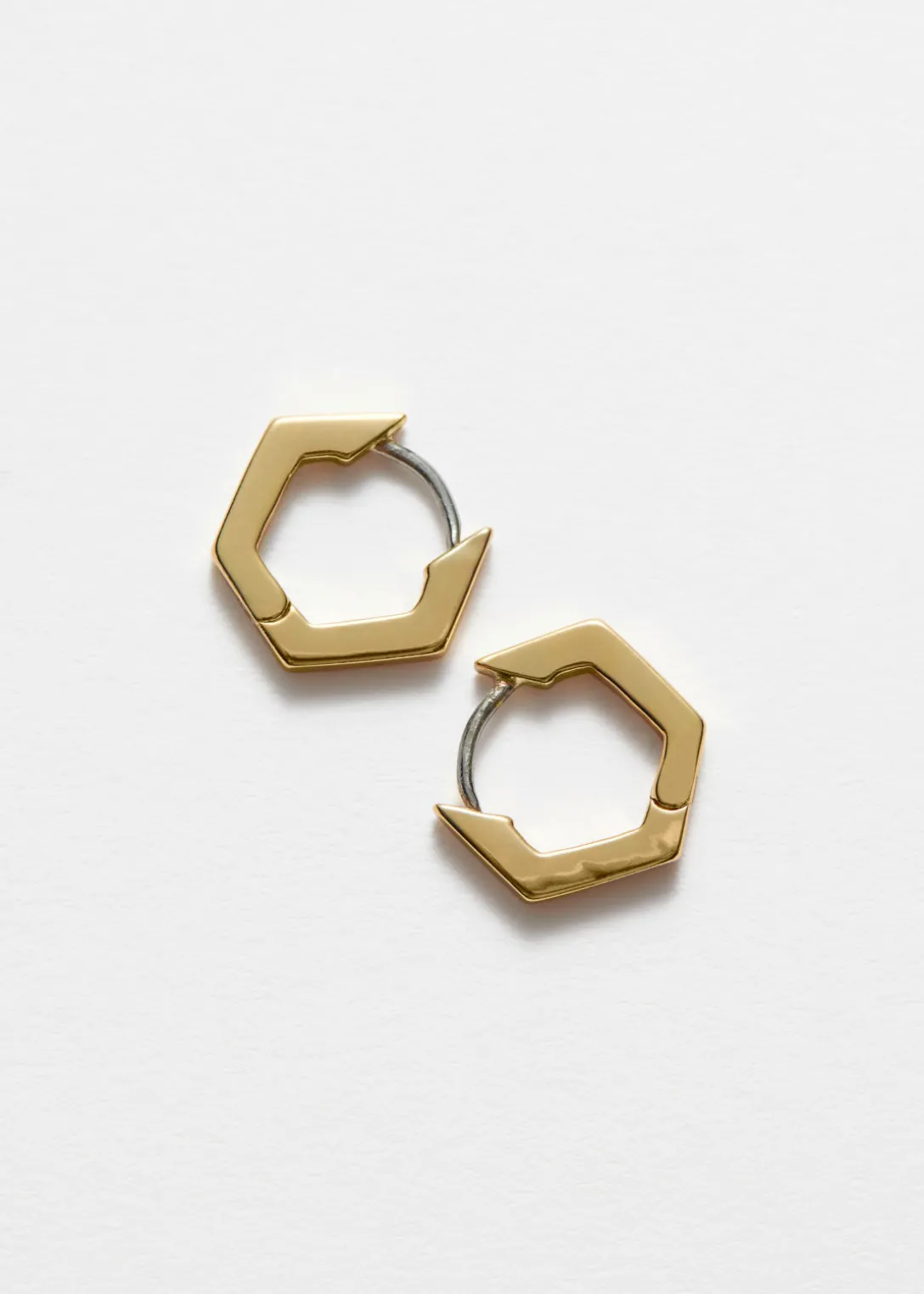 Inspirées par la précision de la géométrie, ces créoles en laiton poli présentent une forme hexagonale.