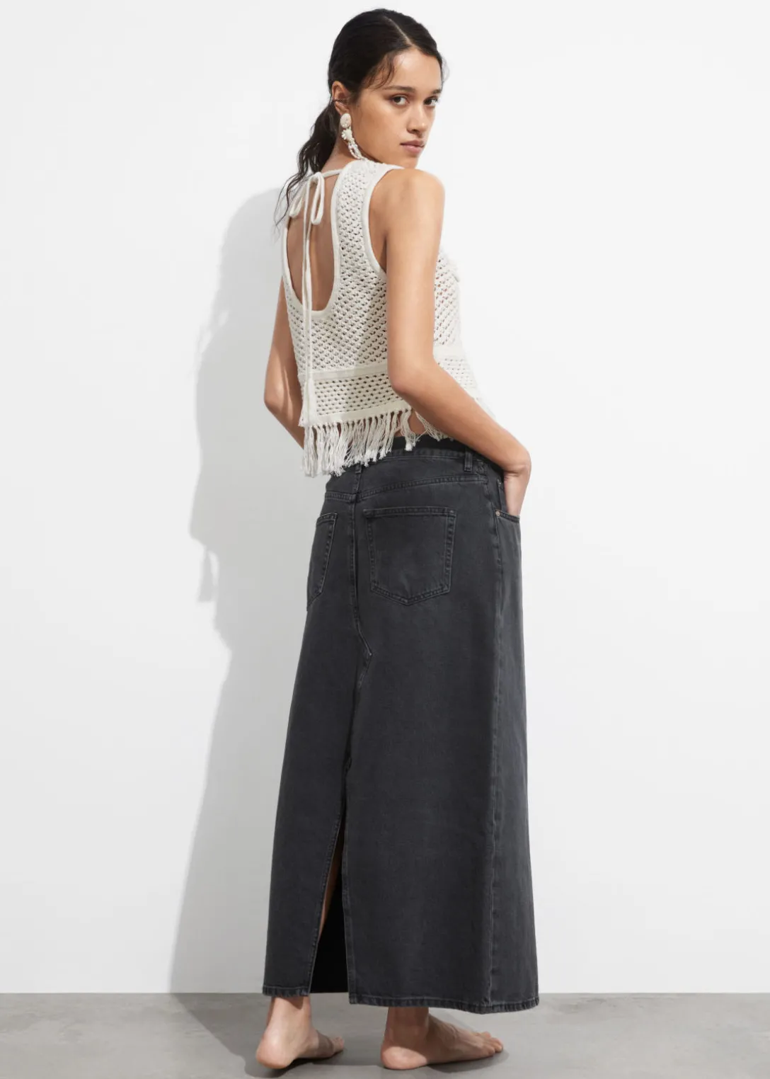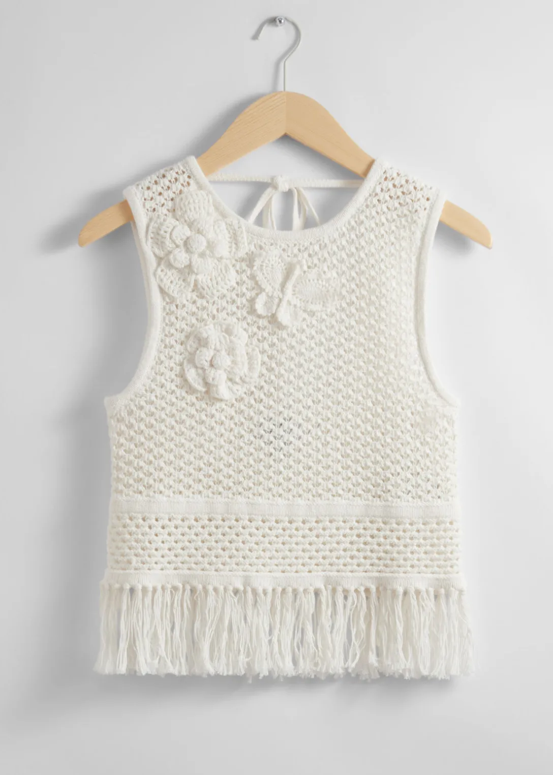 Débardeur crocheté avec des motifs floraux appliqués au niveau de la poitrine et un ourlet à franges. Doté d’un dos échancré avec un lien à nouer au niveau de la nuque.