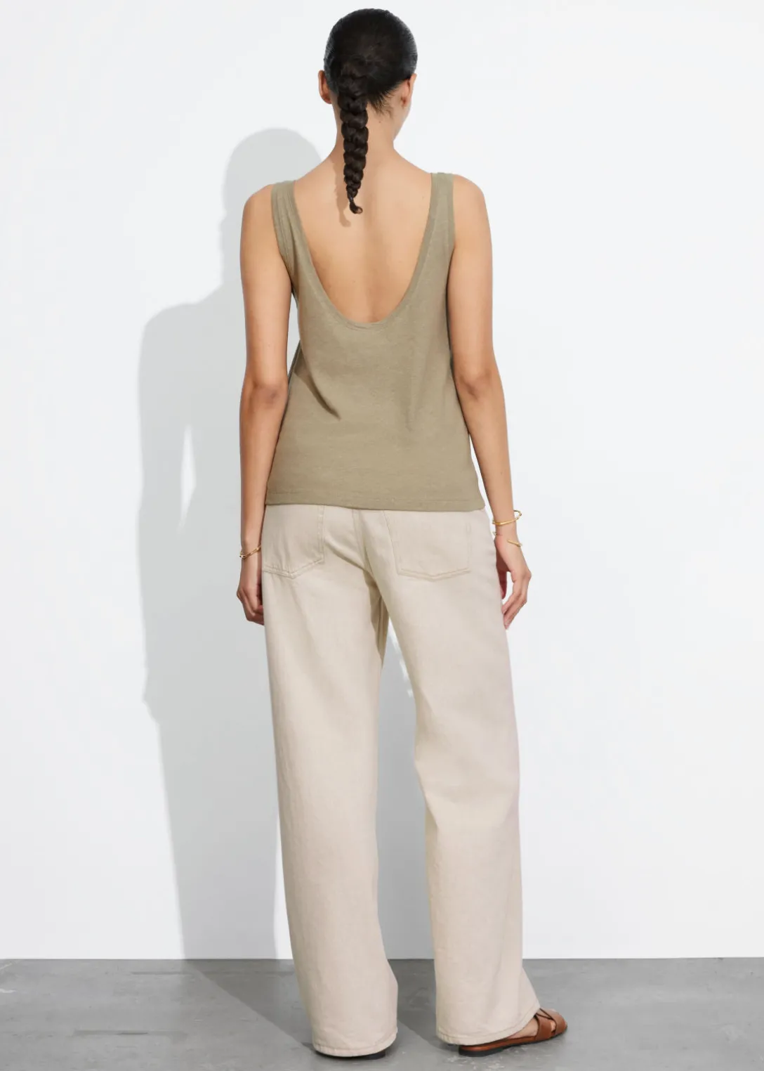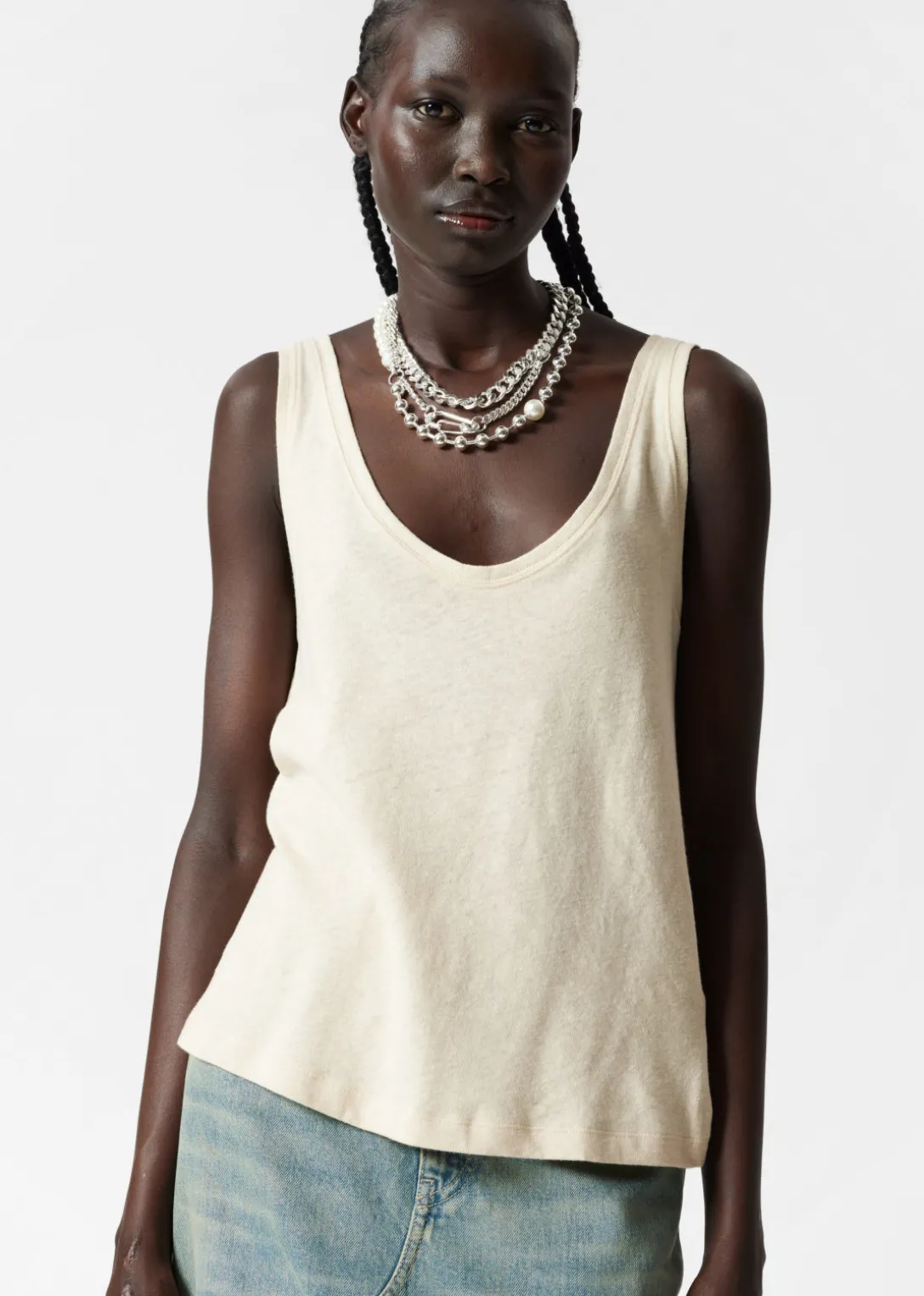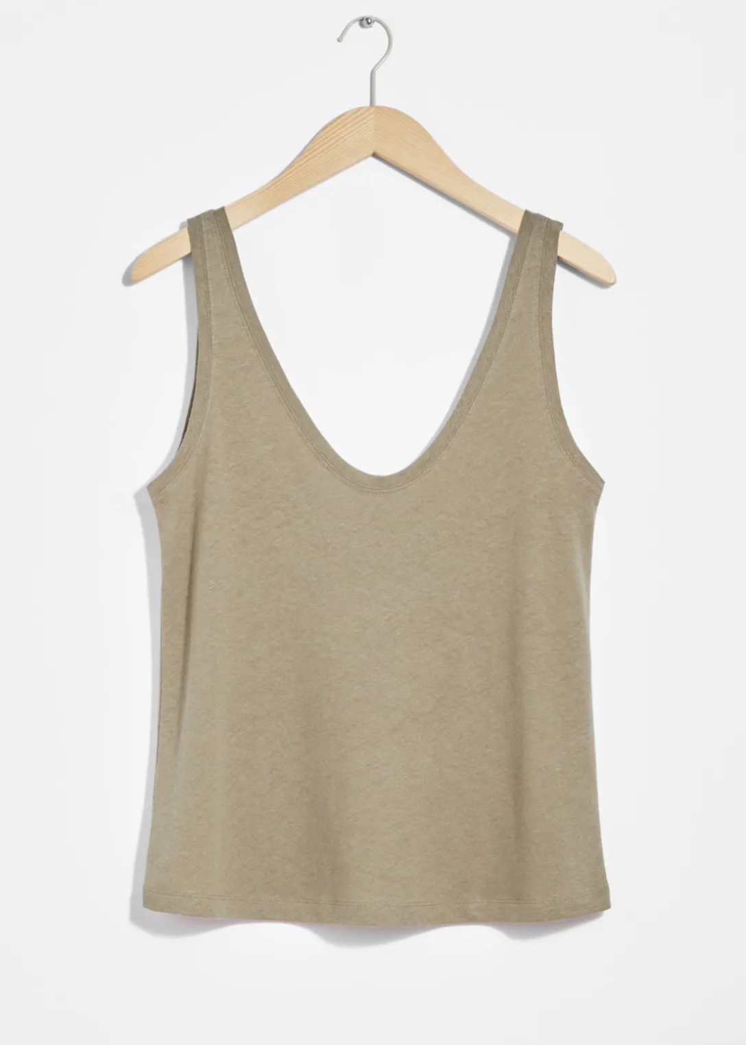 Débardeur confectionné à partir de lin et de coton. Doté d’une encolure en V.