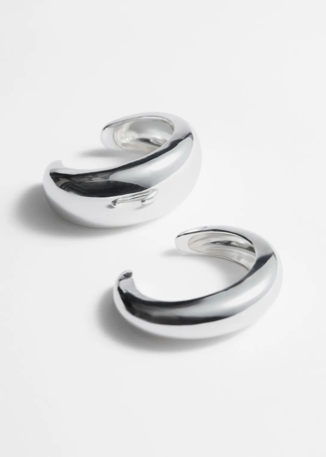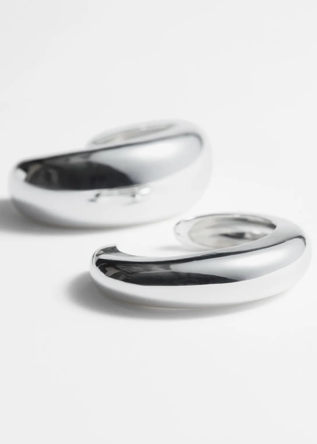 Ces deux bracelets manchette sont fabriqués en métal argenté avec une forme sculpturale bombée et une finition très brillante. L’ouverture signifie qu’ils s’enfilent et s’enlèvent facilement. Portez-les empilés ensemble ou à chaque poignet.