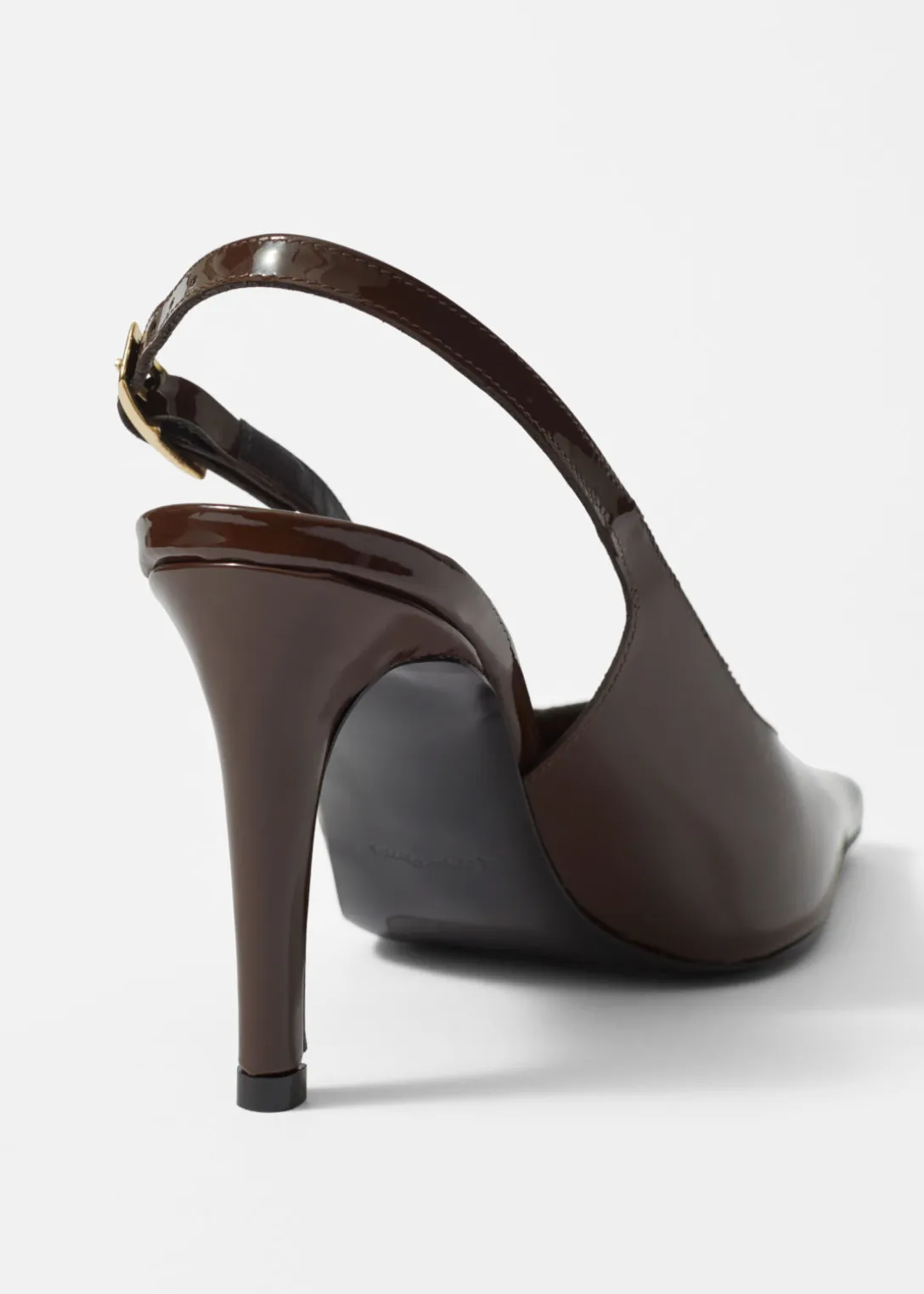 Confectionnés au Portugal à partir de cuir verni brillant, ces escarpins possèdent des talons effilés. Leurs boucles dorées rectangulaires sont des détails distinctifs de la saison.