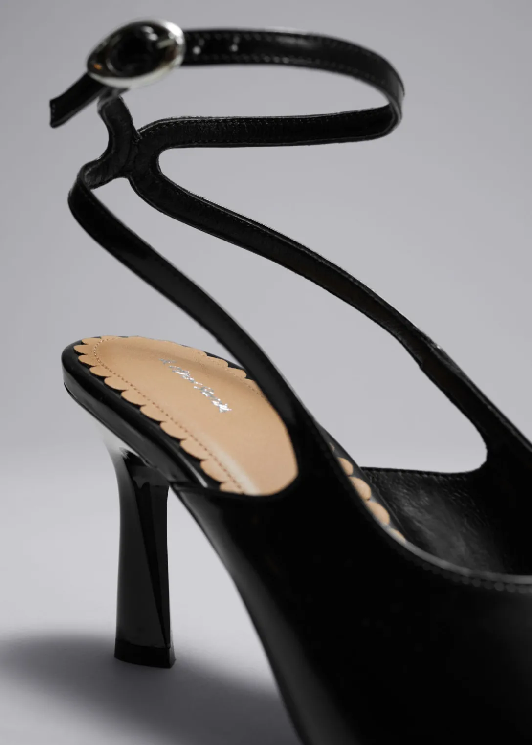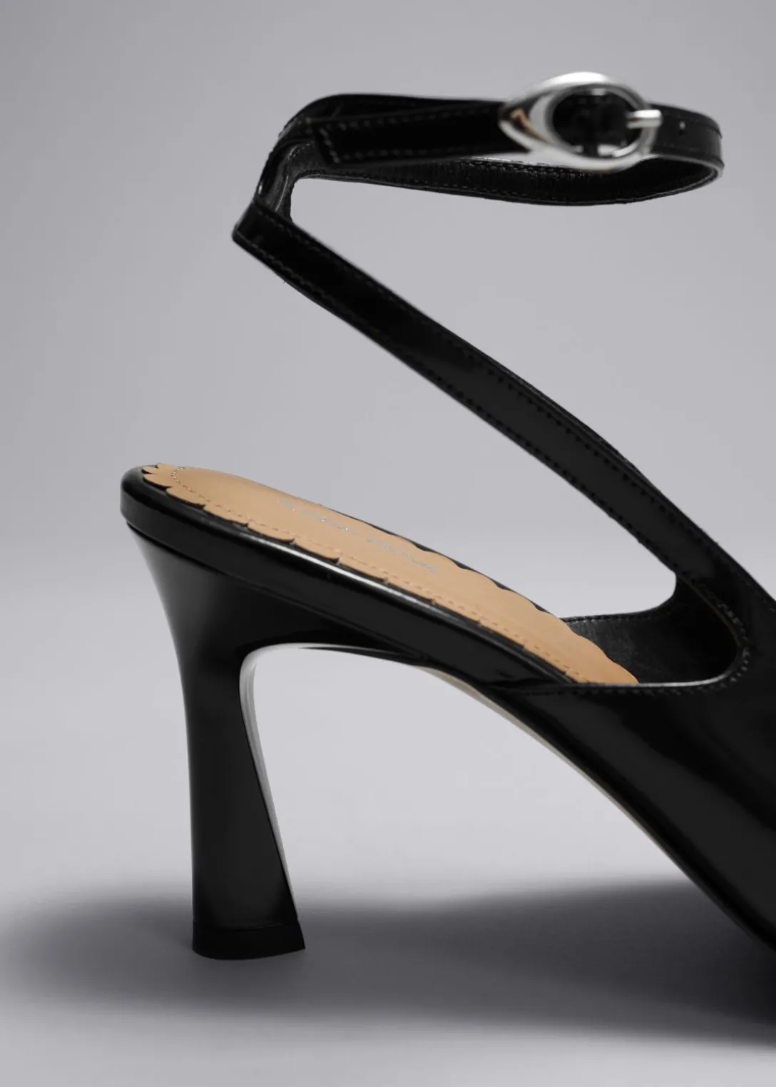Ces escarpins intemporels sont confectionnés au Portugal à partir de cuir souple, avec des bouts pointus élégants et des talons pratiques. Ils sont ornés de boucles argentées pour régler les brides à l’arrière.