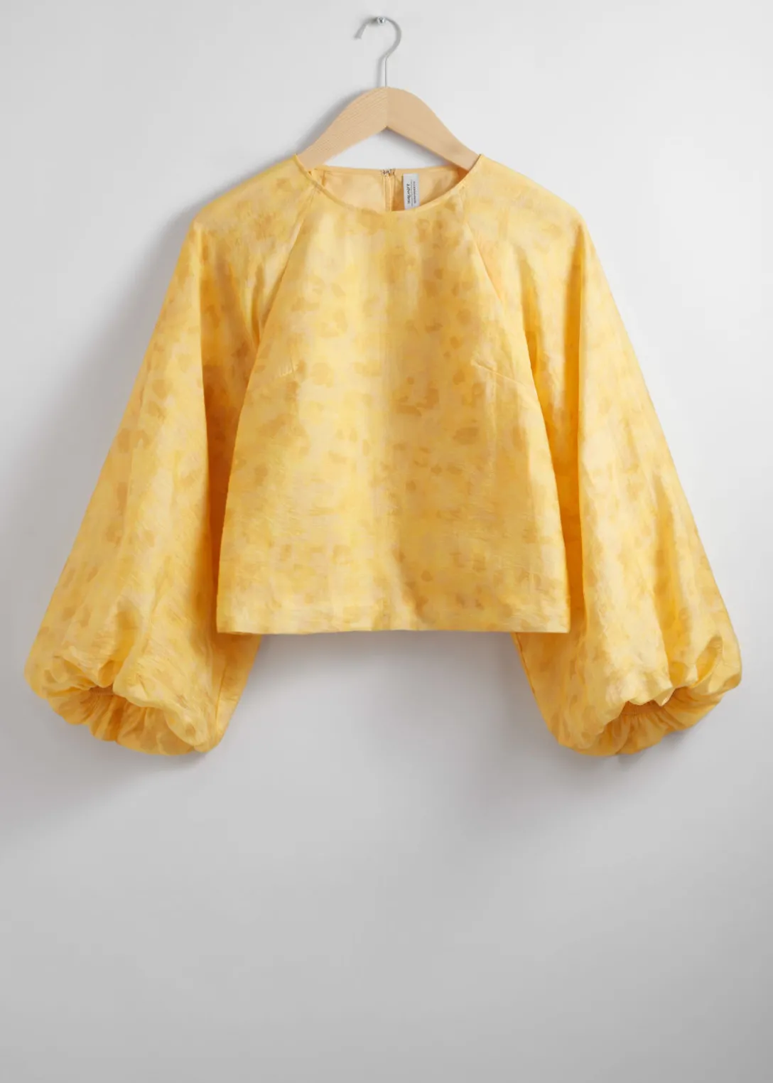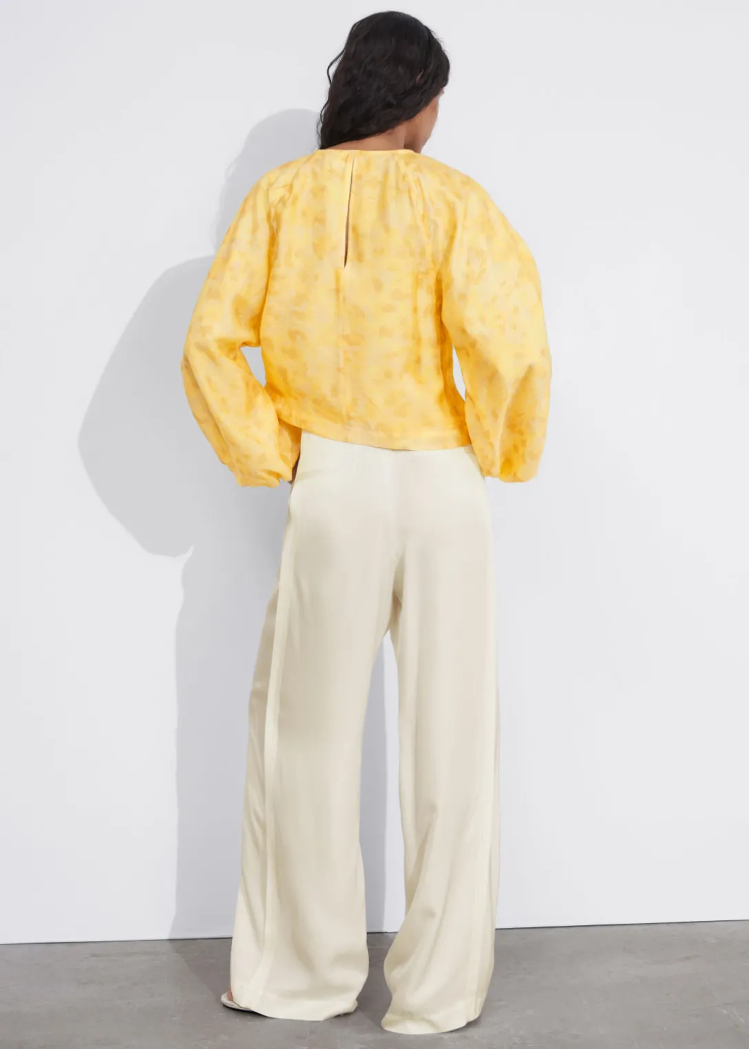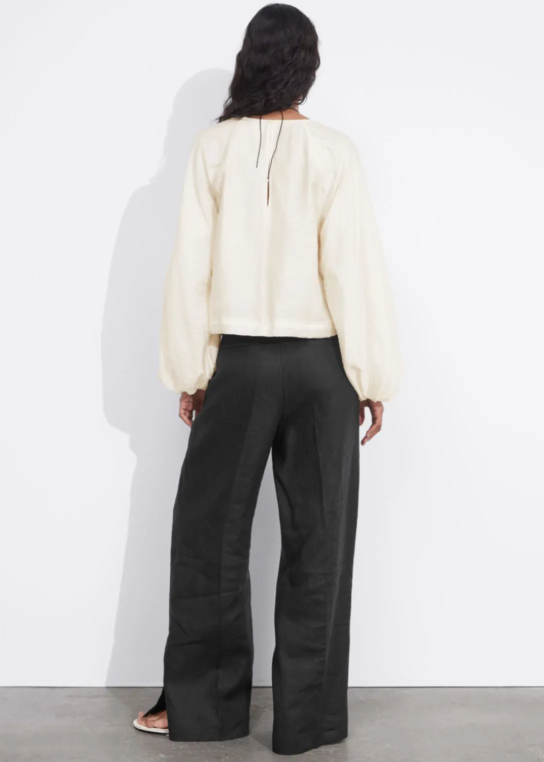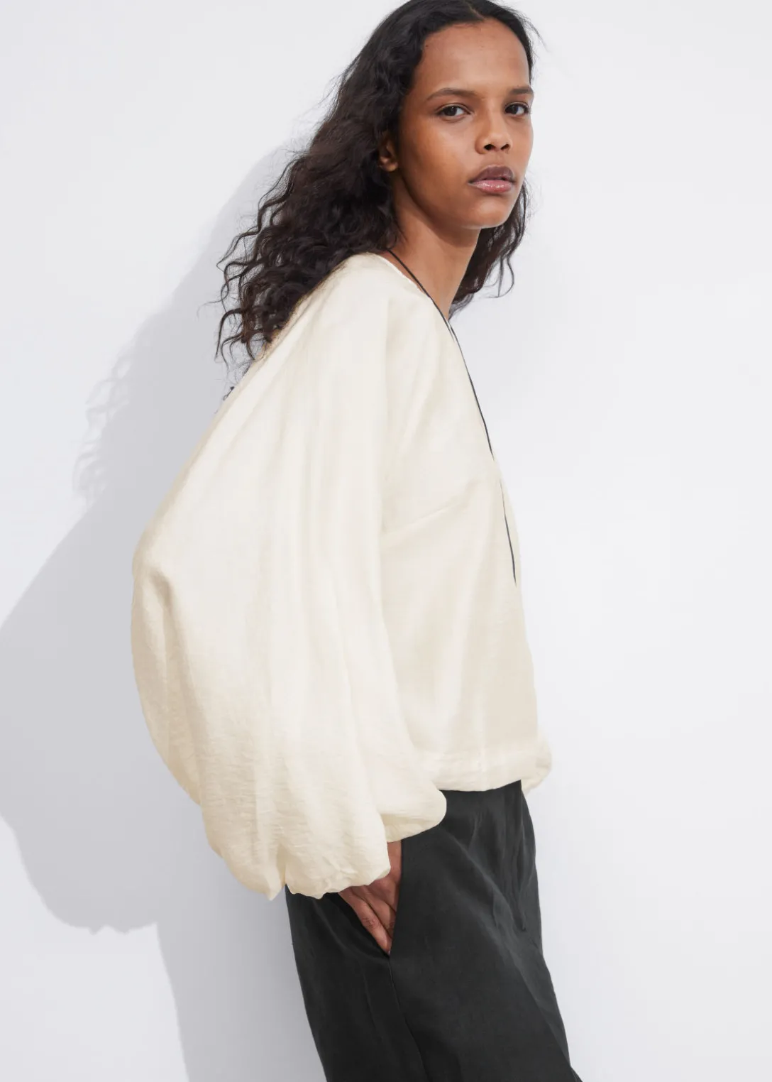 Haut avec une encolure arrondie et des manches bouffantes longues aux poignets froncés.