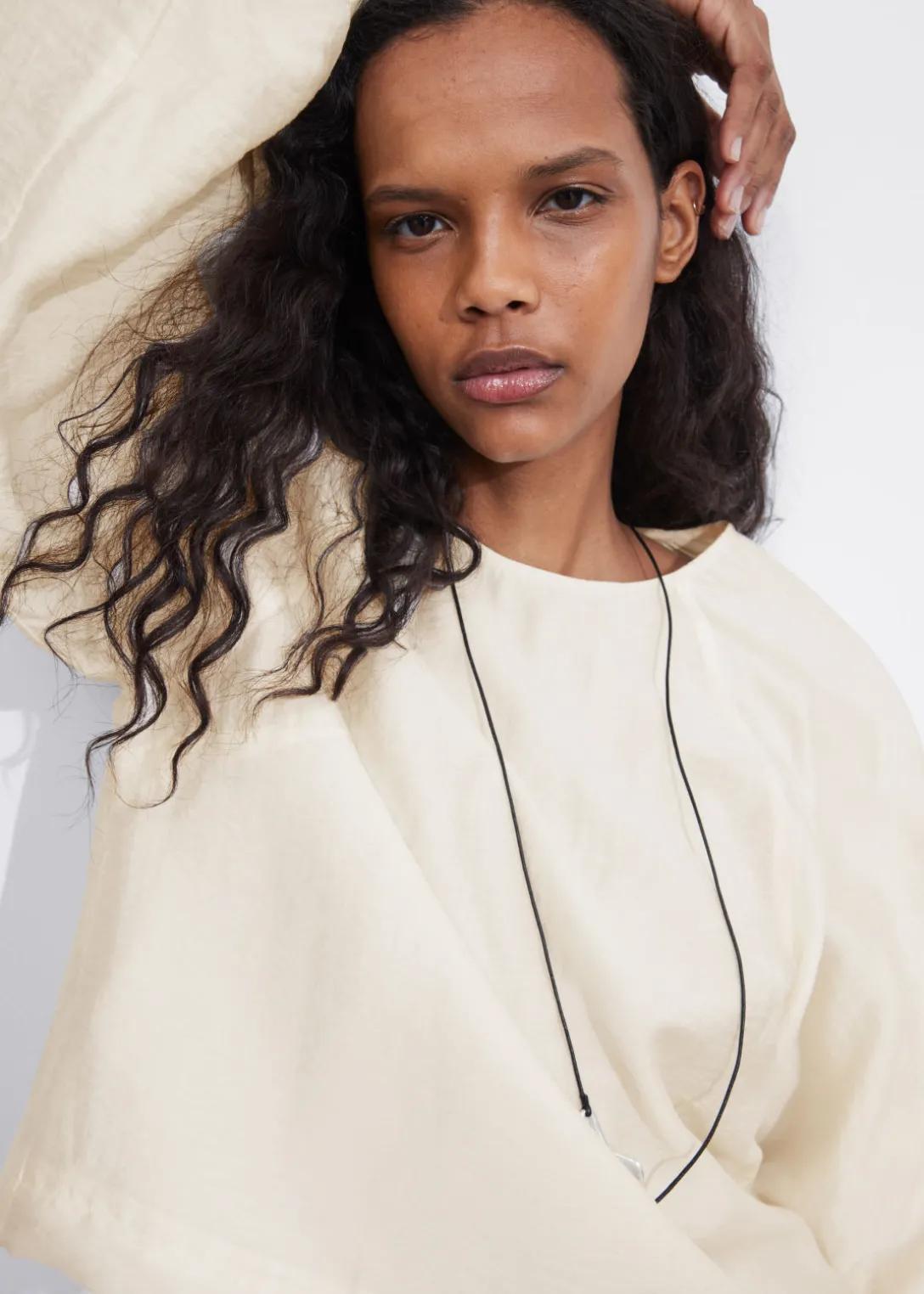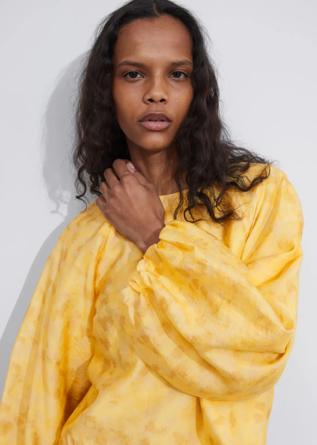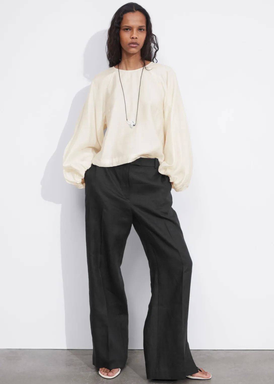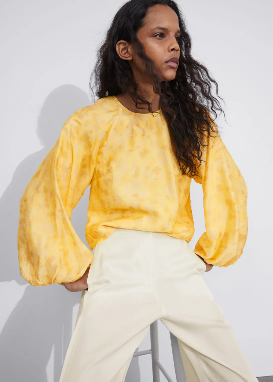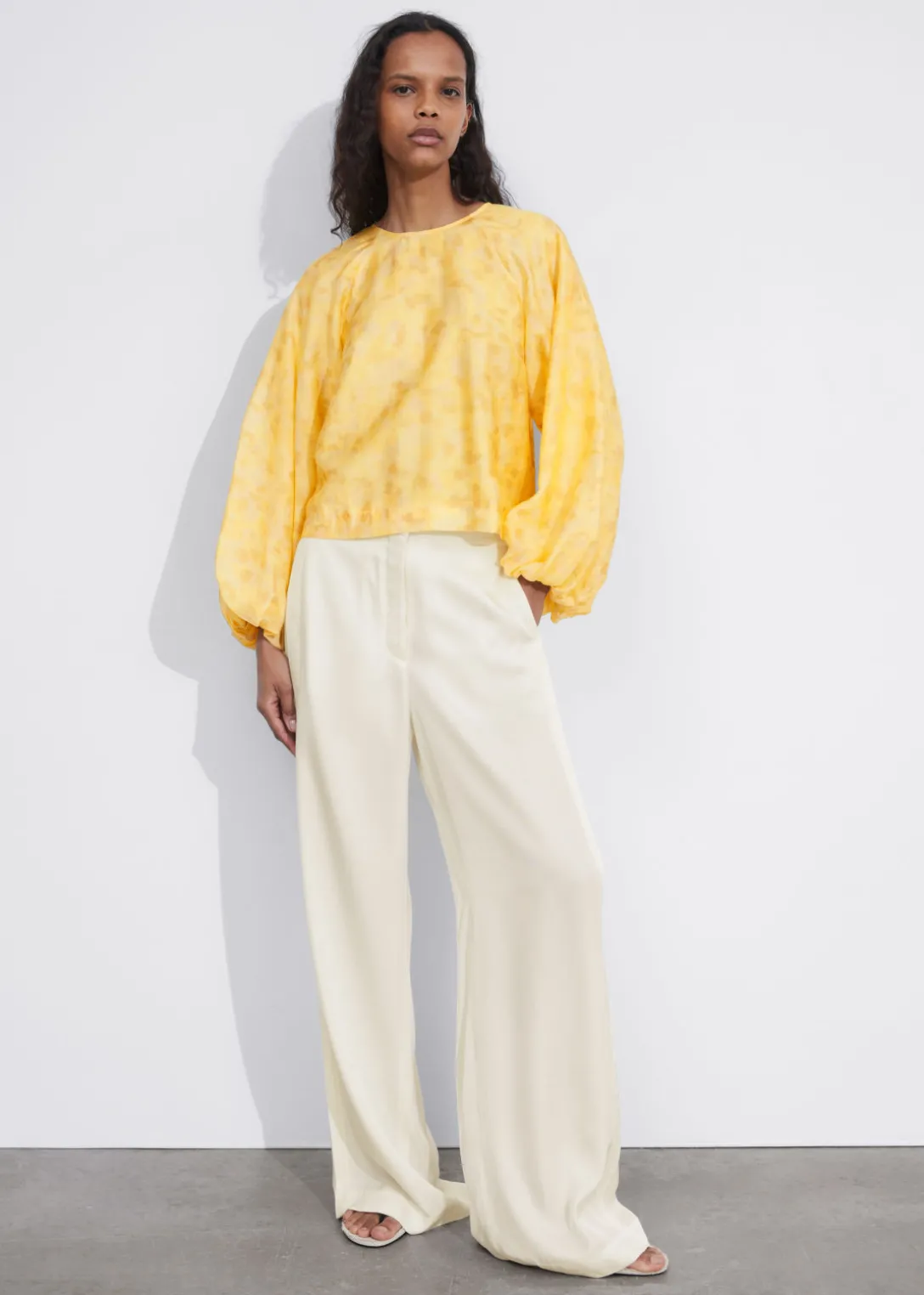 Haut avec une encolure arrondie et des manches bouffantes longues aux poignets froncés.