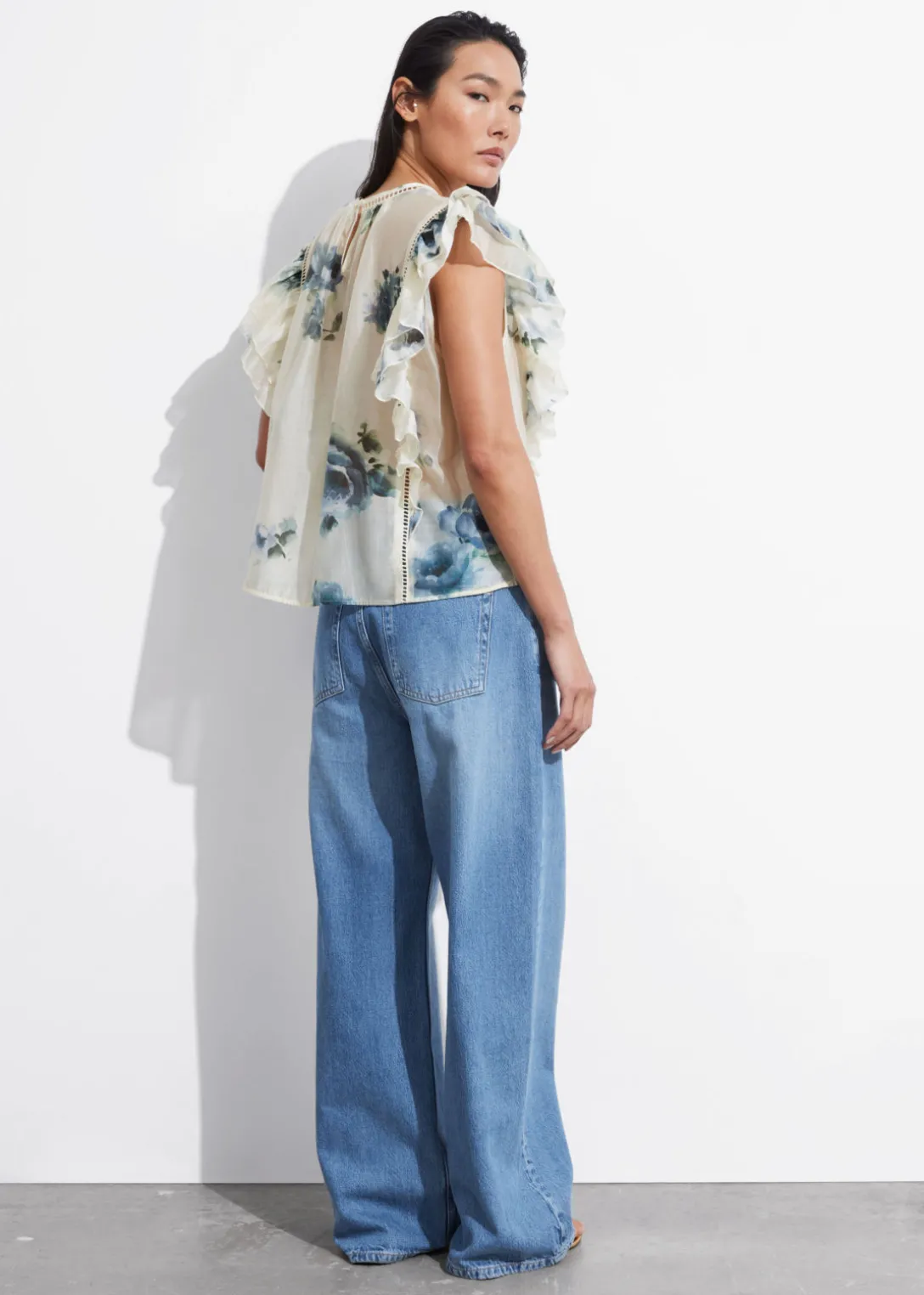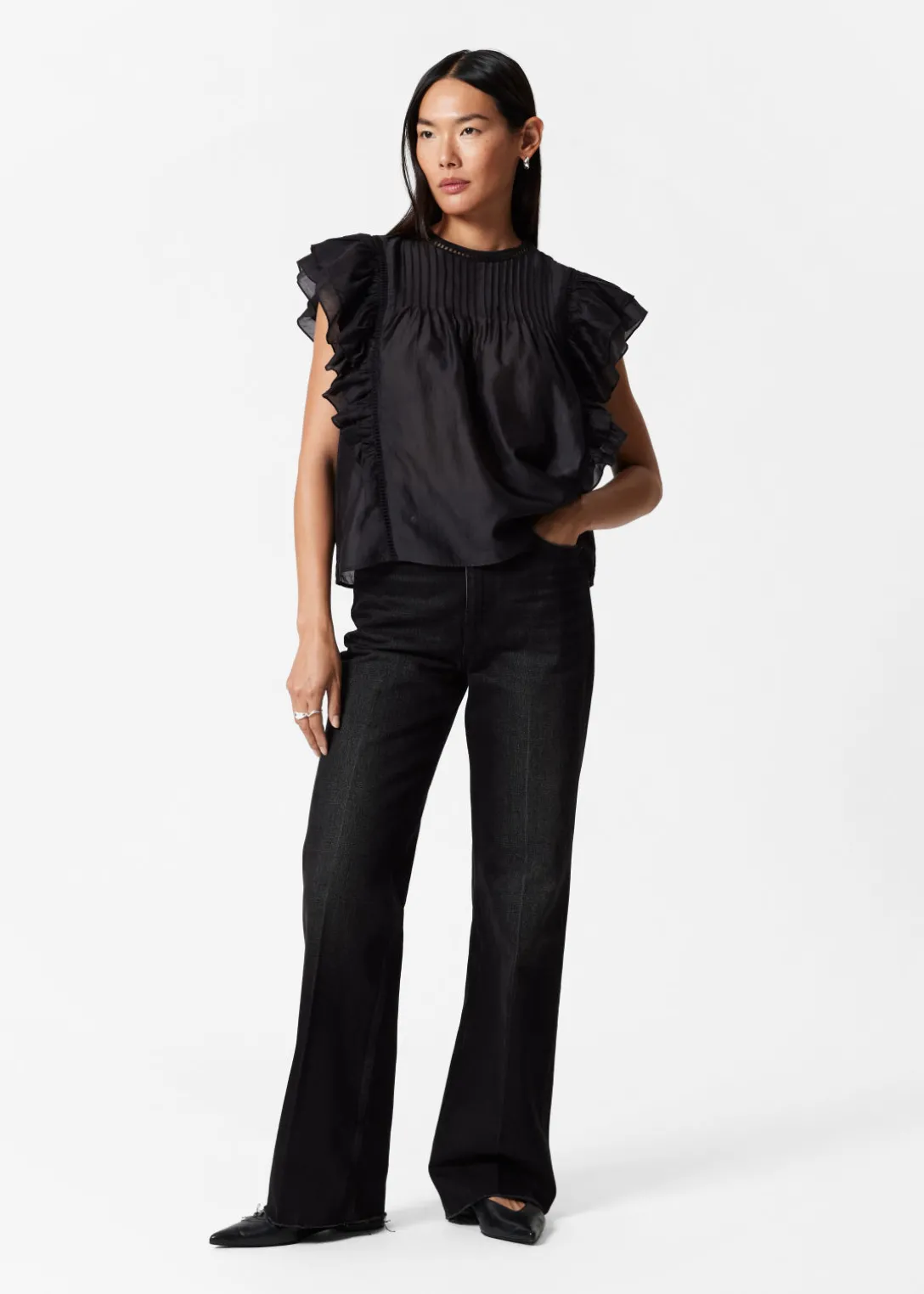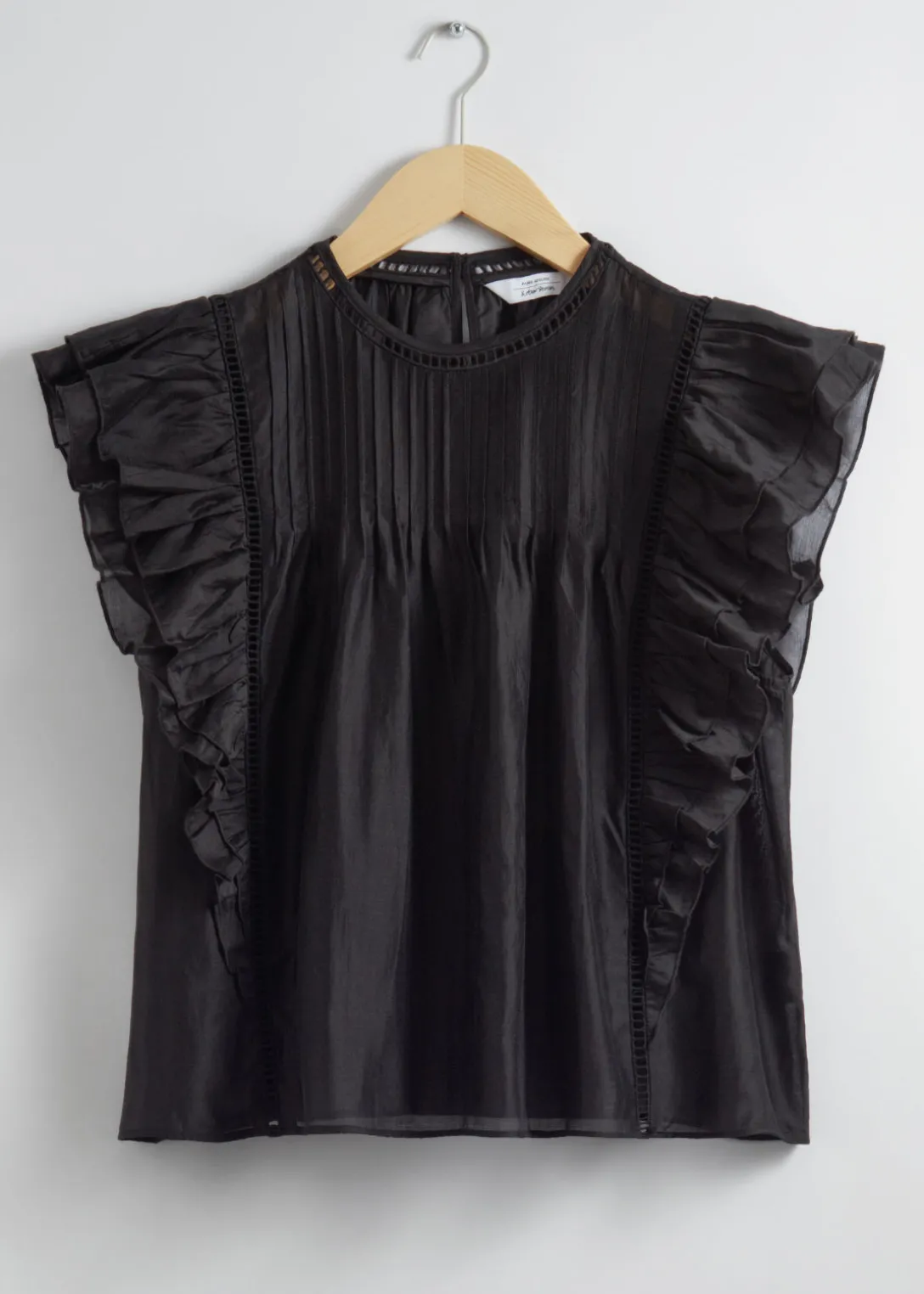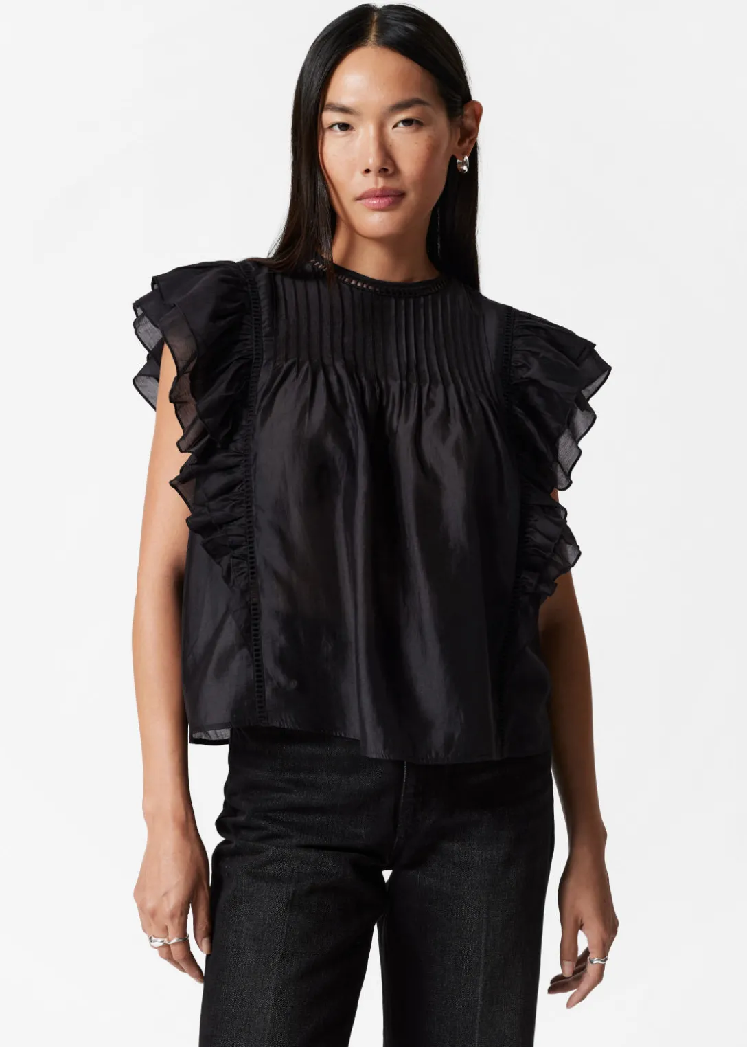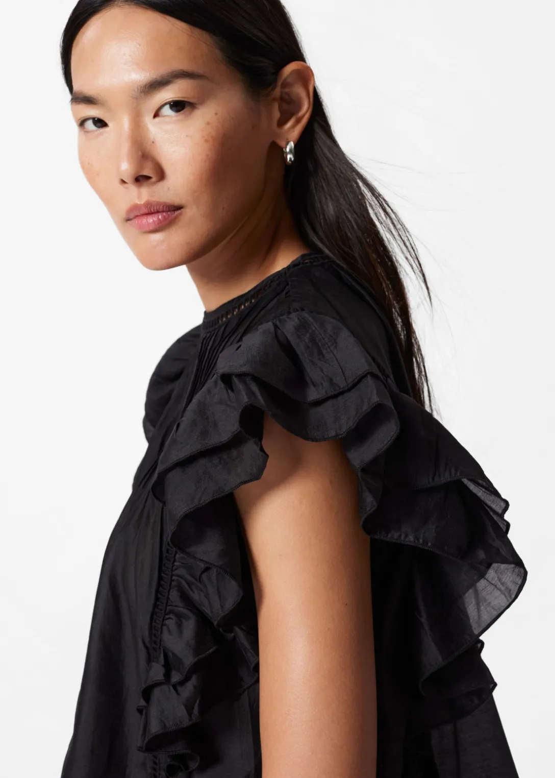 Haut avec des volants superposés sur les épaules et les côtés. Doté d’un empiècement plissé sur la poitrine.