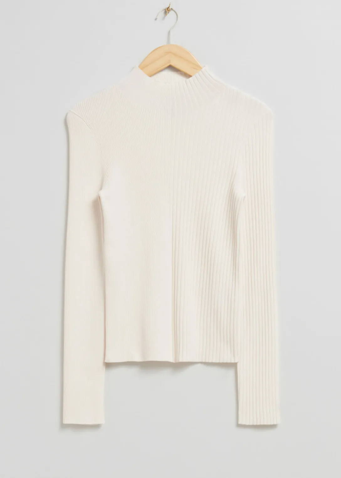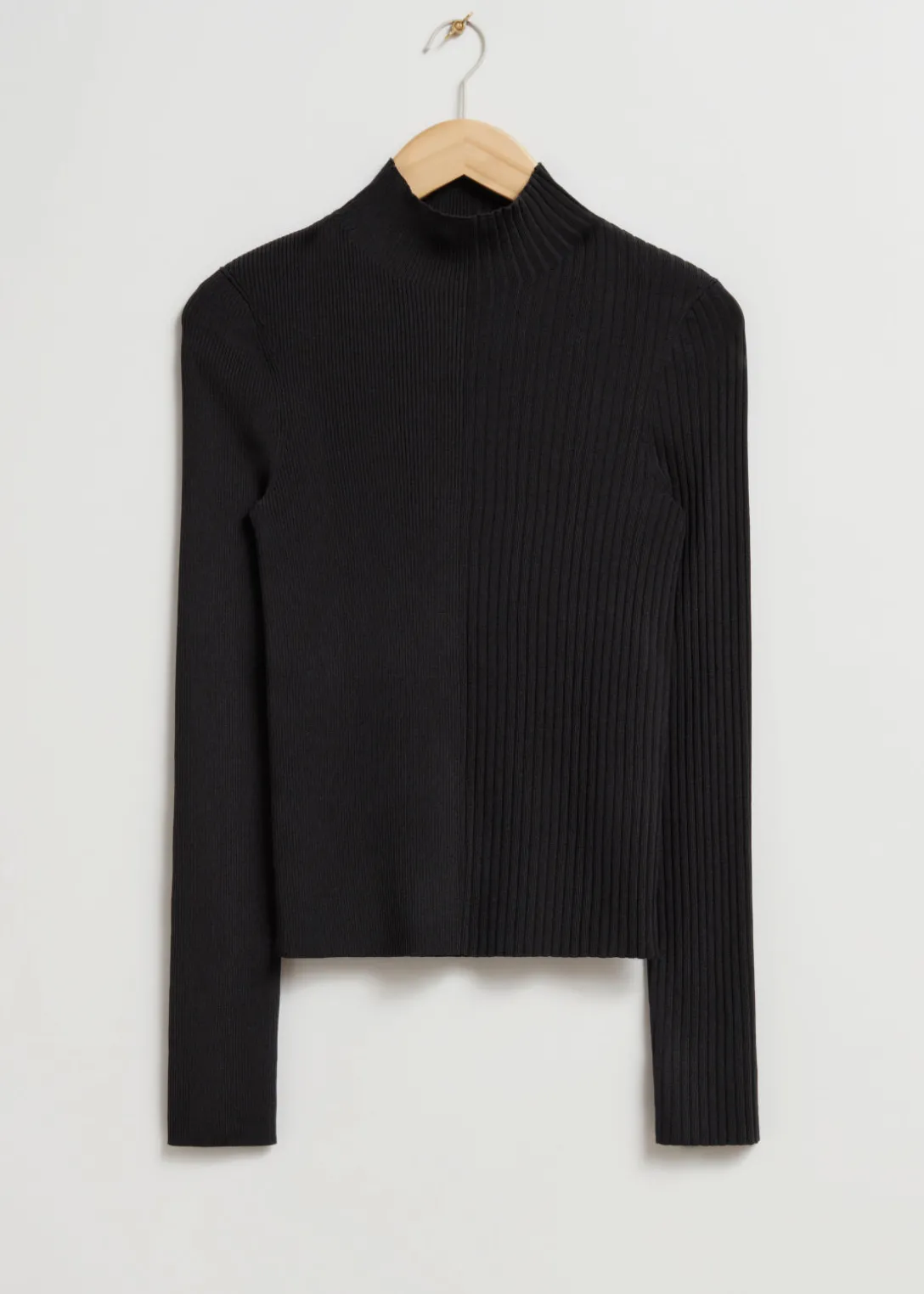 Haut en maille à col montant, avec des finitions contrastées à l’avant : côtelées d’un côté et simples de l’autre.