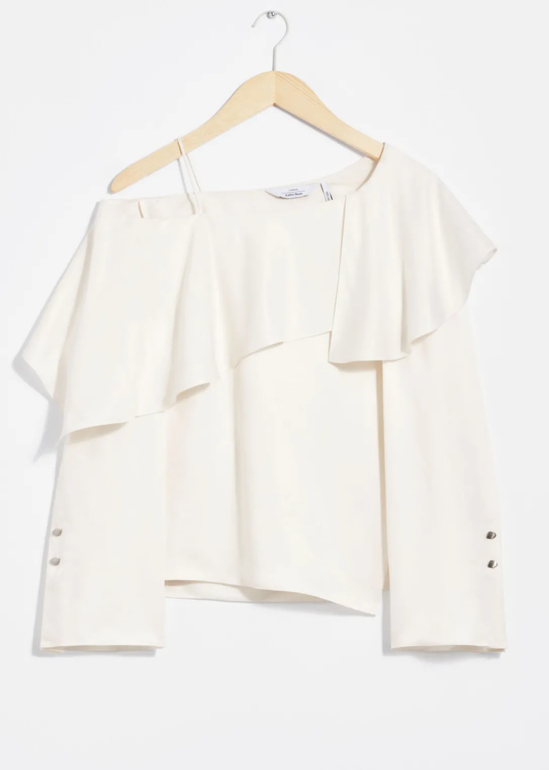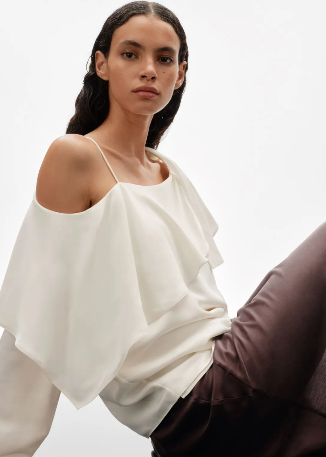 Blouse en soie, avec des manches longues et une large encolure repliée. Dotée d’une finition croisée devant et d’un ourlet asymétrique.