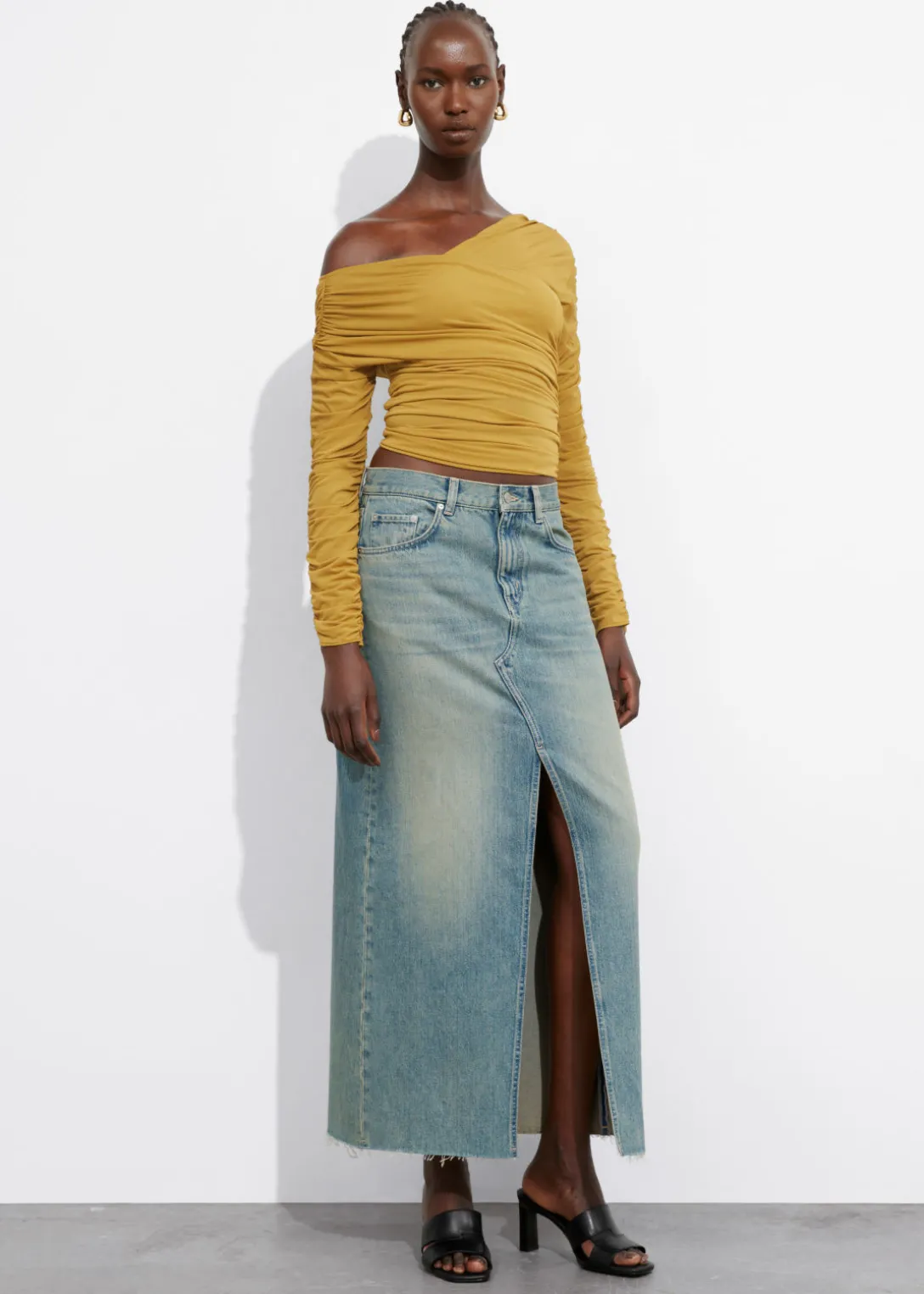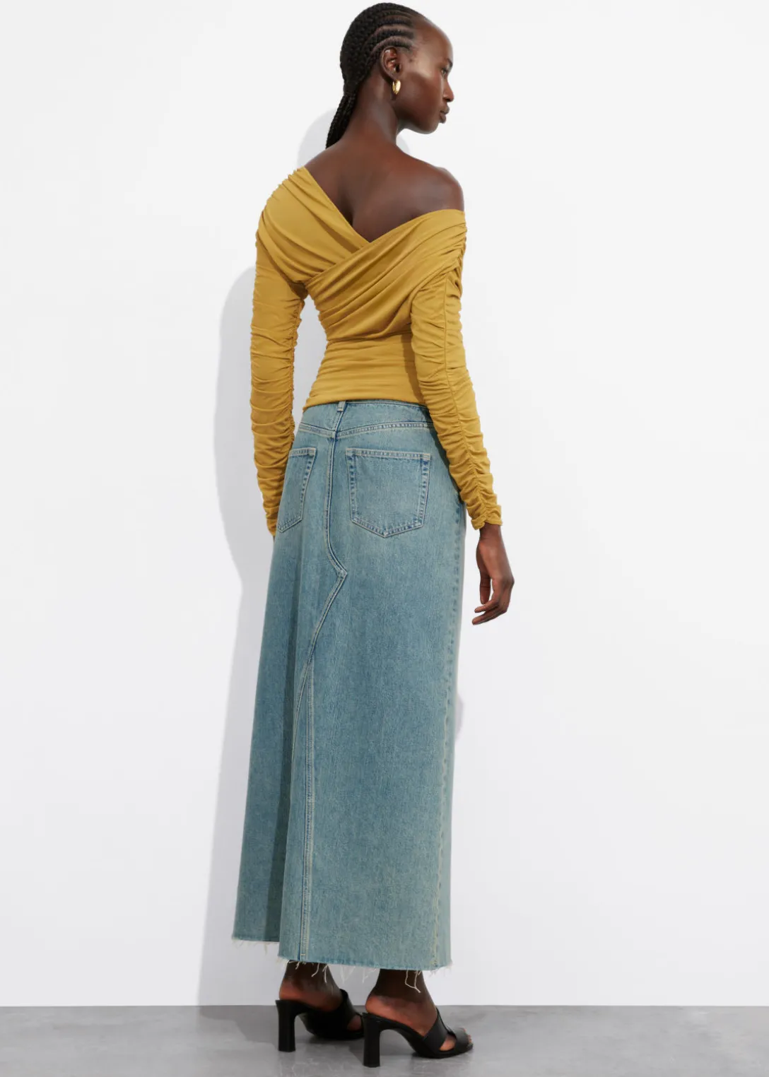 Haut asymétrique avec des manches longues et une finition drapée sur l’ensemble.