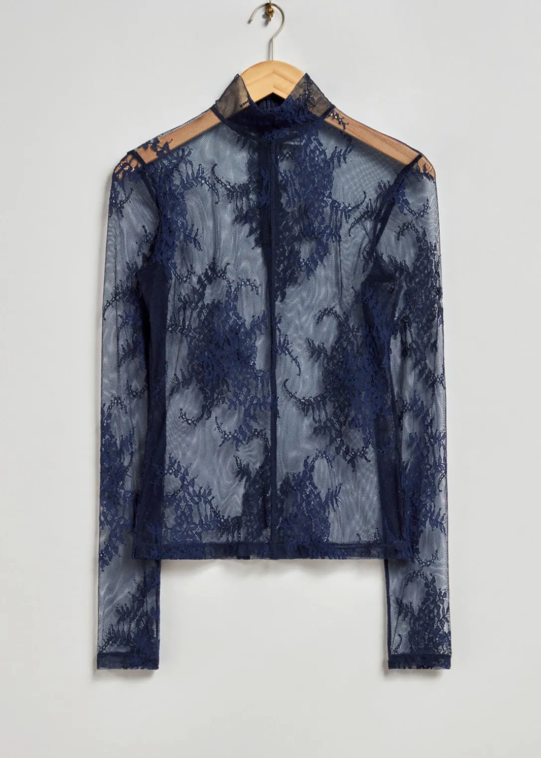 Ce haut ajusté à col montant est confectionné en dentelle délicate transparente avec une fermeture zippée au niveau de la nuque